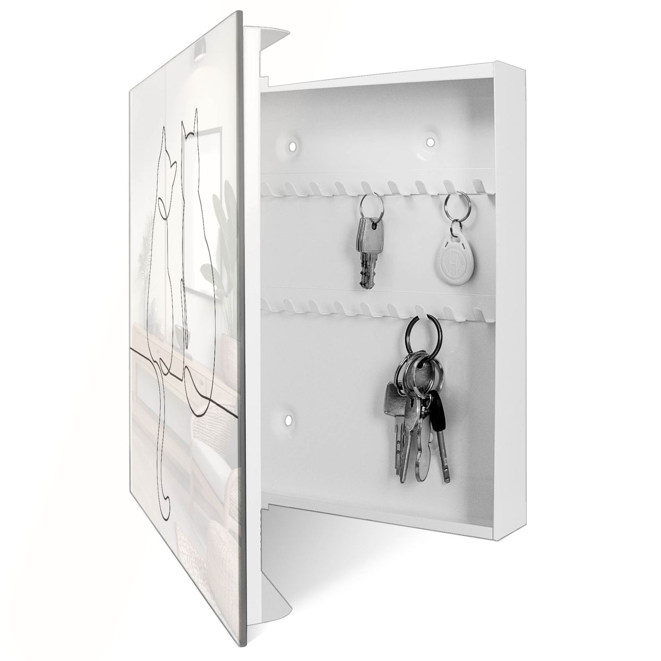 Bringe Ordnung und Eleganz in deinen Eingangsbereich mit dem banjado Schlüsselkasten Motiv Motiv Katzenliebe 2. Die moderne Schlüsselbox kombiniert funktionales Design mit hochwertiger Verarbeitung und wird so zu einem echten Hingucker in Flur, Büro oder Ferienwohnung. ✅ Stilvolle Schlüsselaufbewahrung mit Glasfront im Motiv Motiv Katzenliebe 2 Der Design-Schlüsselkasten Motiv Motiv Katzenliebe 2 bietet Platz für bis zu 50 Schlüssel, die auf 5 stabilen Reihen mit je 10 Haken übersichtlich verstaut werden. Mit seinen kompakten Maßen von 30 x 30 x 5 cm passt die Schlüsselbox perfekt auch in kleinere Räume. Der weiß lackierte Stahlkorpus mit rechts angeschlagenem Türscharnier harmoniert mit der Glasfront und fügt sich nahtlos in jedes Wohnambiente ein. Ob als Schlüsselorganizer für Zuhause oder als praktische Lösung für Büros, Praxen und Gewerbe, der banjado Schlüsselkasten sorgt für Ordnung und Übersicht. Dank der magnetischen, mit Kreidestiften beschreibbaren Glasfront kannst du Notizen anheften oder Termine direkt auf der Oberfläche festhalten. Die Schlüsselbox Motiv Motiv Katzenliebe 2 zur Wandmontage wird inklusive Befestigungsmaterial geliefert und ist schnell angebracht. So hast du deine Schlüssel jederzeit griffbereit und zugleich stilvoll verstaut. Mit diesem banjado Schlüsselkasten Motiv Motiv Katzenliebe 2 kombinierst du praktische Aufbewahrung mit stilvollem Wohndesign. Ob privat oder geschäftlich, die Schlüsselbox sorgt für mehr Ordnung, Übersicht und ein wohnliches Ambiente.Vorteile im Überblick