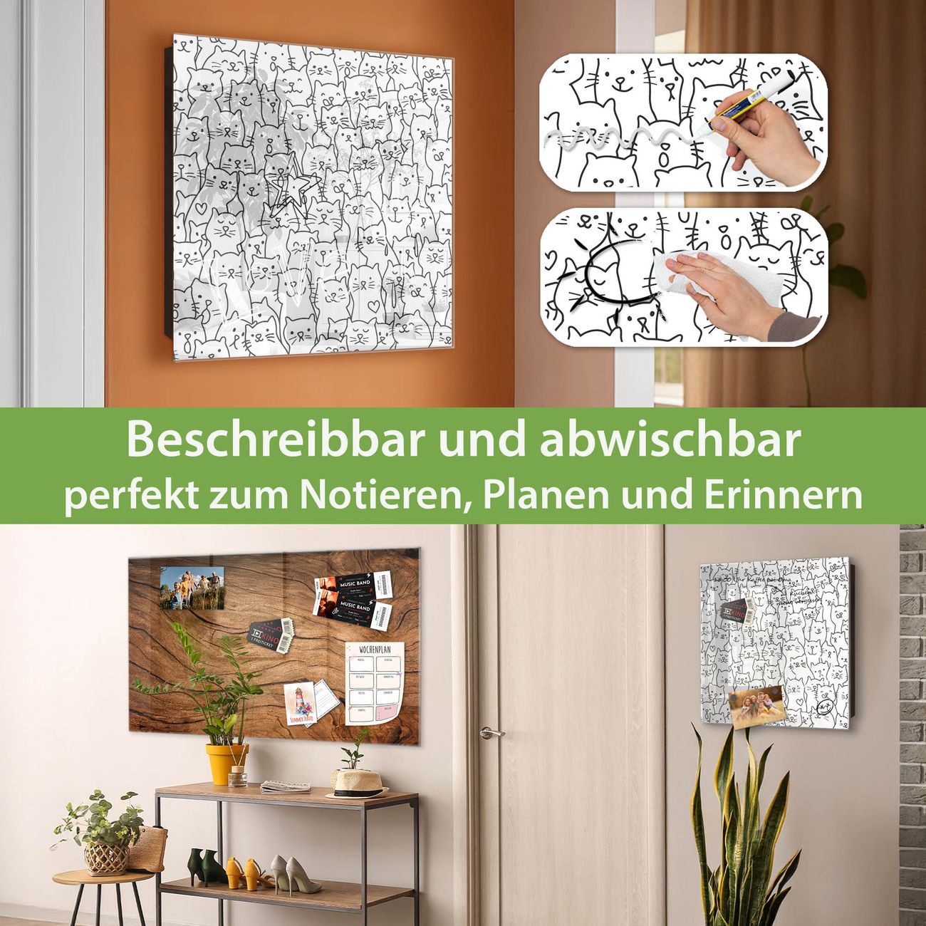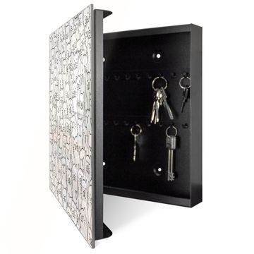 Bringe Ordnung und Eleganz in deinen Eingangsbereich mit dem banjado Schlüsselkasten Motiv Motiv Katzenparade. Die moderne Schlüsselbox kombiniert funktionales Design mit hochwertiger Verarbeitung und wird so zu einem echten Hingucker in Flur, Büro oder Ferienwohnung. ✅ Stilvolle Schlüsselaufbewahrung mit Glasfront im Motiv Motiv Katzenparade Der Design-Schlüsselkasten Motiv Motiv Katzenparade bietet Platz für bis zu 50 Schlüssel, die auf 5 stabilen Reihen mit je 10 Haken übersichtlich verstaut werden. Mit seinen kompakten Maßen von 30 x 30 x 5 cm passt die Schlüsselbox perfekt auch in kleinere Räume. Der schwarz lackierte Stahlkorpus mit rechts angeschlagenem Türscharnier harmoniert mit der Glasfront und fügt sich nahtlos in jedes Wohnambiente ein. Ob als Schlüsselorganizer für Zuhause oder als praktische Lösung für Büros, Praxen und Gewerbe, der banjado Schlüsselkasten sorgt für Ordnung und Übersicht. Dank der magnetischen, mit Kreidestiften beschreibbaren Glasfront kannst du Notizen anheften oder Termine direkt auf der Oberfläche festhalten. Die Schlüsselbox Motiv Motiv Katzenparade zur Wandmontage wird inklusive Befestigungsmaterial geliefert und ist schnell angebracht. So hast du deine Schlüssel jederzeit griffbereit und zugleich stilvoll verstaut. Mit diesem banjado Schlüsselkasten Motiv Motiv Katzenparade kombinierst du praktische Aufbewahrung mit stilvollem Wohndesign. Ob privat oder geschäftlich, die Schlüsselbox sorgt für mehr Ordnung, Übersicht und ein wohnliches Ambiente.Vorteile im Überblick