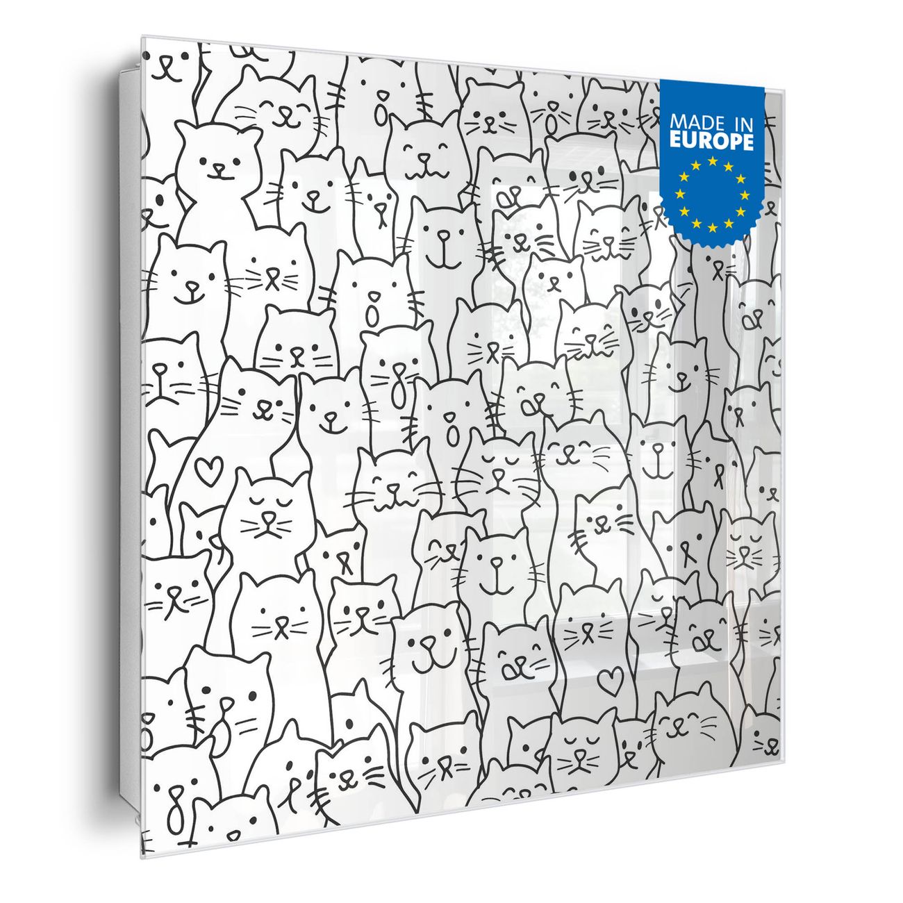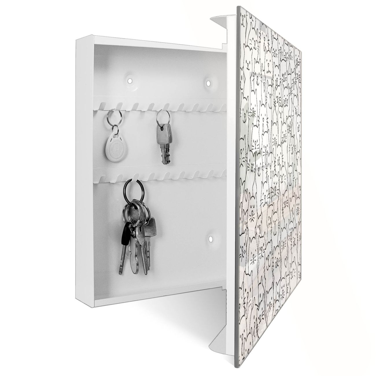 Bringe Ordnung und Eleganz in deinen Eingangsbereich mit dem banjado Schlüsselkasten Motiv Motiv Katzenparade. Die moderne Schlüsselbox kombiniert funktionales Design mit hochwertiger Verarbeitung und wird so zu einem echten Hingucker in Flur, Büro oder Ferienwohnung. ✅ Stilvolle Schlüsselaufbewahrung mit Glasfront im Motiv Motiv Katzenparade Der Design-Schlüsselkasten Motiv Motiv Katzenparade bietet Platz für bis zu 50 Schlüssel, die auf 5 stabilen Reihen mit je 10 Haken übersichtlich verstaut werden. Mit seinen kompakten Maßen von 30 x 30 x 5 cm passt die Schlüsselbox perfekt auch in kleinere Räume. Der weiß lackierte Stahlkorpus mit rechts angeschlagenem Türscharnier harmoniert mit der Glasfront und fügt sich nahtlos in jedes Wohnambiente ein. Ob als Schlüsselorganizer für Zuhause oder als praktische Lösung für Büros, Praxen und Gewerbe, der banjado Schlüsselkasten sorgt für Ordnung und Übersicht. Dank der magnetischen, mit Kreidestiften beschreibbaren Glasfront kannst du Notizen anheften oder Termine direkt auf der Oberfläche festhalten. Die Schlüsselbox Motiv Motiv Katzenparade zur Wandmontage wird inklusive Befestigungsmaterial geliefert und ist schnell angebracht. So hast du deine Schlüssel jederzeit griffbereit und zugleich stilvoll verstaut. Mit diesem banjado Schlüsselkasten Motiv Motiv Katzenparade kombinierst du praktische Aufbewahrung mit stilvollem Wohndesign. Ob privat oder geschäftlich, die Schlüsselbox sorgt für mehr Ordnung, Übersicht und ein wohnliches Ambiente.Vorteile im Überblick