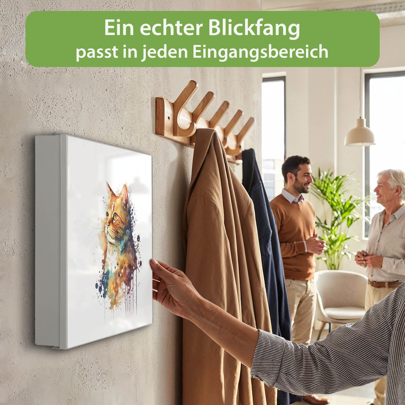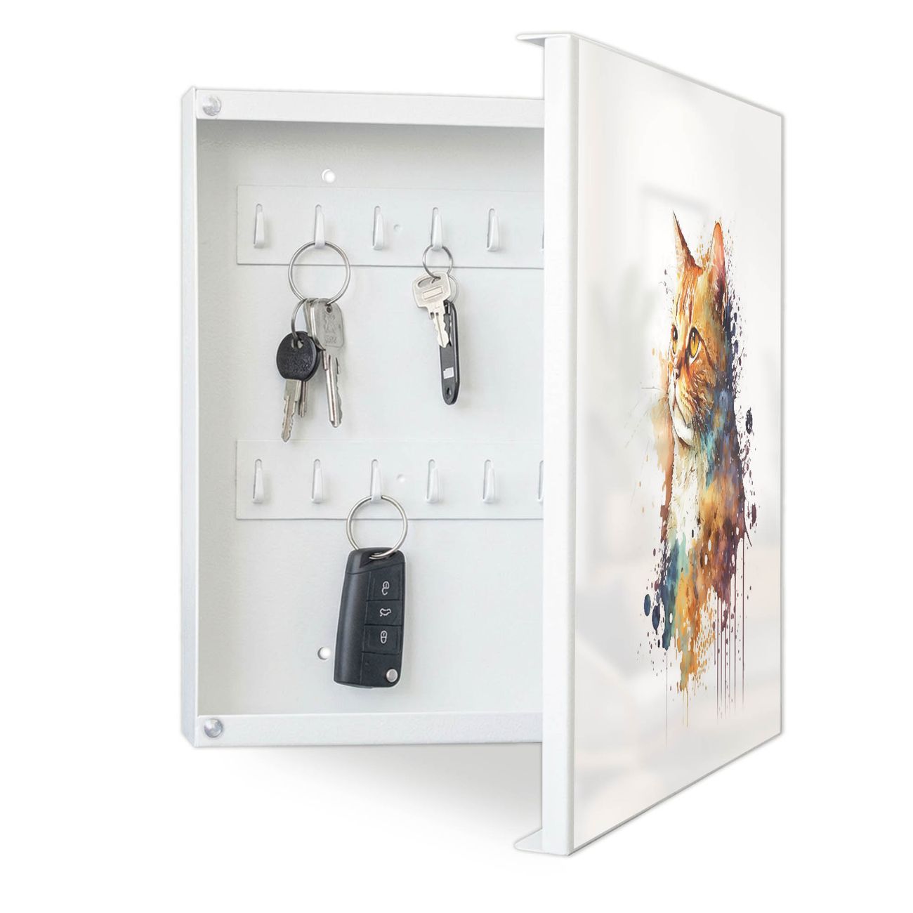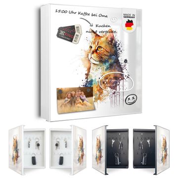 Bringe Ordnung und Eleganz in deinen Eingangsbereich mit dem banjado Schlüsselkasten Motiv Motiv Katzenportrait in Aquarell 1. Die moderne Schlüsselbox kombiniert funktionales Design mit hochwertiger Verarbeitung und wird so zu einem echten Hingucker in Flur, Büro oder Ferienwohnung. ✅ Stilvolle Schlüsselaufbewahrung mit Motiv Motiv Katzenportrait in Aquarell 1 Der Design-Schlüsselkasten Motiv Motiv Katzenportrait in Aquarell 1 bietet Platz für bis zu 32 Schlüssel, die auf 4 stabilen Reihen mit je 8 Haken übersichtlich verstaut werden. Mit seinen kompakten Maßen von 30 x 30 x 5 cm passt die Schlüsselbox perfekt auch in kleinere Räume. Der weiß lackierte Stahlkorpus mit rechts angeschlagenem Türscharnier harmoniert mit gedruckten Folie auf der Front und fügt sich nahtlos in jedes Wohnambiente ein. Ob als Schlüsselorganizer für Zuhause oder als praktische Lösung für Büros, Praxen und Gewerbe, der banjado Schlüsselkasten sorgt für Ordnung und Übersicht. Dank der magnetischen, mit Kreidestiften beschreibbaren Folie auf der Front kannst du Notizen anheften oder Termine direkt auf der Oberfläche festhalten. Die Schlüsselbox Motiv Motiv Katzenportrait in Aquarell 1 zur Wandmontage wird inklusive Befestigungsmaterial geliefert und ist schnell angebracht. So hast du deine Schlüssel jederzeit griffbereit und zugleich stilvoll verstaut. Mit diesem banjado Schlüsselkasten Motiv Motiv Katzenportrait in Aquarell 1 kombinierst du praktische Aufbewahrung mit stilvollem Wohndesign. Ob privat oder geschäftlich, die Schlüsselbox sorgt für mehr Ordnung, Übersicht und ein wohnliches Ambiente.Vorteile im Überblick