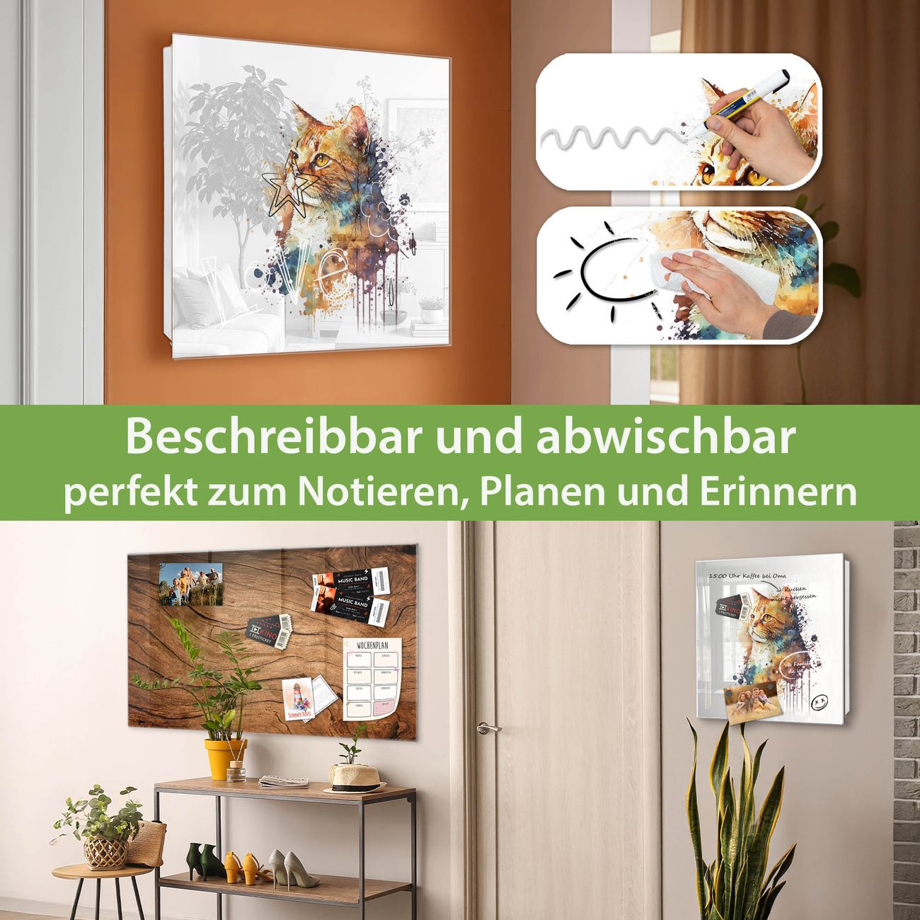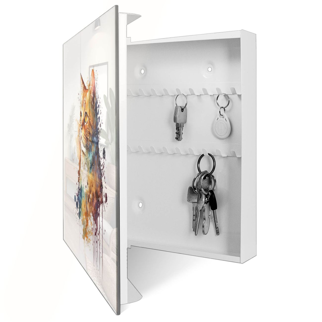 Bringe Ordnung und Eleganz in deinen Eingangsbereich mit dem banjado Schlüsselkasten Motiv Motiv Katzenportrait in Aquarell. Die moderne Schlüsselbox kombiniert funktionales Design mit hochwertiger Verarbeitung und wird so zu einem echten Hingucker in Flur, Büro oder Ferienwohnung. ✅ Stilvolle Schlüsselaufbewahrung mit Glasfront im Motiv Motiv Katzenportrait in Aquarell Der Design-Schlüsselkasten Motiv Motiv Katzenportrait in Aquarell bietet Platz für bis zu 50 Schlüssel, die auf 5 stabilen Reihen mit je 10 Haken übersichtlich verstaut werden. Mit seinen kompakten Maßen von 30 x 30 x 5 cm passt die Schlüsselbox perfekt auch in kleinere Räume. Der weiß lackierte Stahlkorpus mit rechts angeschlagenem Türscharnier harmoniert mit der Glasfront und fügt sich nahtlos in jedes Wohnambiente ein. Ob als Schlüsselorganizer für Zuhause oder als praktische Lösung für Büros, Praxen und Gewerbe, der banjado Schlüsselkasten sorgt für Ordnung und Übersicht. Dank der magnetischen, mit Kreidestiften beschreibbaren Glasfront kannst du Notizen anheften oder Termine direkt auf der Oberfläche festhalten. Die Schlüsselbox Motiv Motiv Katzenportrait in Aquarell zur Wandmontage wird inklusive Befestigungsmaterial geliefert und ist schnell angebracht. So hast du deine Schlüssel jederzeit griffbereit und zugleich stilvoll verstaut. Mit diesem banjado Schlüsselkasten Motiv Motiv Katzenportrait in Aquarell kombinierst du praktische Aufbewahrung mit stilvollem Wohndesign. Ob privat oder geschäftlich, die Schlüsselbox sorgt für mehr Ordnung, Übersicht und ein wohnliches Ambiente.Vorteile im Überblick