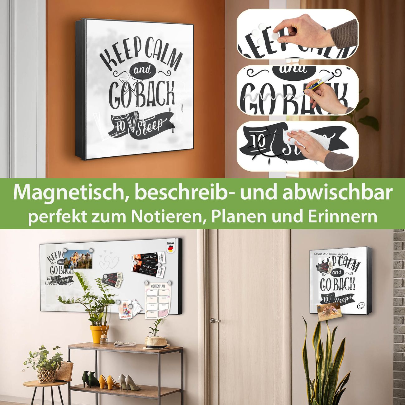 Bringe Ordnung und Eleganz in deinen Eingangsbereich mit dem banjado Schlüsselkasten Motiv Motiv Keep Calm Schriftzug. Die moderne Schlüsselbox kombiniert funktionales Design mit hochwertiger Verarbeitung und wird so zu einem echten Hingucker in Flur, Büro oder Ferienwohnung. ✅ Stilvolle Schlüsselaufbewahrung mit Motiv Motiv Keep Calm Schriftzug Der Design-Schlüsselkasten Motiv Motiv Keep Calm Schriftzug bietet Platz für bis zu 32 Schlüssel, die auf 4 stabilen Reihen mit je 8 Haken übersichtlich verstaut werden. Mit seinen kompakten Maßen von 30 x 30 x 5 cm passt die Schlüsselbox perfekt auch in kleinere Räume. Der schwarz lackierte Stahlkorpus mit rechts angeschlagenem Türscharnier harmoniert mit gedruckten Folie auf der Front und fügt sich nahtlos in jedes Wohnambiente ein. Ob als Schlüsselorganizer für Zuhause oder als praktische Lösung für Büros, Praxen und Gewerbe, der banjado Schlüsselkasten sorgt für Ordnung und Übersicht. Dank der magnetischen, mit Kreidestiften beschreibbaren Folie auf der Front kannst du Notizen anheften oder Termine direkt auf der Oberfläche festhalten. Die Schlüsselbox Motiv Motiv Keep Calm Schriftzug zur Wandmontage wird inklusive Befestigungsmaterial geliefert und ist schnell angebracht. So hast du deine Schlüssel jederzeit griffbereit und zugleich stilvoll verstaut. Mit diesem banjado Schlüsselkasten Motiv Motiv Keep Calm Schriftzug kombinierst du praktische Aufbewahrung mit stilvollem Wohndesign. Ob privat oder geschäftlich, die Schlüsselbox sorgt für mehr Ordnung, Übersicht und ein wohnliches Ambiente.Vorteile im Überblick