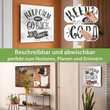 Bringe Ordnung und Eleganz in deinen Eingangsbereich mit dem banjado Schlüsselkasten Motiv Motiv Keep Calm Schriftzug. Die moderne Schlüsselbox kombiniert funktionales Design mit hochwertiger Verarbeitung und wird so zu einem echten Hingucker in Flur, Büro oder Ferienwohnung. ✅ Stilvolle Schlüsselaufbewahrung mit Glasfront im Motiv Motiv Keep Calm Schriftzug Der Design-Schlüsselkasten Motiv Motiv Keep Calm Schriftzug bietet Platz für bis zu 50 Schlüssel, die auf 5 stabilen Reihen mit je 10 Haken übersichtlich verstaut werden. Mit seinen kompakten Maßen von 30 x 30 x 5 cm passt die Schlüsselbox perfekt auch in kleinere Räume. Der schwarz lackierte Stahlkorpus mit rechts angeschlagenem Türscharnier harmoniert mit der Glasfront und fügt sich nahtlos in jedes Wohnambiente ein. Ob als Schlüsselorganizer für Zuhause oder als praktische Lösung für Büros, Praxen und Gewerbe, der banjado Schlüsselkasten sorgt für Ordnung und Übersicht. Dank der magnetischen, mit Kreidestiften beschreibbaren Glasfront kannst du Notizen anheften oder Termine direkt auf der Oberfläche festhalten. Die Schlüsselbox Motiv Motiv Keep Calm Schriftzug zur Wandmontage wird inklusive Befestigungsmaterial geliefert und ist schnell angebracht. So hast du deine Schlüssel jederzeit griffbereit und zugleich stilvoll verstaut. Mit diesem banjado Schlüsselkasten Motiv Motiv Keep Calm Schriftzug kombinierst du praktische Aufbewahrung mit stilvollem Wohndesign. Ob privat oder geschäftlich, die Schlüsselbox sorgt für mehr Ordnung, Übersicht und ein wohnliches Ambiente.Vorteile im Überblick