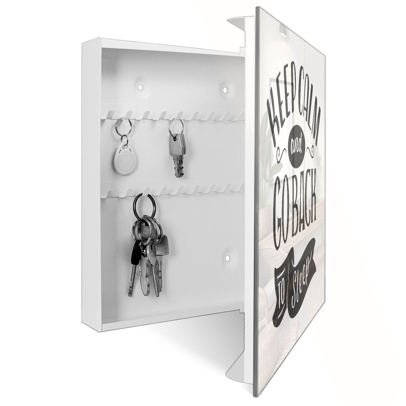 Bringe Ordnung und Eleganz in deinen Eingangsbereich mit dem banjado Schlüsselkasten Motiv Motiv Keep Calm Schriftzug. Die moderne Schlüsselbox kombiniert funktionales Design mit hochwertiger Verarbeitung und wird so zu einem echten Hingucker in Flur, Büro oder Ferienwohnung. ✅ Stilvolle Schlüsselaufbewahrung mit Glasfront im Motiv Motiv Keep Calm Schriftzug Der Design-Schlüsselkasten Motiv Motiv Keep Calm Schriftzug bietet Platz für bis zu 50 Schlüssel, die auf 5 stabilen Reihen mit je 10 Haken übersichtlich verstaut werden. Mit seinen kompakten Maßen von 30 x 30 x 5 cm passt die Schlüsselbox perfekt auch in kleinere Räume. Der weiß lackierte Stahlkorpus mit rechts angeschlagenem Türscharnier harmoniert mit der Glasfront und fügt sich nahtlos in jedes Wohnambiente ein. Ob als Schlüsselorganizer für Zuhause oder als praktische Lösung für Büros, Praxen und Gewerbe, der banjado Schlüsselkasten sorgt für Ordnung und Übersicht. Dank der magnetischen, mit Kreidestiften beschreibbaren Glasfront kannst du Notizen anheften oder Termine direkt auf der Oberfläche festhalten. Die Schlüsselbox Motiv Motiv Keep Calm Schriftzug zur Wandmontage wird inklusive Befestigungsmaterial geliefert und ist schnell angebracht. So hast du deine Schlüssel jederzeit griffbereit und zugleich stilvoll verstaut. Mit diesem banjado Schlüsselkasten Motiv Motiv Keep Calm Schriftzug kombinierst du praktische Aufbewahrung mit stilvollem Wohndesign. Ob privat oder geschäftlich, die Schlüsselbox sorgt für mehr Ordnung, Übersicht und ein wohnliches Ambiente.Vorteile im Überblick