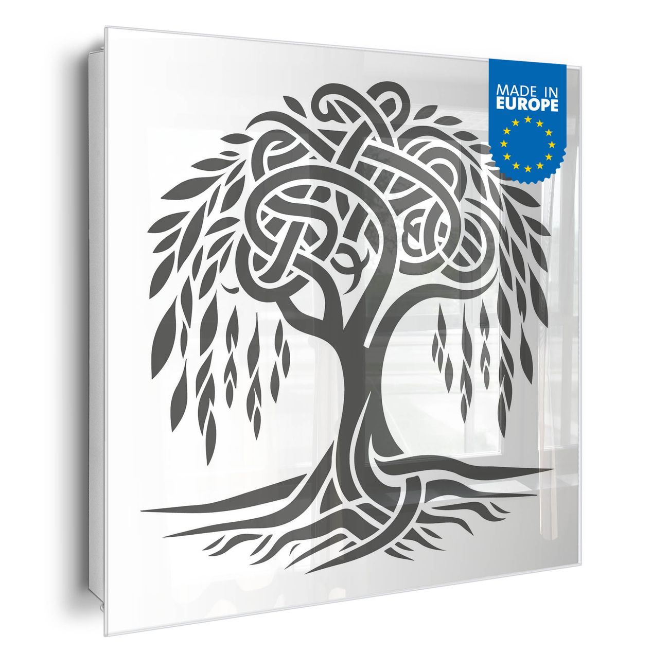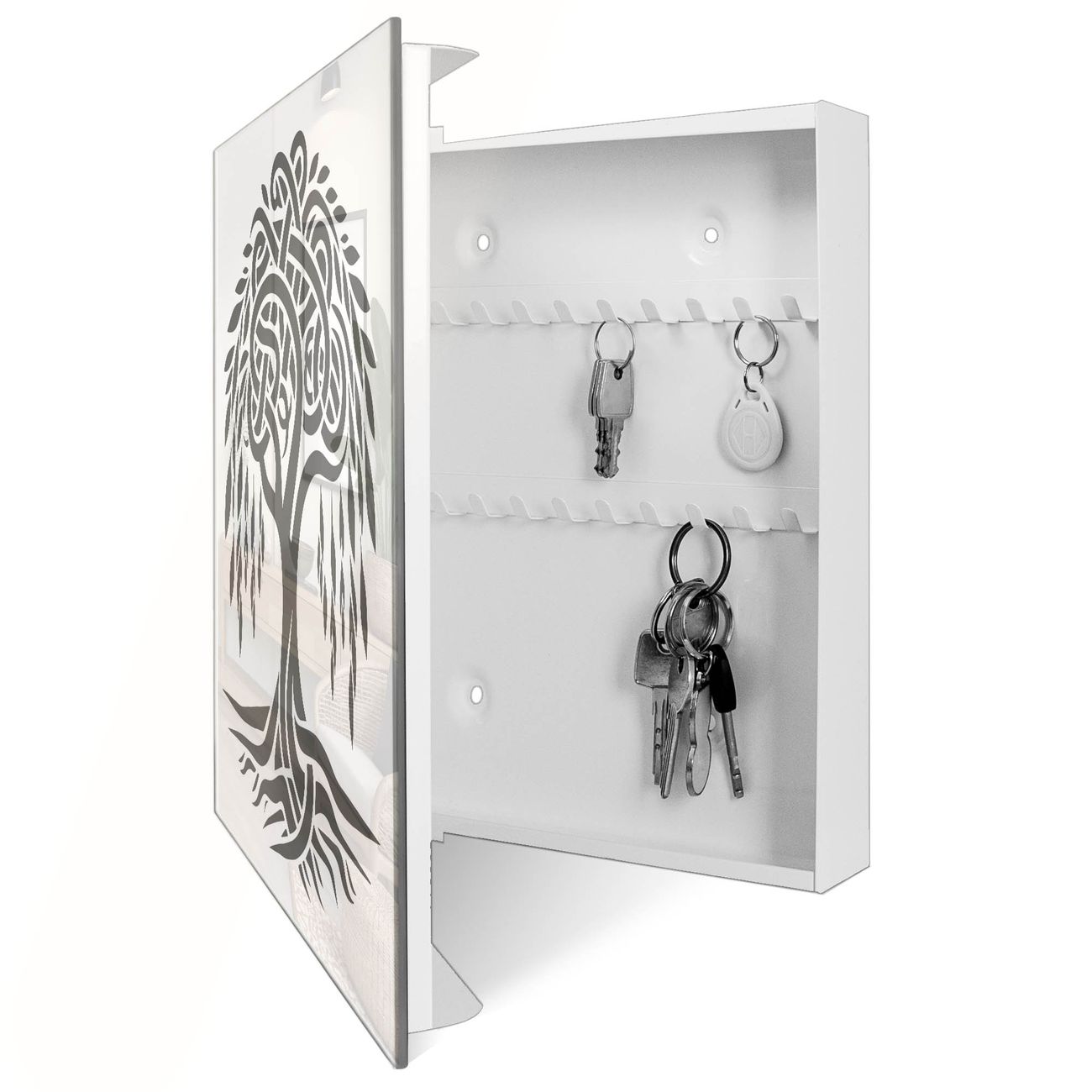 Bringe Ordnung und Eleganz in deinen Eingangsbereich mit dem banjado Schlüsselkasten Motiv Motiv Keltischer Baum des Lebens. Die moderne Schlüsselbox kombiniert funktionales Design mit hochwertiger Verarbeitung und wird so zu einem echten Hingucker in Flur, Büro oder Ferienwohnung. ✅ Stilvolle Schlüsselaufbewahrung mit Glasfront im Motiv Motiv Keltischer Baum des Lebens Der Design-Schlüsselkasten Motiv Motiv Keltischer Baum des Lebens bietet Platz für bis zu 50 Schlüssel, die auf 5 stabilen Reihen mit je 10 Haken übersichtlich verstaut werden. Mit seinen kompakten Maßen von 30 x 30 x 5 cm passt die Schlüsselbox perfekt auch in kleinere Räume. Der weiß lackierte Stahlkorpus mit rechts angeschlagenem Türscharnier harmoniert mit der Glasfront und fügt sich nahtlos in jedes Wohnambiente ein. Ob als Schlüsselorganizer für Zuhause oder als praktische Lösung für Büros, Praxen und Gewerbe, der banjado Schlüsselkasten sorgt für Ordnung und Übersicht. Dank der magnetischen, mit Kreidestiften beschreibbaren Glasfront kannst du Notizen anheften oder Termine direkt auf der Oberfläche festhalten. Die Schlüsselbox Motiv Motiv Keltischer Baum des Lebens zur Wandmontage wird inklusive Befestigungsmaterial geliefert und ist schnell angebracht. So hast du deine Schlüssel jederzeit griffbereit und zugleich stilvoll verstaut. Mit diesem banjado Schlüsselkasten Motiv Motiv Keltischer Baum des Lebens kombinierst du praktische Aufbewahrung mit stilvollem Wohndesign. Ob privat oder geschäftlich, die Schlüsselbox sorgt für mehr Ordnung, Übersicht und ein wohnliches Ambiente.Vorteile im Überblick