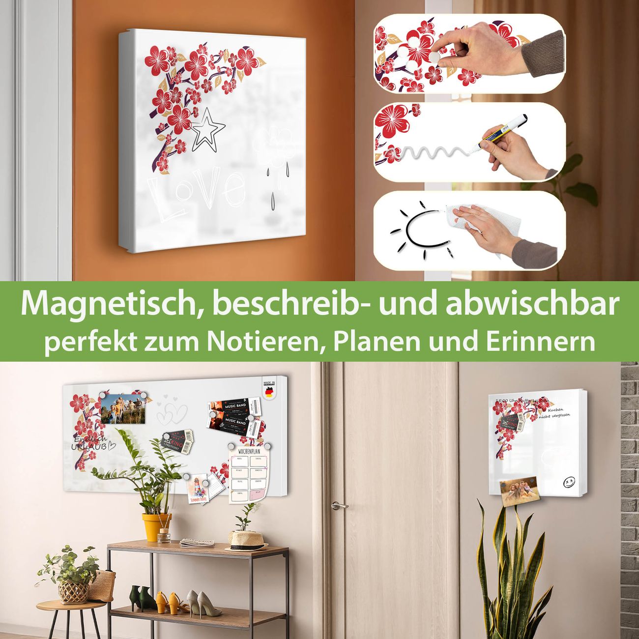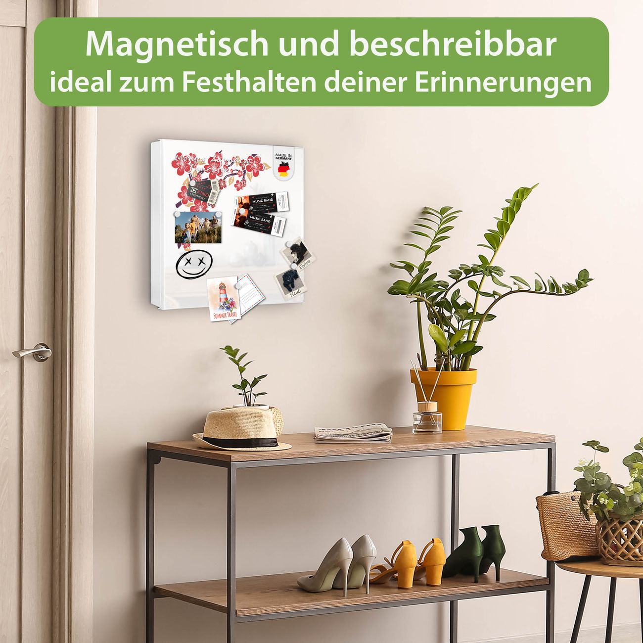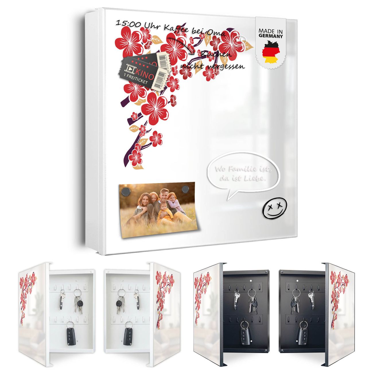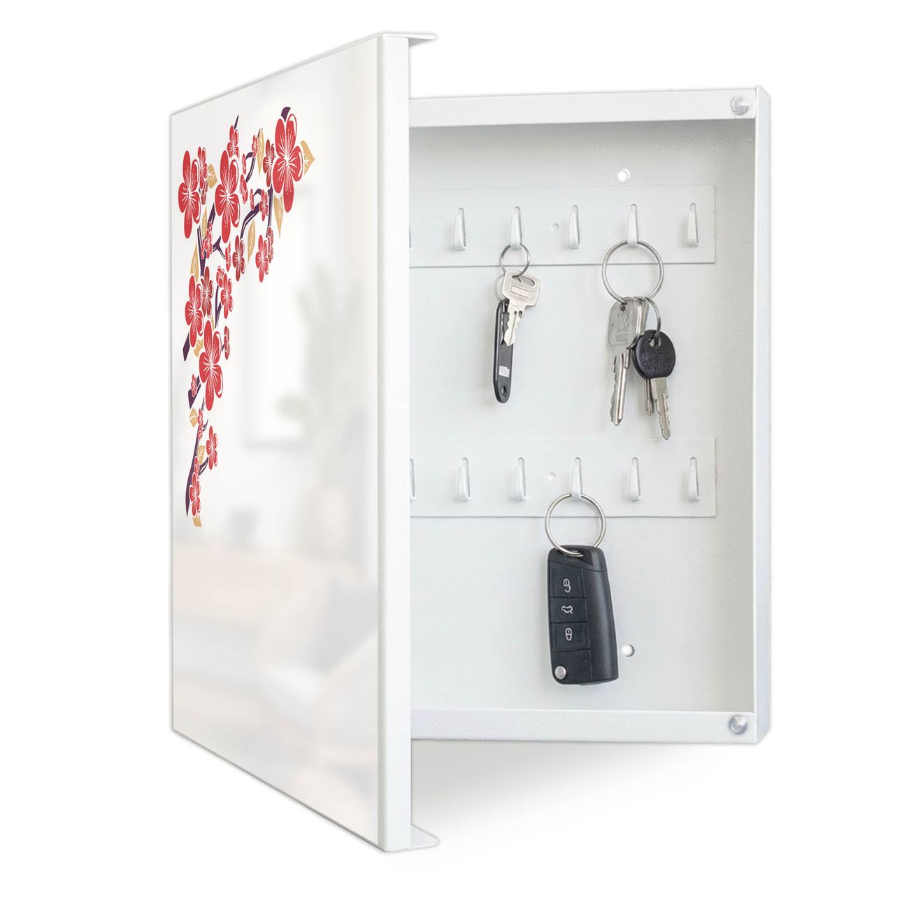 Bringe Ordnung und Eleganz in deinen Eingangsbereich mit dem banjado Schlüsselkasten Motiv Motiv Kirschblütenmuster. Die moderne Schlüsselbox kombiniert funktionales Design mit hochwertiger Verarbeitung und wird so zu einem echten Hingucker in Flur, Büro oder Ferienwohnung. ✅ Stilvolle Schlüsselaufbewahrung mit Motiv Motiv Kirschblütenmuster Der Design-Schlüsselkasten Motiv Motiv Kirschblütenmuster bietet Platz für bis zu 32 Schlüssel, die auf 4 stabilen Reihen mit je 8 Haken übersichtlich verstaut werden. Mit seinen kompakten Maßen von 30 x 30 x 5 cm passt die Schlüsselbox perfekt auch in kleinere Räume. Der weiß lackierte Stahlkorpus mit links angeschlagenem Türscharnier harmoniert mit gedruckten Folie auf der Front und fügt sich nahtlos in jedes Wohnambiente ein. Ob als Schlüsselorganizer für Zuhause oder als praktische Lösung für Büros, Praxen und Gewerbe, der banjado Schlüsselkasten sorgt für Ordnung und Übersicht. Dank der magnetischen, mit Kreidestiften beschreibbaren Folie auf der Front kannst du Notizen anheften oder Termine direkt auf der Oberfläche festhalten. Die Schlüsselbox Motiv Motiv Kirschblütenmuster zur Wandmontage wird inklusive Befestigungsmaterial geliefert und ist schnell angebracht. So hast du deine Schlüssel jederzeit griffbereit und zugleich stilvoll verstaut. Mit diesem banjado Schlüsselkasten Motiv Motiv Kirschblütenmuster kombinierst du praktische Aufbewahrung mit stilvollem Wohndesign. Ob privat oder geschäftlich, die Schlüsselbox sorgt für mehr Ordnung, Übersicht und ein wohnliches Ambiente.Vorteile im Überblick