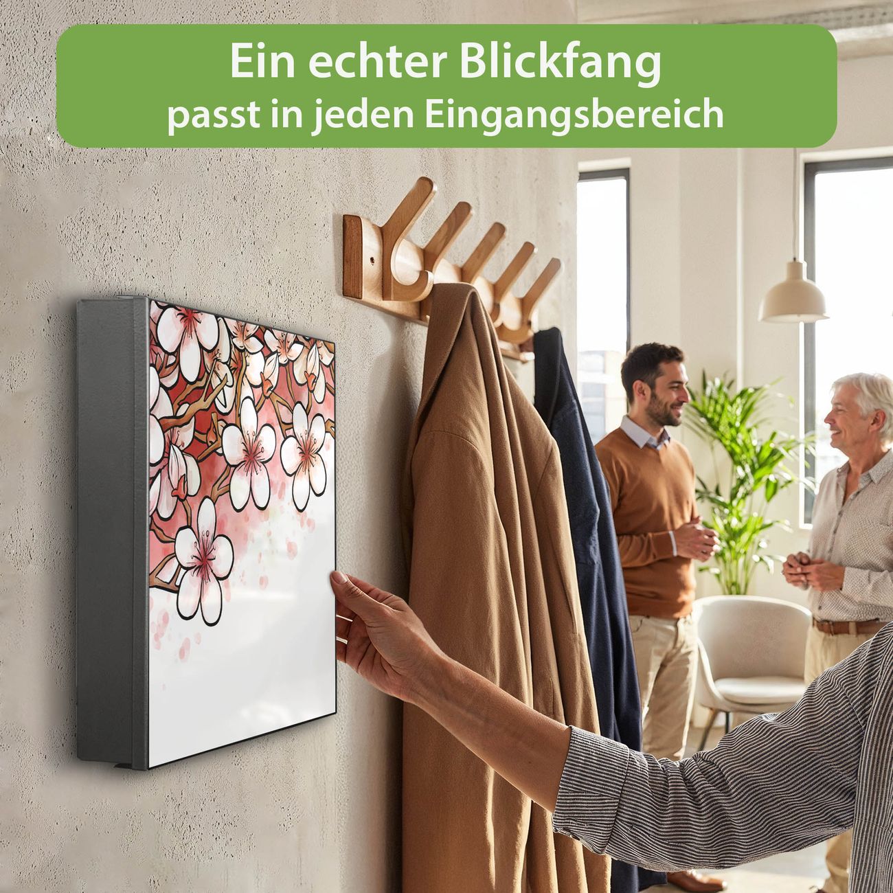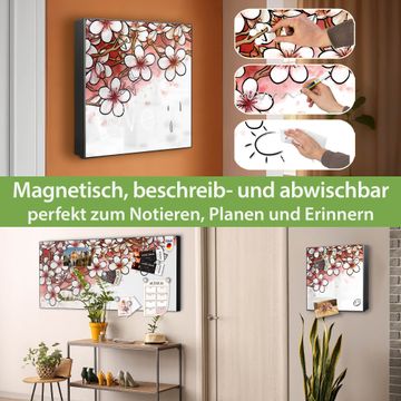 Bringe Ordnung und Eleganz in deinen Eingangsbereich mit dem banjado Schlüsselkasten Motiv Motiv Kirschblütentraum. Die moderne Schlüsselbox kombiniert funktionales Design mit hochwertiger Verarbeitung und wird so zu einem echten Hingucker in Flur, Büro oder Ferienwohnung. ✅ Stilvolle Schlüsselaufbewahrung mit Motiv Motiv Kirschblütentraum Der Design-Schlüsselkasten Motiv Motiv Kirschblütentraum bietet Platz für bis zu 32 Schlüssel, die auf 4 stabilen Reihen mit je 8 Haken übersichtlich verstaut werden. Mit seinen kompakten Maßen von 30 x 30 x 5 cm passt die Schlüsselbox perfekt auch in kleinere Räume. Der schwarz lackierte Stahlkorpus mit links angeschlagenem Türscharnier harmoniert mit gedruckten Folie auf der Front und fügt sich nahtlos in jedes Wohnambiente ein. Ob als Schlüsselorganizer für Zuhause oder als praktische Lösung für Büros, Praxen und Gewerbe, der banjado Schlüsselkasten sorgt für Ordnung und Übersicht. Dank der magnetischen, mit Kreidestiften beschreibbaren Folie auf der Front kannst du Notizen anheften oder Termine direkt auf der Oberfläche festhalten. Die Schlüsselbox Motiv Motiv Kirschblütentraum zur Wandmontage wird inklusive Befestigungsmaterial geliefert und ist schnell angebracht. So hast du deine Schlüssel jederzeit griffbereit und zugleich stilvoll verstaut. Mit diesem banjado Schlüsselkasten Motiv Motiv Kirschblütentraum kombinierst du praktische Aufbewahrung mit stilvollem Wohndesign. Ob privat oder geschäftlich, die Schlüsselbox sorgt für mehr Ordnung, Übersicht und ein wohnliches Ambiente.Vorteile im Überblick