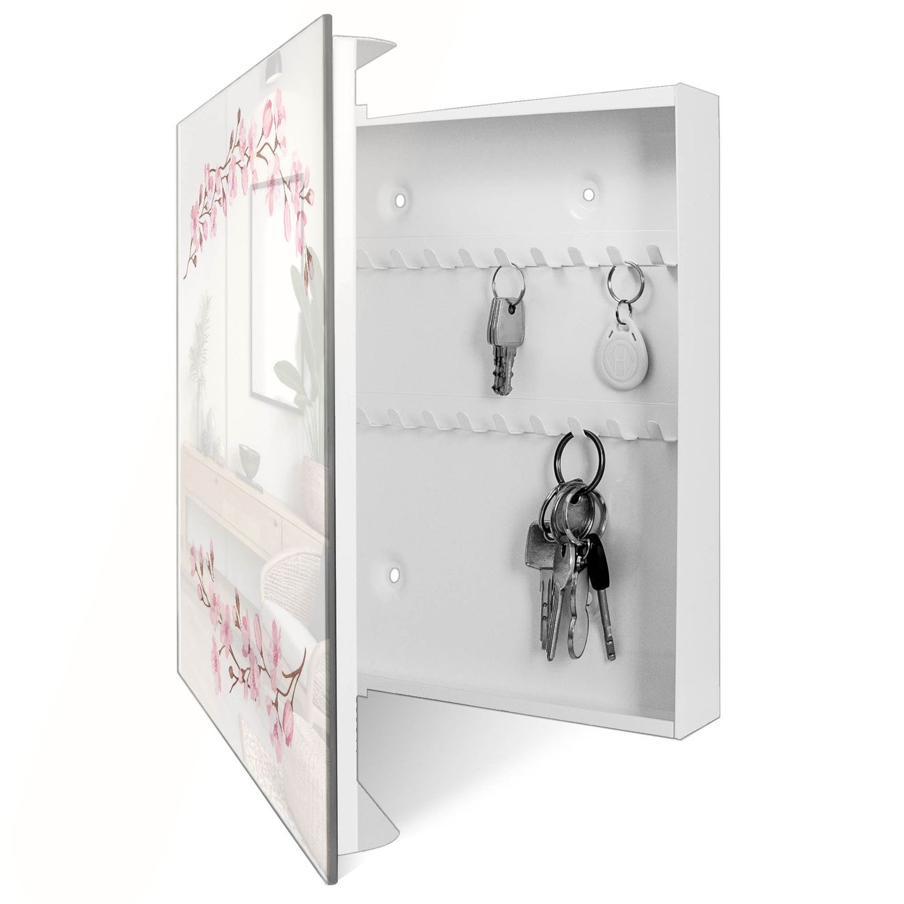 Bringe Ordnung und Eleganz in deinen Eingangsbereich mit dem banjado Schlüsselkasten Motiv Motiv Kirschblütenzauber. Die moderne Schlüsselbox kombiniert funktionales Design mit hochwertiger Verarbeitung und wird so zu einem echten Hingucker in Flur, Büro oder Ferienwohnung. ✅ Stilvolle Schlüsselaufbewahrung mit Glasfront im Motiv Motiv Kirschblütenzauber Der Design-Schlüsselkasten Motiv Motiv Kirschblütenzauber bietet Platz für bis zu 50 Schlüssel, die auf 5 stabilen Reihen mit je 10 Haken übersichtlich verstaut werden. Mit seinen kompakten Maßen von 30 x 30 x 5 cm passt die Schlüsselbox perfekt auch in kleinere Räume. Der weiß lackierte Stahlkorpus mit rechts angeschlagenem Türscharnier harmoniert mit der Glasfront und fügt sich nahtlos in jedes Wohnambiente ein. Ob als Schlüsselorganizer für Zuhause oder als praktische Lösung für Büros, Praxen und Gewerbe, der banjado Schlüsselkasten sorgt für Ordnung und Übersicht. Dank der magnetischen, mit Kreidestiften beschreibbaren Glasfront kannst du Notizen anheften oder Termine direkt auf der Oberfläche festhalten. Die Schlüsselbox Motiv Motiv Kirschblütenzauber zur Wandmontage wird inklusive Befestigungsmaterial geliefert und ist schnell angebracht. So hast du deine Schlüssel jederzeit griffbereit und zugleich stilvoll verstaut. Mit diesem banjado Schlüsselkasten Motiv Motiv Kirschblütenzauber kombinierst du praktische Aufbewahrung mit stilvollem Wohndesign. Ob privat oder geschäftlich, die Schlüsselbox sorgt für mehr Ordnung, Übersicht und ein wohnliches Ambiente.Vorteile im Überblick