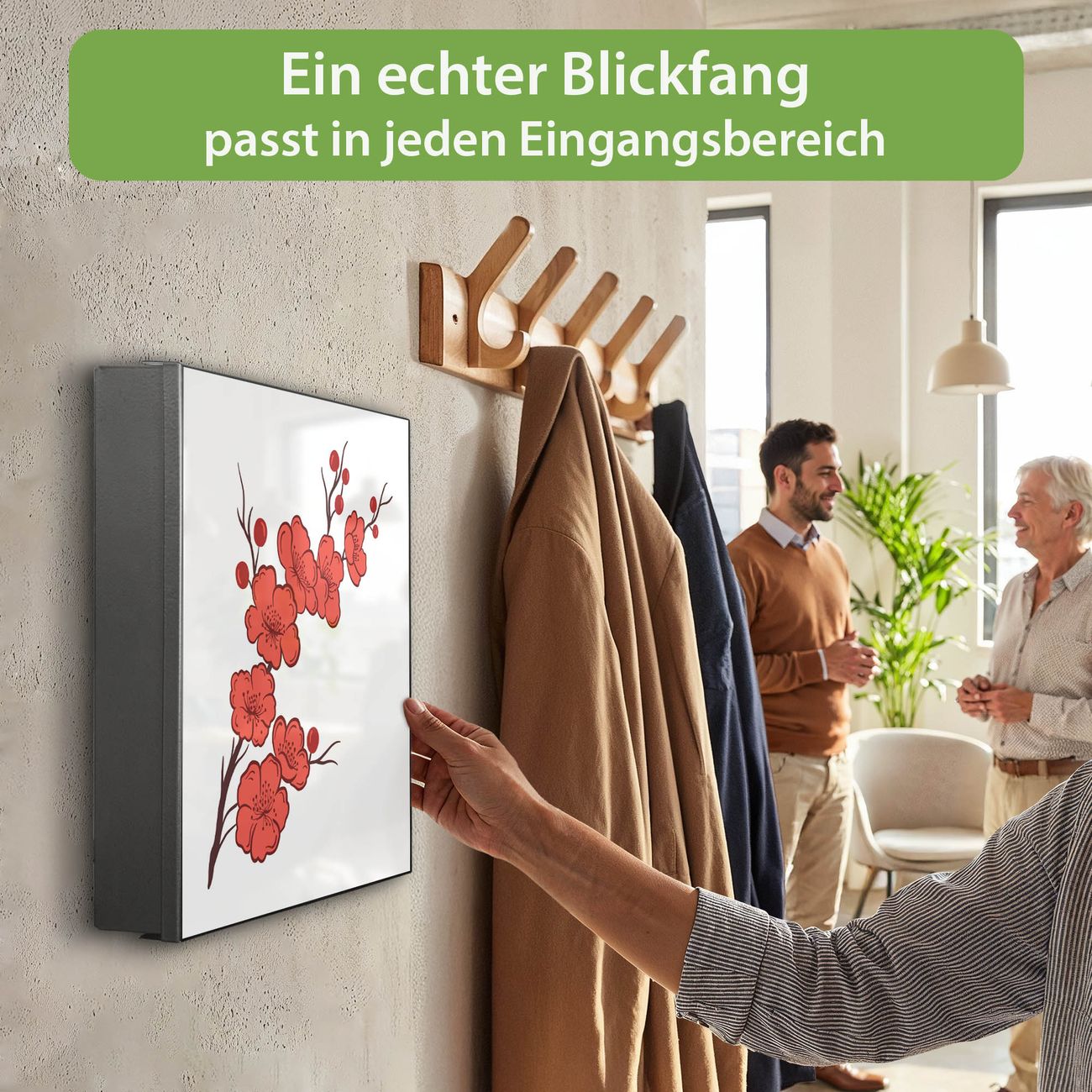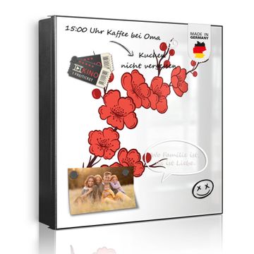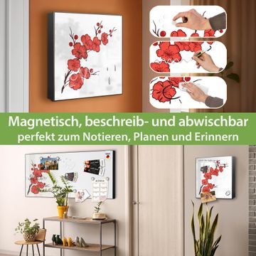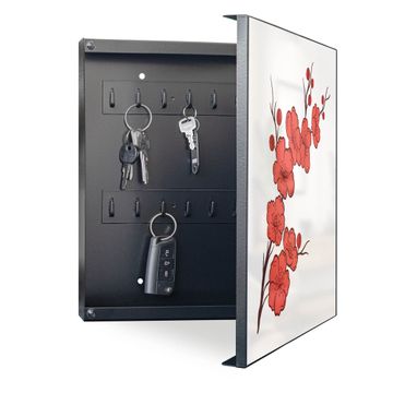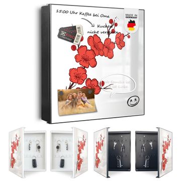 Bringe Ordnung und Eleganz in deinen Eingangsbereich mit dem banjado Schlüsselkasten Motiv Motiv Kirschblütenzweig. Die moderne Schlüsselbox kombiniert funktionales Design mit hochwertiger Verarbeitung und wird so zu einem echten Hingucker in Flur, Büro oder Ferienwohnung. ✅ Stilvolle Schlüsselaufbewahrung mit Motiv Motiv Kirschblütenzweig Der Design-Schlüsselkasten Motiv Motiv Kirschblütenzweig bietet Platz für bis zu 32 Schlüssel, die auf 4 stabilen Reihen mit je 8 Haken übersichtlich verstaut werden. Mit seinen kompakten Maßen von 30 x 30 x 5 cm passt die Schlüsselbox perfekt auch in kleinere Räume. Der schwarz lackierte Stahlkorpus mit rechts angeschlagenem Türscharnier harmoniert mit gedruckten Folie auf der Front und fügt sich nahtlos in jedes Wohnambiente ein. Ob als Schlüsselorganizer für Zuhause oder als praktische Lösung für Büros, Praxen und Gewerbe, der banjado Schlüsselkasten sorgt für Ordnung und Übersicht. Dank der magnetischen, mit Kreidestiften beschreibbaren Folie auf der Front kannst du Notizen anheften oder Termine direkt auf der Oberfläche festhalten. Die Schlüsselbox Motiv Motiv Kirschblütenzweig zur Wandmontage wird inklusive Befestigungsmaterial geliefert und ist schnell angebracht. So hast du deine Schlüssel jederzeit griffbereit und zugleich stilvoll verstaut. Mit diesem banjado Schlüsselkasten Motiv Motiv Kirschblütenzweig kombinierst du praktische Aufbewahrung mit stilvollem Wohndesign. Ob privat oder geschäftlich, die Schlüsselbox sorgt für mehr Ordnung, Übersicht und ein wohnliches Ambiente.Vorteile im Überblick