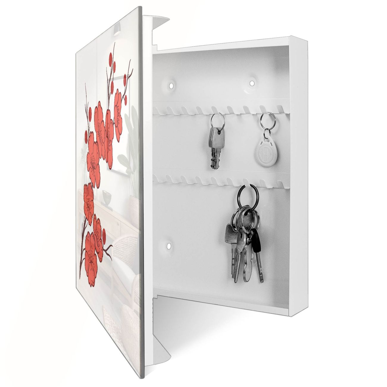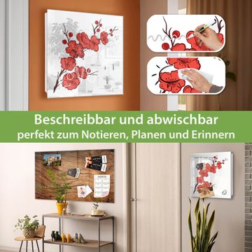 Bringe Ordnung und Eleganz in deinen Eingangsbereich mit dem banjado Schlüsselkasten Motiv Motiv Kirschblütenzweig. Die moderne Schlüsselbox kombiniert funktionales Design mit hochwertiger Verarbeitung und wird so zu einem echten Hingucker in Flur, Büro oder Ferienwohnung. ✅ Stilvolle Schlüsselaufbewahrung mit Glasfront im Motiv Motiv Kirschblütenzweig Der Design-Schlüsselkasten Motiv Motiv Kirschblütenzweig bietet Platz für bis zu 50 Schlüssel, die auf 5 stabilen Reihen mit je 10 Haken übersichtlich verstaut werden. Mit seinen kompakten Maßen von 30 x 30 x 5 cm passt die Schlüsselbox perfekt auch in kleinere Räume. Der weiß lackierte Stahlkorpus mit rechts angeschlagenem Türscharnier harmoniert mit der Glasfront und fügt sich nahtlos in jedes Wohnambiente ein. Ob als Schlüsselorganizer für Zuhause oder als praktische Lösung für Büros, Praxen und Gewerbe, der banjado Schlüsselkasten sorgt für Ordnung und Übersicht. Dank der magnetischen, mit Kreidestiften beschreibbaren Glasfront kannst du Notizen anheften oder Termine direkt auf der Oberfläche festhalten. Die Schlüsselbox Motiv Motiv Kirschblütenzweig zur Wandmontage wird inklusive Befestigungsmaterial geliefert und ist schnell angebracht. So hast du deine Schlüssel jederzeit griffbereit und zugleich stilvoll verstaut. Mit diesem banjado Schlüsselkasten Motiv Motiv Kirschblütenzweig kombinierst du praktische Aufbewahrung mit stilvollem Wohndesign. Ob privat oder geschäftlich, die Schlüsselbox sorgt für mehr Ordnung, Übersicht und ein wohnliches Ambiente.Vorteile im Überblick