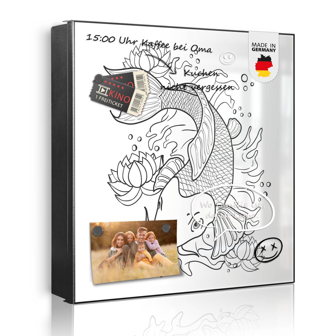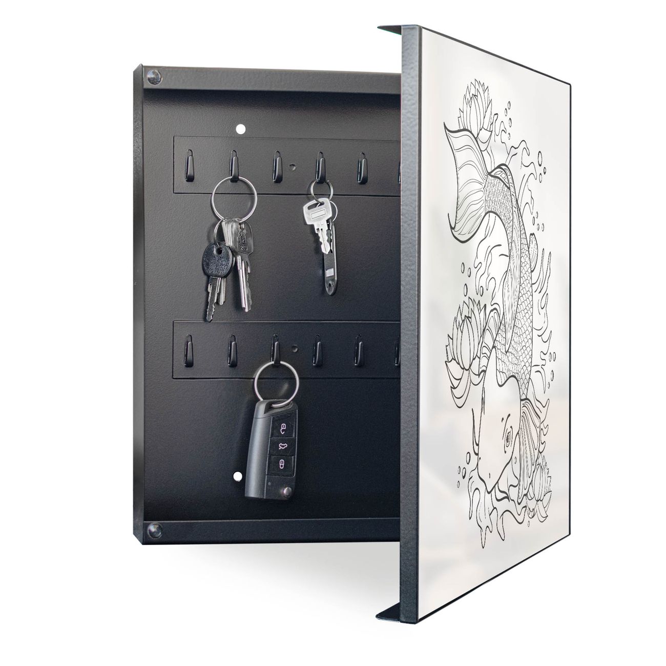 Bringe Ordnung und Eleganz in deinen Eingangsbereich mit dem banjado Schlüsselkasten Motiv Motiv Koi 2. Die moderne Schlüsselbox kombiniert funktionales Design mit hochwertiger Verarbeitung und wird so zu einem echten Hingucker in Flur, Büro oder Ferienwohnung. ✅ Stilvolle Schlüsselaufbewahrung mit Motiv Motiv Koi 2 Der Design-Schlüsselkasten Motiv Motiv Koi 2 bietet Platz für bis zu 32 Schlüssel, die auf 4 stabilen Reihen mit je 8 Haken übersichtlich verstaut werden. Mit seinen kompakten Maßen von 30 x 30 x 5 cm passt die Schlüsselbox perfekt auch in kleinere Räume. Der schwarz lackierte Stahlkorpus mit rechts angeschlagenem Türscharnier harmoniert mit gedruckten Folie auf der Front und fügt sich nahtlos in jedes Wohnambiente ein. Ob als Schlüsselorganizer für Zuhause oder als praktische Lösung für Büros, Praxen und Gewerbe, der banjado Schlüsselkasten sorgt für Ordnung und Übersicht. Dank der magnetischen, mit Kreidestiften beschreibbaren Folie auf der Front kannst du Notizen anheften oder Termine direkt auf der Oberfläche festhalten. Die Schlüsselbox Motiv Motiv Koi 2 zur Wandmontage wird inklusive Befestigungsmaterial geliefert und ist schnell angebracht. So hast du deine Schlüssel jederzeit griffbereit und zugleich stilvoll verstaut. Mit diesem banjado Schlüsselkasten Motiv Motiv Koi 2 kombinierst du praktische Aufbewahrung mit stilvollem Wohndesign. Ob privat oder geschäftlich, die Schlüsselbox sorgt für mehr Ordnung, Übersicht und ein wohnliches Ambiente.Vorteile im Überblick