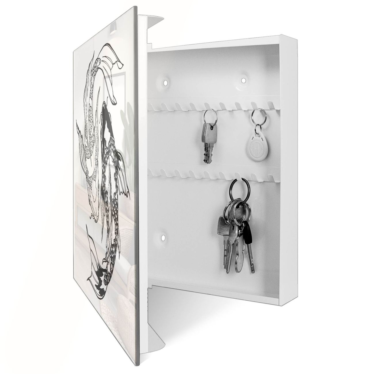 Bringe Ordnung und Eleganz in deinen Eingangsbereich mit dem banjado Schlüsselkasten Motiv Motiv Koi Paar 3. Die moderne Schlüsselbox kombiniert funktionales Design mit hochwertiger Verarbeitung und wird so zu einem echten Hingucker in Flur, Büro oder Ferienwohnung. ✅ Stilvolle Schlüsselaufbewahrung mit Glasfront im Motiv Motiv Koi Paar 3 Der Design-Schlüsselkasten Motiv Motiv Koi Paar 3 bietet Platz für bis zu 50 Schlüssel, die auf 5 stabilen Reihen mit je 10 Haken übersichtlich verstaut werden. Mit seinen kompakten Maßen von 30 x 30 x 5 cm passt die Schlüsselbox perfekt auch in kleinere Räume. Der weiß lackierte Stahlkorpus mit rechts angeschlagenem Türscharnier harmoniert mit der Glasfront und fügt sich nahtlos in jedes Wohnambiente ein. Ob als Schlüsselorganizer für Zuhause oder als praktische Lösung für Büros, Praxen und Gewerbe, der banjado Schlüsselkasten sorgt für Ordnung und Übersicht. Dank der magnetischen, mit Kreidestiften beschreibbaren Glasfront kannst du Notizen anheften oder Termine direkt auf der Oberfläche festhalten. Die Schlüsselbox Motiv Motiv Koi Paar 3 zur Wandmontage wird inklusive Befestigungsmaterial geliefert und ist schnell angebracht. So hast du deine Schlüssel jederzeit griffbereit und zugleich stilvoll verstaut. Mit diesem banjado Schlüsselkasten Motiv Motiv Koi Paar 3 kombinierst du praktische Aufbewahrung mit stilvollem Wohndesign. Ob privat oder geschäftlich, die Schlüsselbox sorgt für mehr Ordnung, Übersicht und ein wohnliches Ambiente.Vorteile im Überblick