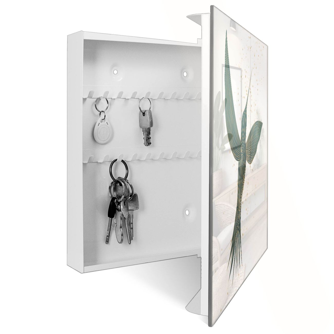 Bringe Ordnung und Eleganz in deinen Eingangsbereich mit dem banjado Schlüsselkasten Motiv Motiv Kolibri 4. Die moderne Schlüsselbox kombiniert funktionales Design mit hochwertiger Verarbeitung und wird so zu einem echten Hingucker in Flur, Büro oder Ferienwohnung. ✅ Stilvolle Schlüsselaufbewahrung mit Glasfront im Motiv Motiv Kolibri 4 Der Design-Schlüsselkasten Motiv Motiv Kolibri 4 bietet Platz für bis zu 50 Schlüssel, die auf 5 stabilen Reihen mit je 10 Haken übersichtlich verstaut werden. Mit seinen kompakten Maßen von 30 x 30 x 5 cm passt die Schlüsselbox perfekt auch in kleinere Räume. Der weiß lackierte Stahlkorpus mit rechts angeschlagenem Türscharnier harmoniert mit der Glasfront und fügt sich nahtlos in jedes Wohnambiente ein. Ob als Schlüsselorganizer für Zuhause oder als praktische Lösung für Büros, Praxen und Gewerbe, der banjado Schlüsselkasten sorgt für Ordnung und Übersicht. Dank der magnetischen, mit Kreidestiften beschreibbaren Glasfront kannst du Notizen anheften oder Termine direkt auf der Oberfläche festhalten. Die Schlüsselbox Motiv Motiv Kolibri 4 zur Wandmontage wird inklusive Befestigungsmaterial geliefert und ist schnell angebracht. So hast du deine Schlüssel jederzeit griffbereit und zugleich stilvoll verstaut. Mit diesem banjado Schlüsselkasten Motiv Motiv Kolibri 4 kombinierst du praktische Aufbewahrung mit stilvollem Wohndesign. Ob privat oder geschäftlich, die Schlüsselbox sorgt für mehr Ordnung, Übersicht und ein wohnliches Ambiente.Vorteile im Überblick