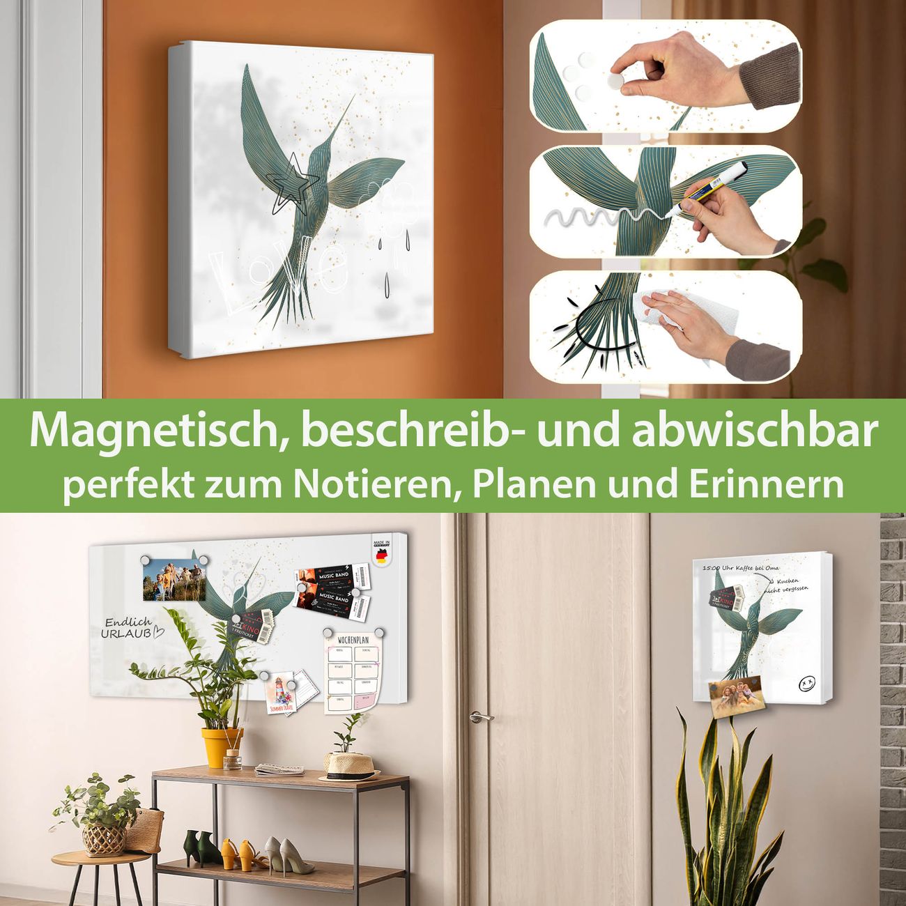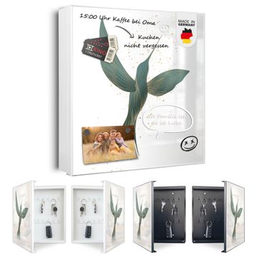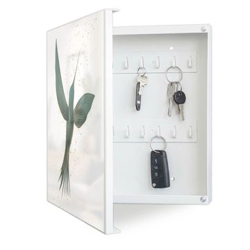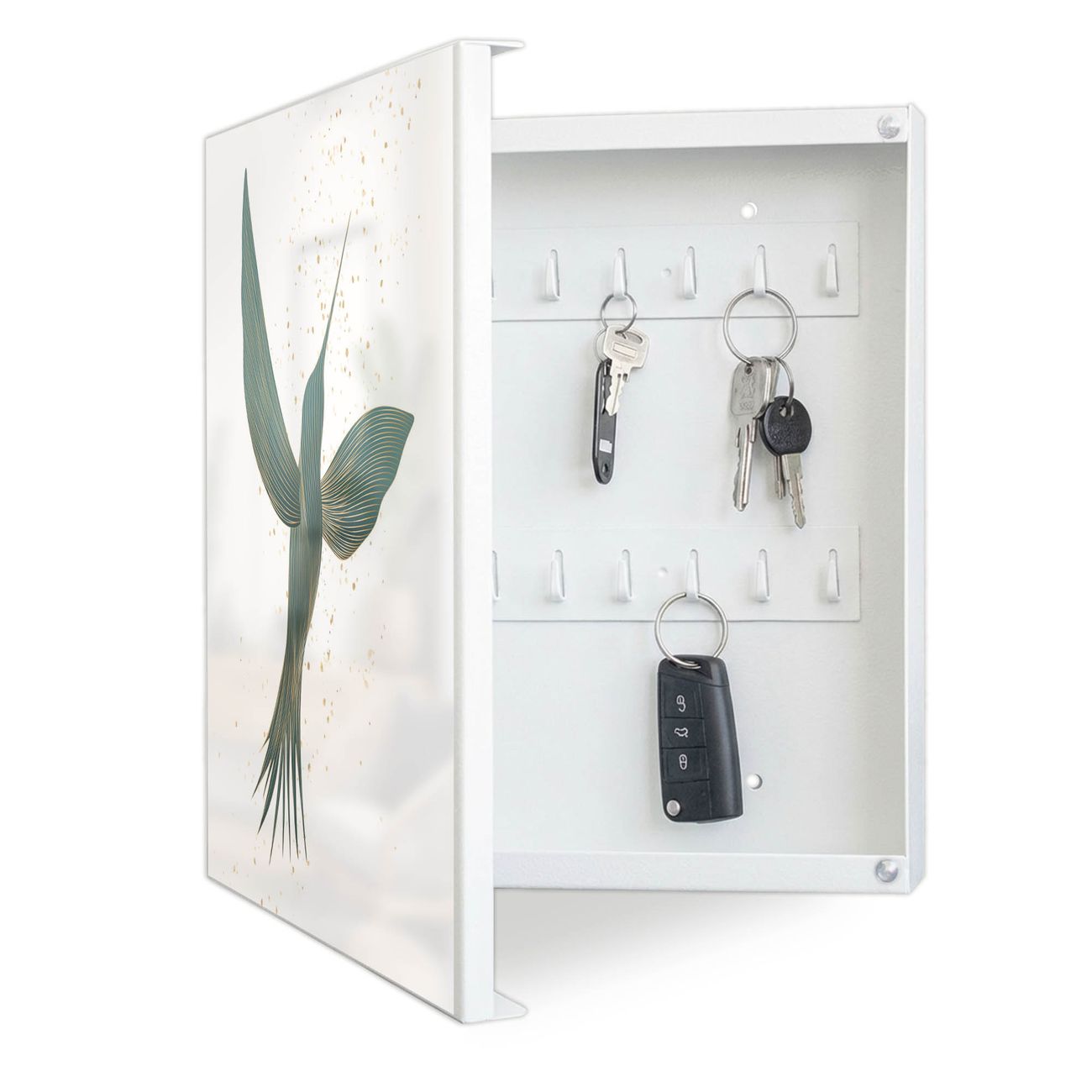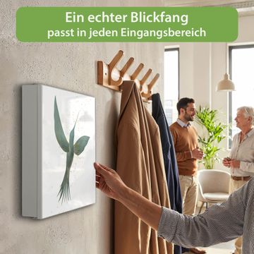 Bringe Ordnung und Eleganz in deinen Eingangsbereich mit dem banjado Schlüsselkasten Motiv Motiv Kolibri 4. Die moderne Schlüsselbox kombiniert funktionales Design mit hochwertiger Verarbeitung und wird so zu einem echten Hingucker in Flur, Büro oder Ferienwohnung. ✅ Stilvolle Schlüsselaufbewahrung mit Motiv Motiv Kolibri 4 Der Design-Schlüsselkasten Motiv Motiv Kolibri 4 bietet Platz für bis zu 32 Schlüssel, die auf 4 stabilen Reihen mit je 8 Haken übersichtlich verstaut werden. Mit seinen kompakten Maßen von 30 x 30 x 5 cm passt die Schlüsselbox perfekt auch in kleinere Räume. Der weiß lackierte Stahlkorpus mit links angeschlagenem Türscharnier harmoniert mit gedruckten Folie auf der Front und fügt sich nahtlos in jedes Wohnambiente ein. Ob als Schlüsselorganizer für Zuhause oder als praktische Lösung für Büros, Praxen und Gewerbe, der banjado Schlüsselkasten sorgt für Ordnung und Übersicht. Dank der magnetischen, mit Kreidestiften beschreibbaren Folie auf der Front kannst du Notizen anheften oder Termine direkt auf der Oberfläche festhalten. Die Schlüsselbox Motiv Motiv Kolibri 4 zur Wandmontage wird inklusive Befestigungsmaterial geliefert und ist schnell angebracht. So hast du deine Schlüssel jederzeit griffbereit und zugleich stilvoll verstaut. Mit diesem banjado Schlüsselkasten Motiv Motiv Kolibri 4 kombinierst du praktische Aufbewahrung mit stilvollem Wohndesign. Ob privat oder geschäftlich, die Schlüsselbox sorgt für mehr Ordnung, Übersicht und ein wohnliches Ambiente.Vorteile im Überblick