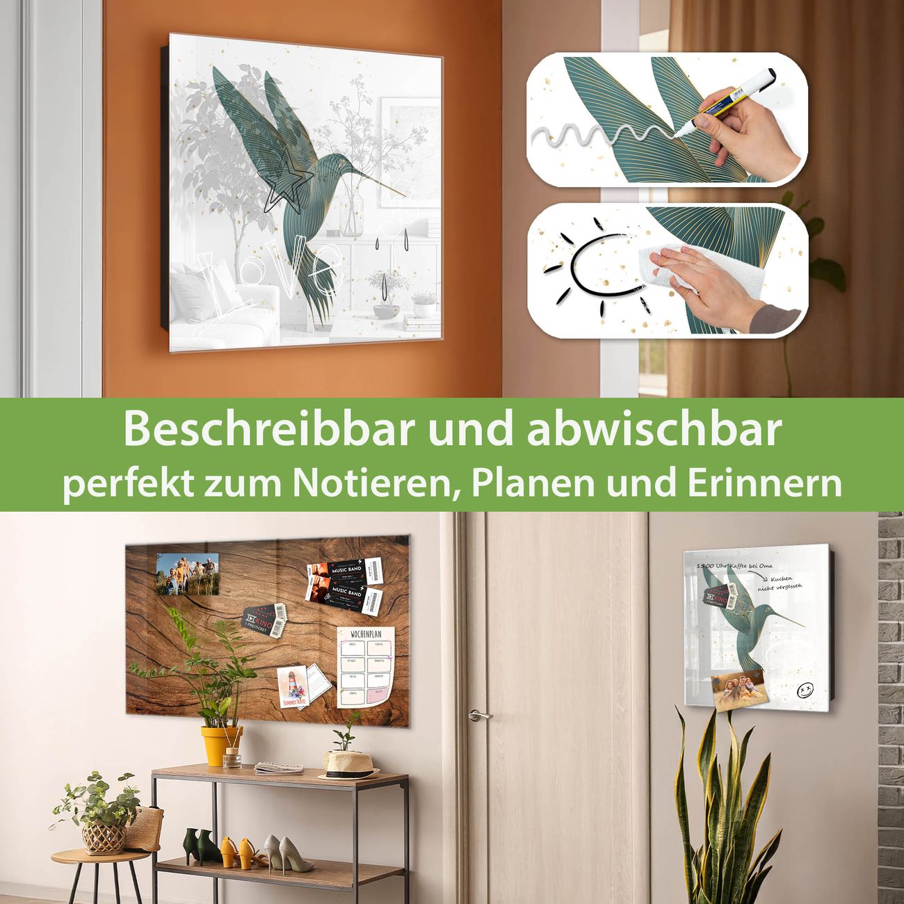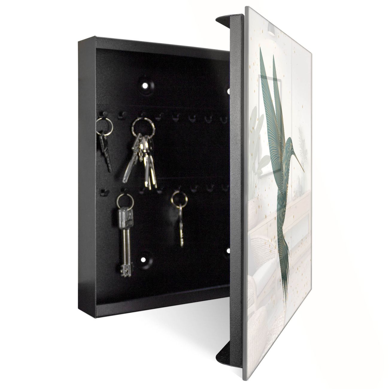 Bringe Ordnung und Eleganz in deinen Eingangsbereich mit dem banjado Schlüsselkasten Motiv Motiv Kolibri 5. Die moderne Schlüsselbox kombiniert funktionales Design mit hochwertiger Verarbeitung und wird so zu einem echten Hingucker in Flur, Büro oder Ferienwohnung. ✅ Stilvolle Schlüsselaufbewahrung mit Glasfront im Motiv Motiv Kolibri 5 Der Design-Schlüsselkasten Motiv Motiv Kolibri 5 bietet Platz für bis zu 50 Schlüssel, die auf 5 stabilen Reihen mit je 10 Haken übersichtlich verstaut werden. Mit seinen kompakten Maßen von 30 x 30 x 5 cm passt die Schlüsselbox perfekt auch in kleinere Räume. Der schwarz lackierte Stahlkorpus mit rechts angeschlagenem Türscharnier harmoniert mit der Glasfront und fügt sich nahtlos in jedes Wohnambiente ein. Ob als Schlüsselorganizer für Zuhause oder als praktische Lösung für Büros, Praxen und Gewerbe, der banjado Schlüsselkasten sorgt für Ordnung und Übersicht. Dank der magnetischen, mit Kreidestiften beschreibbaren Glasfront kannst du Notizen anheften oder Termine direkt auf der Oberfläche festhalten. Die Schlüsselbox Motiv Motiv Kolibri 5 zur Wandmontage wird inklusive Befestigungsmaterial geliefert und ist schnell angebracht. So hast du deine Schlüssel jederzeit griffbereit und zugleich stilvoll verstaut. Mit diesem banjado Schlüsselkasten Motiv Motiv Kolibri 5 kombinierst du praktische Aufbewahrung mit stilvollem Wohndesign. Ob privat oder geschäftlich, die Schlüsselbox sorgt für mehr Ordnung, Übersicht und ein wohnliches Ambiente.Vorteile im Überblick