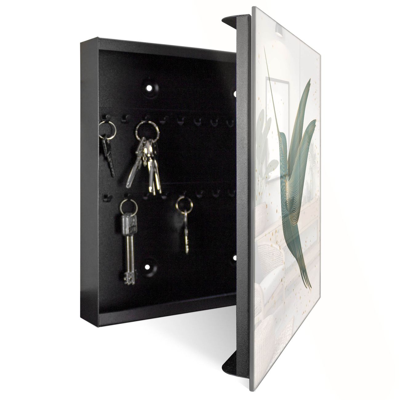 Bringe Ordnung und Eleganz in deinen Eingangsbereich mit dem banjado Schlüsselkasten Motiv Motiv Kolibri 6. Die moderne Schlüsselbox kombiniert funktionales Design mit hochwertiger Verarbeitung und wird so zu einem echten Hingucker in Flur, Büro oder Ferienwohnung. ✅ Stilvolle Schlüsselaufbewahrung mit Glasfront im Motiv Motiv Kolibri 6 Der Design-Schlüsselkasten Motiv Motiv Kolibri 6 bietet Platz für bis zu 50 Schlüssel, die auf 5 stabilen Reihen mit je 10 Haken übersichtlich verstaut werden. Mit seinen kompakten Maßen von 30 x 30 x 5 cm passt die Schlüsselbox perfekt auch in kleinere Räume. Der schwarz lackierte Stahlkorpus mit rechts angeschlagenem Türscharnier harmoniert mit der Glasfront und fügt sich nahtlos in jedes Wohnambiente ein. Ob als Schlüsselorganizer für Zuhause oder als praktische Lösung für Büros, Praxen und Gewerbe, der banjado Schlüsselkasten sorgt für Ordnung und Übersicht. Dank der magnetischen, mit Kreidestiften beschreibbaren Glasfront kannst du Notizen anheften oder Termine direkt auf der Oberfläche festhalten. Die Schlüsselbox Motiv Motiv Kolibri 6 zur Wandmontage wird inklusive Befestigungsmaterial geliefert und ist schnell angebracht. So hast du deine Schlüssel jederzeit griffbereit und zugleich stilvoll verstaut. Mit diesem banjado Schlüsselkasten Motiv Motiv Kolibri 6 kombinierst du praktische Aufbewahrung mit stilvollem Wohndesign. Ob privat oder geschäftlich, die Schlüsselbox sorgt für mehr Ordnung, Übersicht und ein wohnliches Ambiente.Vorteile im Überblick