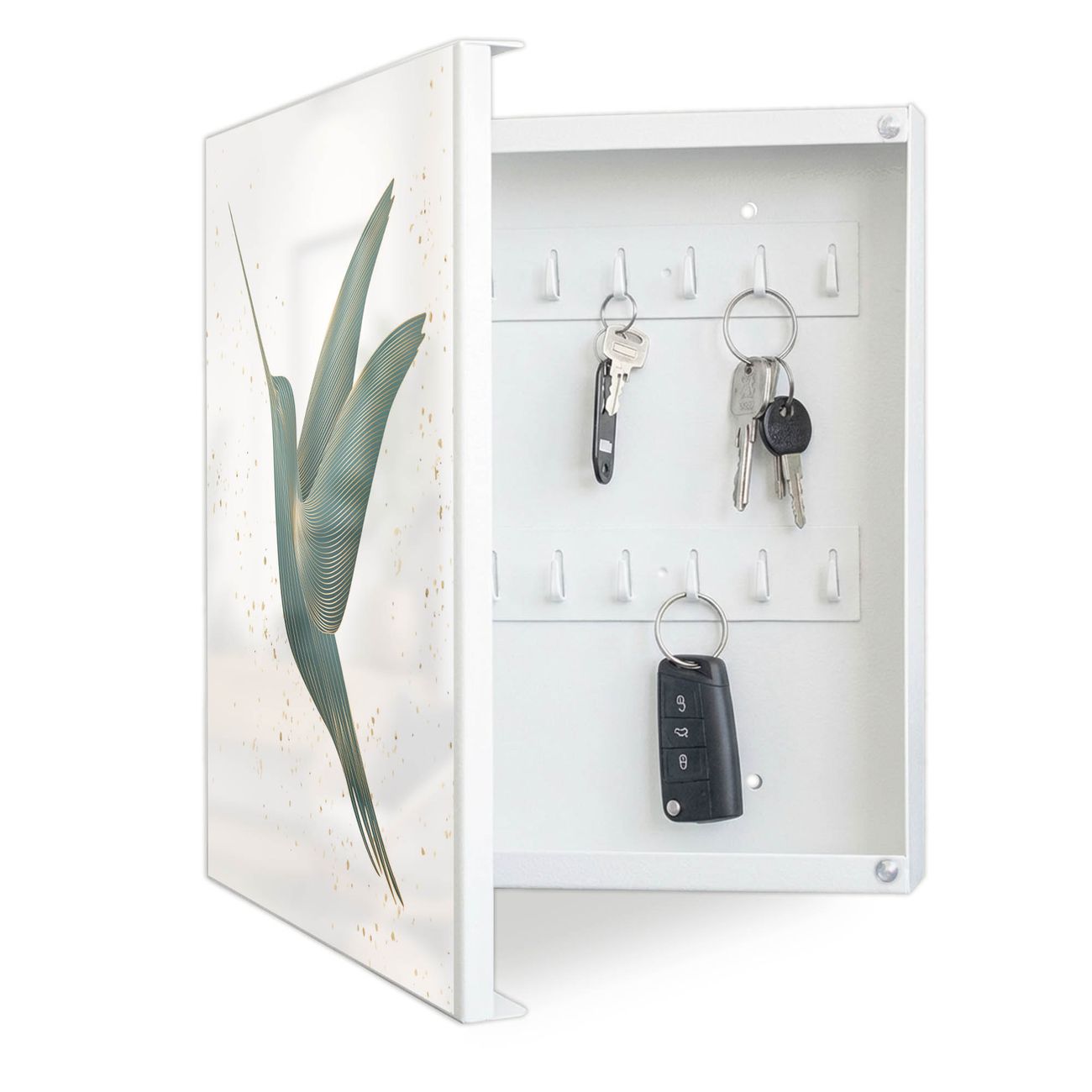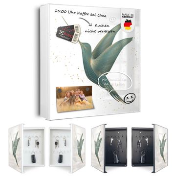 Bringe Ordnung und Eleganz in deinen Eingangsbereich mit dem banjado Schlüsselkasten Motiv Motiv Kolibri 6. Die moderne Schlüsselbox kombiniert funktionales Design mit hochwertiger Verarbeitung und wird so zu einem echten Hingucker in Flur, Büro oder Ferienwohnung. ✅ Stilvolle Schlüsselaufbewahrung mit Motiv Motiv Kolibri 6 Der Design-Schlüsselkasten Motiv Motiv Kolibri 6 bietet Platz für bis zu 32 Schlüssel, die auf 4 stabilen Reihen mit je 8 Haken übersichtlich verstaut werden. Mit seinen kompakten Maßen von 30 x 30 x 5 cm passt die Schlüsselbox perfekt auch in kleinere Räume. Der weiß lackierte Stahlkorpus mit links angeschlagenem Türscharnier harmoniert mit gedruckten Folie auf der Front und fügt sich nahtlos in jedes Wohnambiente ein. Ob als Schlüsselorganizer für Zuhause oder als praktische Lösung für Büros, Praxen und Gewerbe, der banjado Schlüsselkasten sorgt für Ordnung und Übersicht. Dank der magnetischen, mit Kreidestiften beschreibbaren Folie auf der Front kannst du Notizen anheften oder Termine direkt auf der Oberfläche festhalten. Die Schlüsselbox Motiv Motiv Kolibri 6 zur Wandmontage wird inklusive Befestigungsmaterial geliefert und ist schnell angebracht. So hast du deine Schlüssel jederzeit griffbereit und zugleich stilvoll verstaut. Mit diesem banjado Schlüsselkasten Motiv Motiv Kolibri 6 kombinierst du praktische Aufbewahrung mit stilvollem Wohndesign. Ob privat oder geschäftlich, die Schlüsselbox sorgt für mehr Ordnung, Übersicht und ein wohnliches Ambiente.Vorteile im Überblick