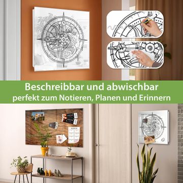 Bringe Ordnung und Eleganz in deinen Eingangsbereich mit dem banjado Schlüsselkasten Motiv Motiv Kompass 2. Die moderne Schlüsselbox kombiniert funktionales Design mit hochwertiger Verarbeitung und wird so zu einem echten Hingucker in Flur, Büro oder Ferienwohnung. ✅ Stilvolle Schlüsselaufbewahrung mit Glasfront im Motiv Motiv Kompass 2 Der Design-Schlüsselkasten Motiv Motiv Kompass 2 bietet Platz für bis zu 50 Schlüssel, die auf 5 stabilen Reihen mit je 10 Haken übersichtlich verstaut werden. Mit seinen kompakten Maßen von 30 x 30 x 5 cm passt die Schlüsselbox perfekt auch in kleinere Räume. Der weiß lackierte Stahlkorpus mit rechts angeschlagenem Türscharnier harmoniert mit der Glasfront und fügt sich nahtlos in jedes Wohnambiente ein. Ob als Schlüsselorganizer für Zuhause oder als praktische Lösung für Büros, Praxen und Gewerbe, der banjado Schlüsselkasten sorgt für Ordnung und Übersicht. Dank der magnetischen, mit Kreidestiften beschreibbaren Glasfront kannst du Notizen anheften oder Termine direkt auf der Oberfläche festhalten. Die Schlüsselbox Motiv Motiv Kompass 2 zur Wandmontage wird inklusive Befestigungsmaterial geliefert und ist schnell angebracht. So hast du deine Schlüssel jederzeit griffbereit und zugleich stilvoll verstaut. Mit diesem banjado Schlüsselkasten Motiv Motiv Kompass 2 kombinierst du praktische Aufbewahrung mit stilvollem Wohndesign. Ob privat oder geschäftlich, die Schlüsselbox sorgt für mehr Ordnung, Übersicht und ein wohnliches Ambiente.Vorteile im Überblick