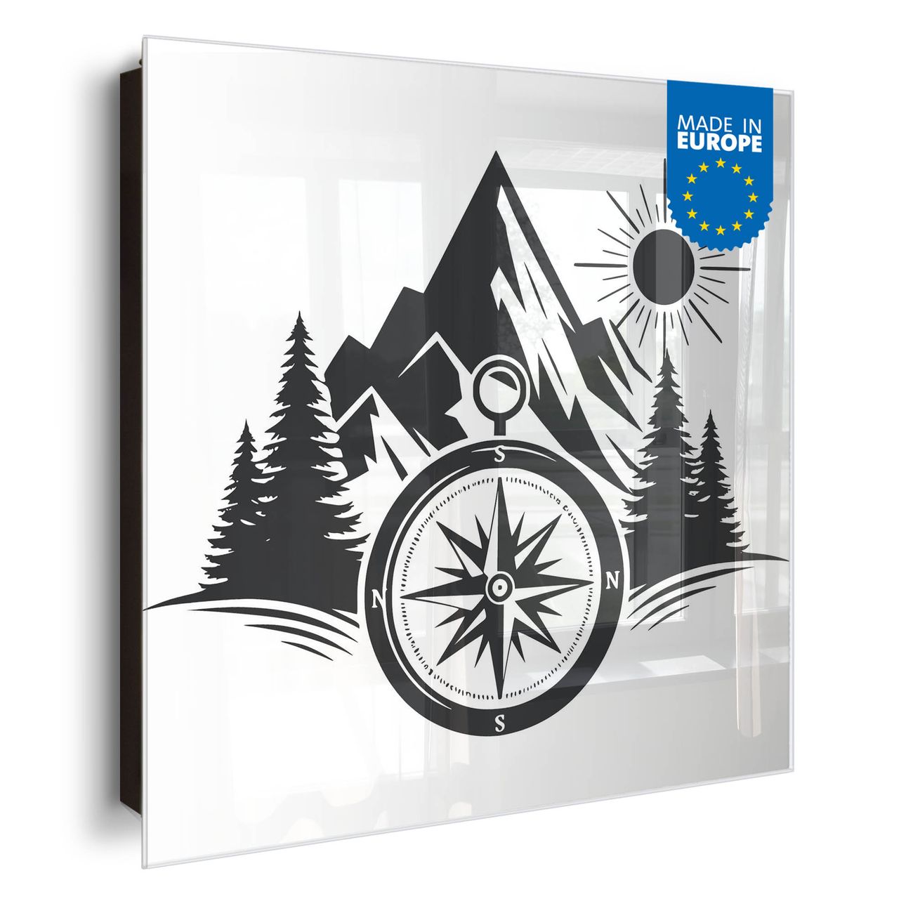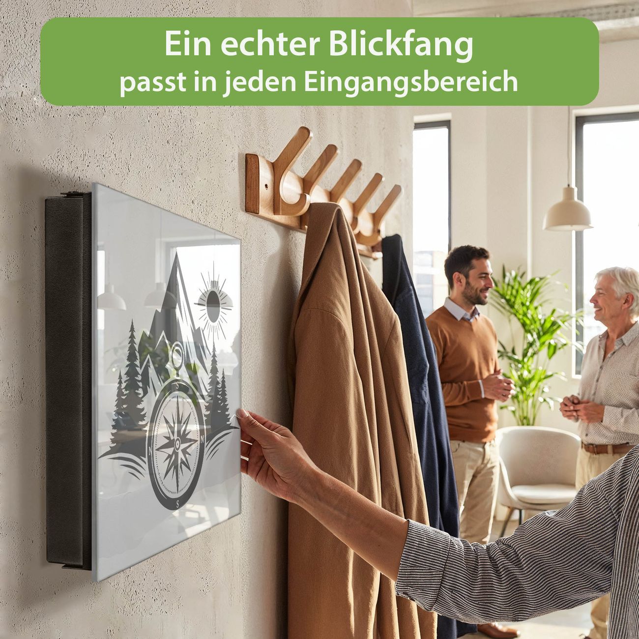 Bringe Ordnung und Eleganz in deinen Eingangsbereich mit dem banjado Schlüsselkasten Motiv Motiv Kompass in der Wildnis. Die moderne Schlüsselbox kombiniert funktionales Design mit hochwertiger Verarbeitung und wird so zu einem echten Hingucker in Flur, Büro oder Ferienwohnung. ✅ Stilvolle Schlüsselaufbewahrung mit Glasfront im Motiv Motiv Kompass in der Wildnis Der Design-Schlüsselkasten Motiv Motiv Kompass in der Wildnis bietet Platz für bis zu 50 Schlüssel, die auf 5 stabilen Reihen mit je 10 Haken übersichtlich verstaut werden. Mit seinen kompakten Maßen von 30 x 30 x 5 cm passt die Schlüsselbox perfekt auch in kleinere Räume. Der schwarz lackierte Stahlkorpus mit rechts angeschlagenem Türscharnier harmoniert mit der Glasfront und fügt sich nahtlos in jedes Wohnambiente ein. Ob als Schlüsselorganizer für Zuhause oder als praktische Lösung für Büros, Praxen und Gewerbe, der banjado Schlüsselkasten sorgt für Ordnung und Übersicht. Dank der magnetischen, mit Kreidestiften beschreibbaren Glasfront kannst du Notizen anheften oder Termine direkt auf der Oberfläche festhalten. Die Schlüsselbox Motiv Motiv Kompass in der Wildnis zur Wandmontage wird inklusive Befestigungsmaterial geliefert und ist schnell angebracht. So hast du deine Schlüssel jederzeit griffbereit und zugleich stilvoll verstaut. Mit diesem banjado Schlüsselkasten Motiv Motiv Kompass in der Wildnis kombinierst du praktische Aufbewahrung mit stilvollem Wohndesign. Ob privat oder geschäftlich, die Schlüsselbox sorgt für mehr Ordnung, Übersicht und ein wohnliches Ambiente.Vorteile im Überblick