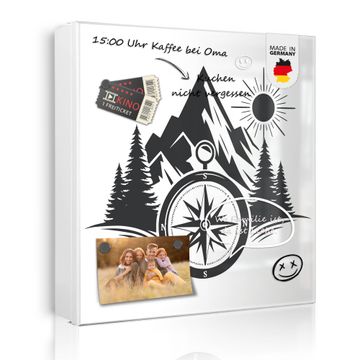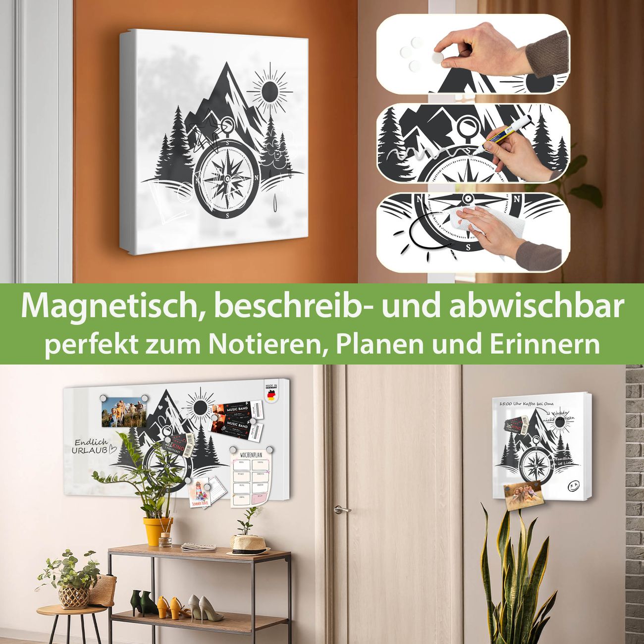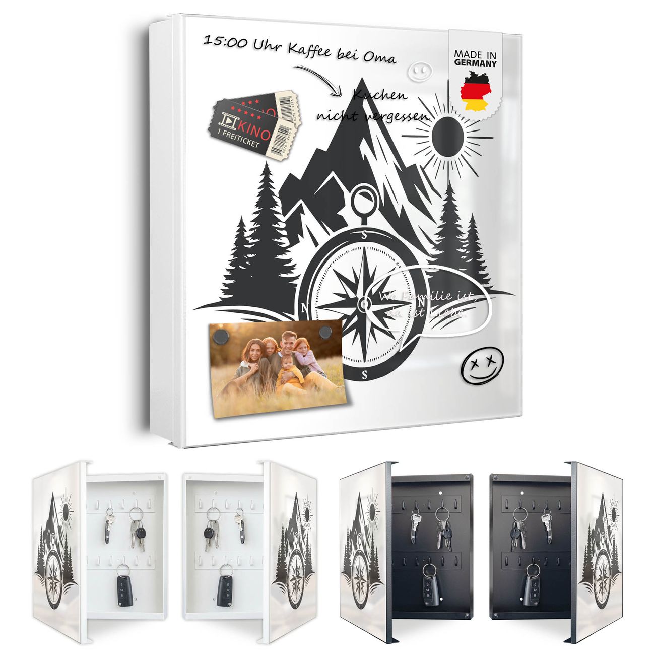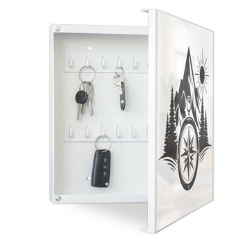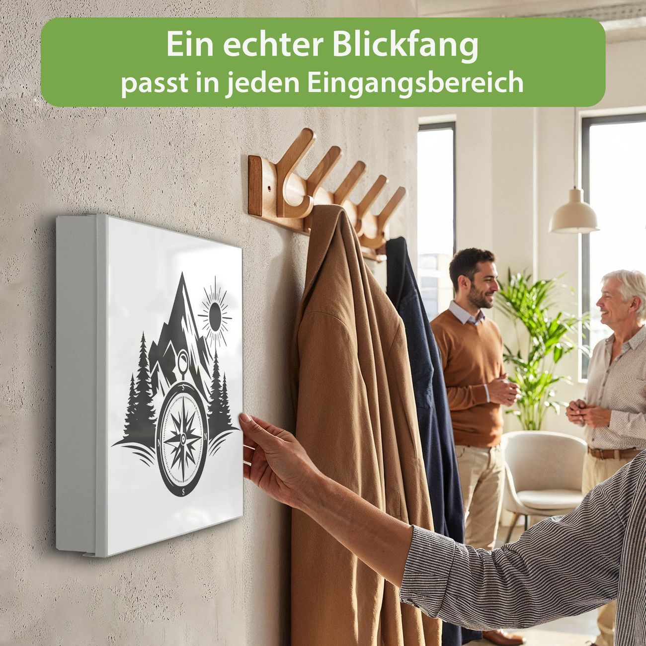 Bringe Ordnung und Eleganz in deinen Eingangsbereich mit dem banjado Schlüsselkasten Motiv Motiv Kompass in der Wildnis. Die moderne Schlüsselbox kombiniert funktionales Design mit hochwertiger Verarbeitung und wird so zu einem echten Hingucker in Flur, Büro oder Ferienwohnung. ✅ Stilvolle Schlüsselaufbewahrung mit Motiv Motiv Kompass in der Wildnis Der Design-Schlüsselkasten Motiv Motiv Kompass in der Wildnis bietet Platz für bis zu 32 Schlüssel, die auf 4 stabilen Reihen mit je 8 Haken übersichtlich verstaut werden. Mit seinen kompakten Maßen von 30 x 30 x 5 cm passt die Schlüsselbox perfekt auch in kleinere Räume. Der weiß lackierte Stahlkorpus mit rechts angeschlagenem Türscharnier harmoniert mit gedruckten Folie auf der Front und fügt sich nahtlos in jedes Wohnambiente ein. Ob als Schlüsselorganizer für Zuhause oder als praktische Lösung für Büros, Praxen und Gewerbe, der banjado Schlüsselkasten sorgt für Ordnung und Übersicht. Dank der magnetischen, mit Kreidestiften beschreibbaren Folie auf der Front kannst du Notizen anheften oder Termine direkt auf der Oberfläche festhalten. Die Schlüsselbox Motiv Motiv Kompass in der Wildnis zur Wandmontage wird inklusive Befestigungsmaterial geliefert und ist schnell angebracht. So hast du deine Schlüssel jederzeit griffbereit und zugleich stilvoll verstaut. Mit diesem banjado Schlüsselkasten Motiv Motiv Kompass in der Wildnis kombinierst du praktische Aufbewahrung mit stilvollem Wohndesign. Ob privat oder geschäftlich, die Schlüsselbox sorgt für mehr Ordnung, Übersicht und ein wohnliches Ambiente.Vorteile im Überblick