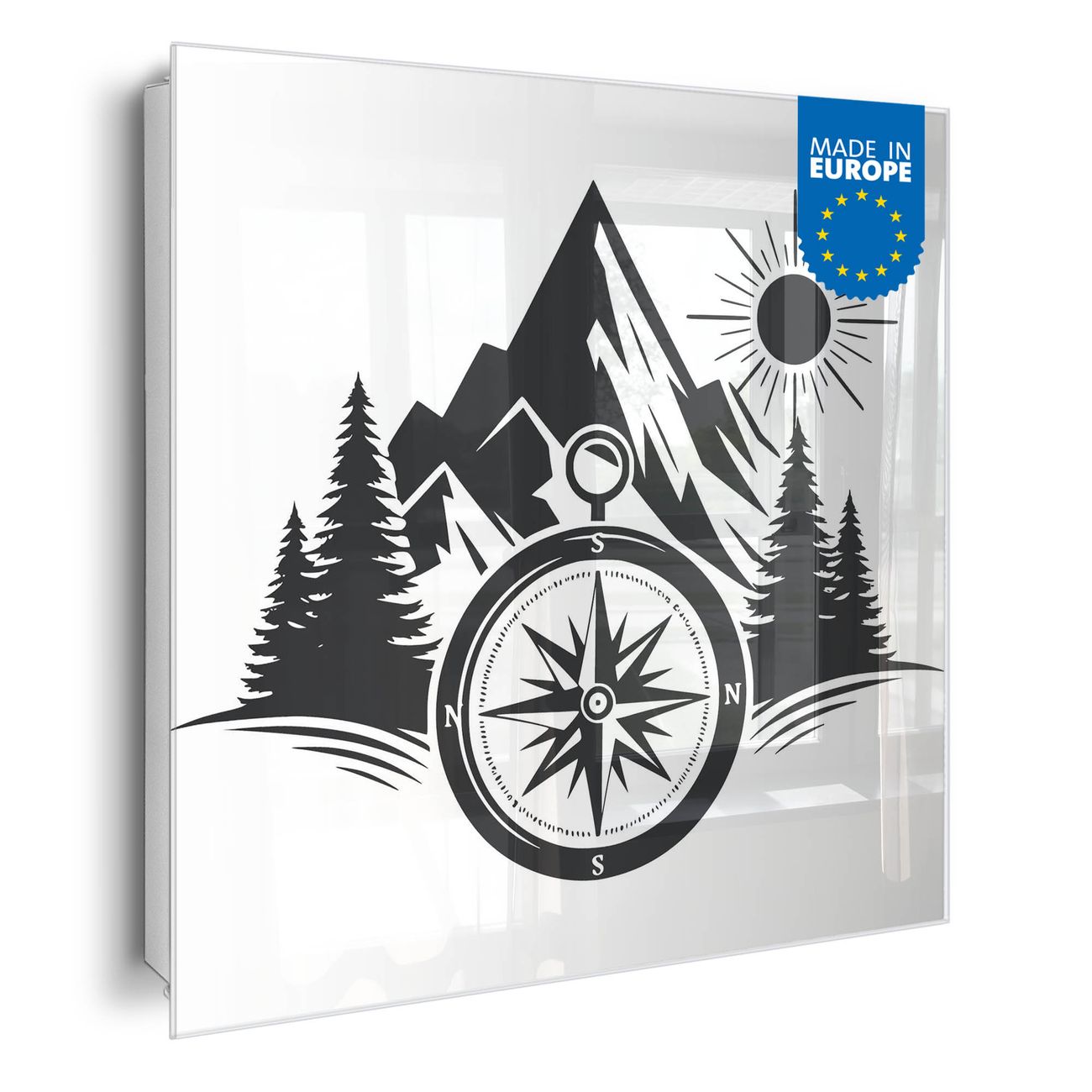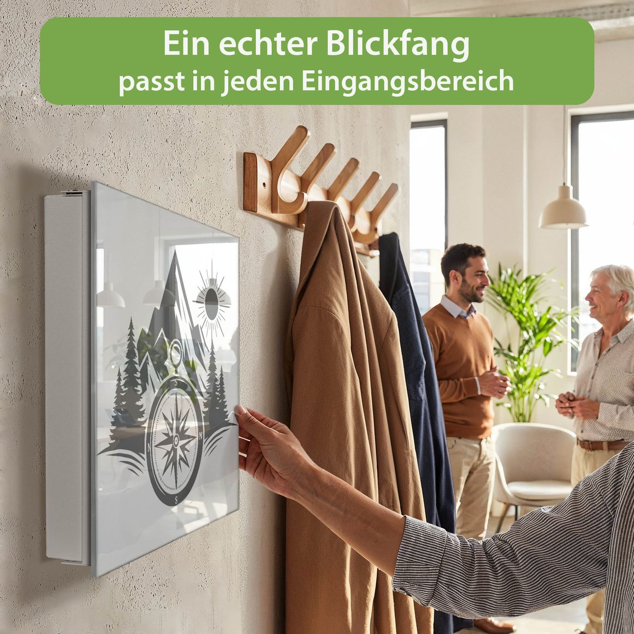 Bringe Ordnung und Eleganz in deinen Eingangsbereich mit dem banjado Schlüsselkasten Motiv Motiv Kompass in der Wildnis. Die moderne Schlüsselbox kombiniert funktionales Design mit hochwertiger Verarbeitung und wird so zu einem echten Hingucker in Flur, Büro oder Ferienwohnung. ✅ Stilvolle Schlüsselaufbewahrung mit Glasfront im Motiv Motiv Kompass in der Wildnis Der Design-Schlüsselkasten Motiv Motiv Kompass in der Wildnis bietet Platz für bis zu 50 Schlüssel, die auf 5 stabilen Reihen mit je 10 Haken übersichtlich verstaut werden. Mit seinen kompakten Maßen von 30 x 30 x 5 cm passt die Schlüsselbox perfekt auch in kleinere Räume. Der weiß lackierte Stahlkorpus mit rechts angeschlagenem Türscharnier harmoniert mit der Glasfront und fügt sich nahtlos in jedes Wohnambiente ein. Ob als Schlüsselorganizer für Zuhause oder als praktische Lösung für Büros, Praxen und Gewerbe, der banjado Schlüsselkasten sorgt für Ordnung und Übersicht. Dank der magnetischen, mit Kreidestiften beschreibbaren Glasfront kannst du Notizen anheften oder Termine direkt auf der Oberfläche festhalten. Die Schlüsselbox Motiv Motiv Kompass in der Wildnis zur Wandmontage wird inklusive Befestigungsmaterial geliefert und ist schnell angebracht. So hast du deine Schlüssel jederzeit griffbereit und zugleich stilvoll verstaut. Mit diesem banjado Schlüsselkasten Motiv Motiv Kompass in der Wildnis kombinierst du praktische Aufbewahrung mit stilvollem Wohndesign. Ob privat oder geschäftlich, die Schlüsselbox sorgt für mehr Ordnung, Übersicht und ein wohnliches Ambiente.Vorteile im Überblick