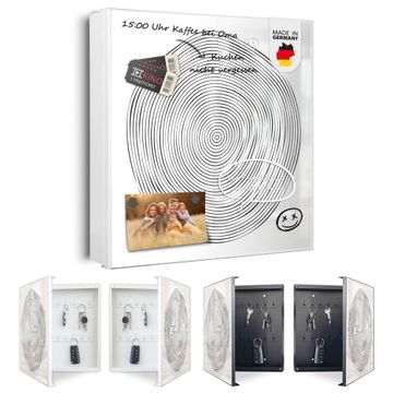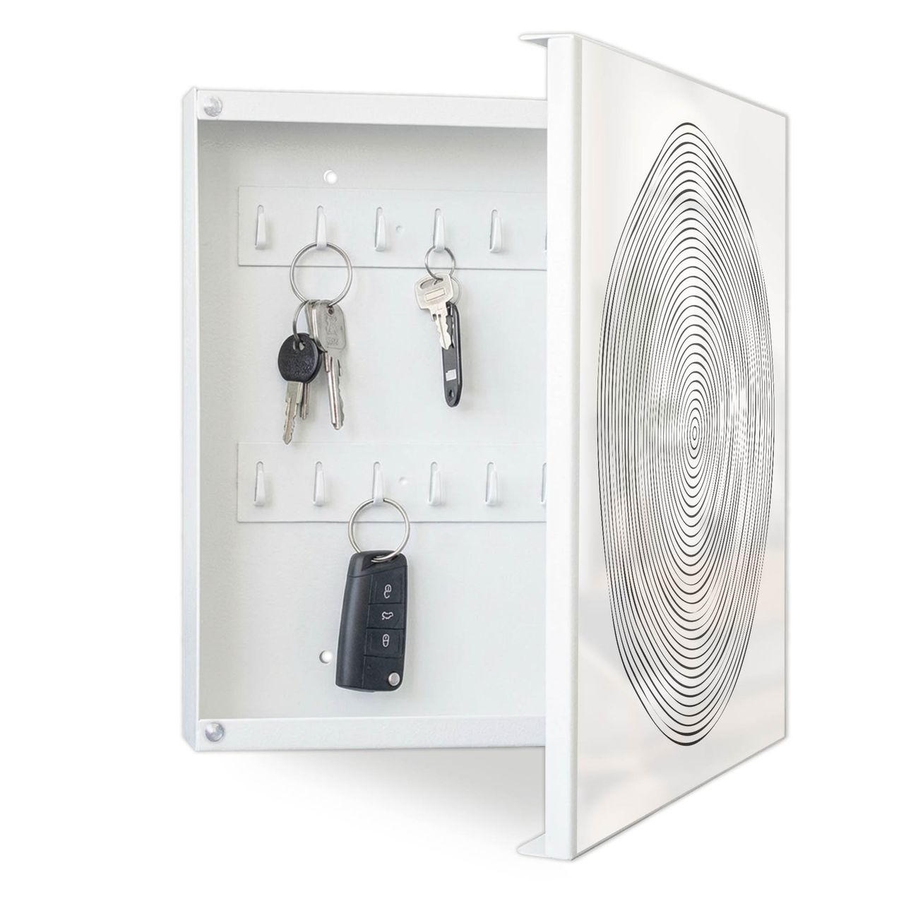 Bringe Ordnung und Eleganz in deinen Eingangsbereich mit dem banjado Schlüsselkasten Motiv Motiv Konzentrische Kreise. Die moderne Schlüsselbox kombiniert funktionales Design mit hochwertiger Verarbeitung und wird so zu einem echten Hingucker in Flur, Büro oder Ferienwohnung. ✅ Stilvolle Schlüsselaufbewahrung mit Motiv Motiv Konzentrische Kreise Der Design-Schlüsselkasten Motiv Motiv Konzentrische Kreise bietet Platz für bis zu 32 Schlüssel, die auf 4 stabilen Reihen mit je 8 Haken übersichtlich verstaut werden. Mit seinen kompakten Maßen von 30 x 30 x 5 cm passt die Schlüsselbox perfekt auch in kleinere Räume. Der weiß lackierte Stahlkorpus mit rechts angeschlagenem Türscharnier harmoniert mit gedruckten Folie auf der Front und fügt sich nahtlos in jedes Wohnambiente ein. Ob als Schlüsselorganizer für Zuhause oder als praktische Lösung für Büros, Praxen und Gewerbe, der banjado Schlüsselkasten sorgt für Ordnung und Übersicht. Dank der magnetischen, mit Kreidestiften beschreibbaren Folie auf der Front kannst du Notizen anheften oder Termine direkt auf der Oberfläche festhalten. Die Schlüsselbox Motiv Motiv Konzentrische Kreise zur Wandmontage wird inklusive Befestigungsmaterial geliefert und ist schnell angebracht. So hast du deine Schlüssel jederzeit griffbereit und zugleich stilvoll verstaut. Mit diesem banjado Schlüsselkasten Motiv Motiv Konzentrische Kreise kombinierst du praktische Aufbewahrung mit stilvollem Wohndesign. Ob privat oder geschäftlich, die Schlüsselbox sorgt für mehr Ordnung, Übersicht und ein wohnliches Ambiente.Vorteile im Überblick