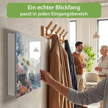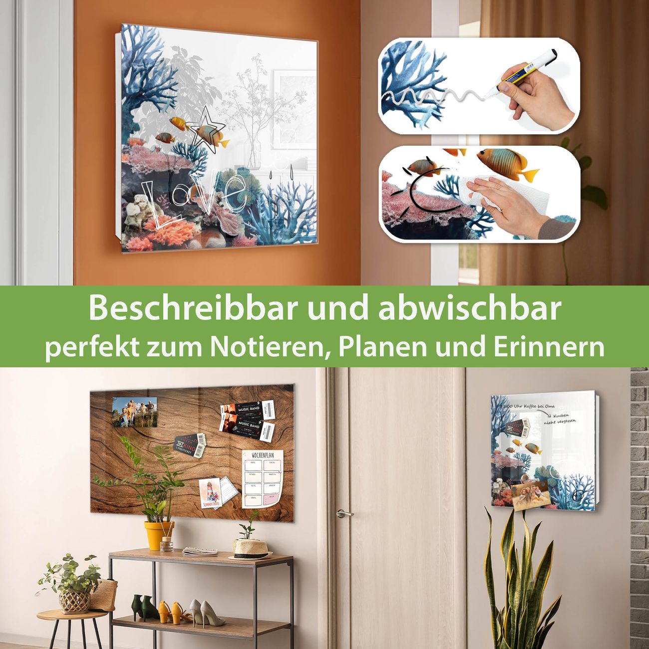 Bringe Ordnung und Eleganz in deinen Eingangsbereich mit dem banjado Schlüsselkasten Motiv Motiv Korallenriff und Fische. Die moderne Schlüsselbox kombiniert funktionales Design mit hochwertiger Verarbeitung und wird so zu einem echten Hingucker in Flur, Büro oder Ferienwohnung. ✅ Stilvolle Schlüsselaufbewahrung mit Glasfront im Motiv Motiv Korallenriff und Fische Der Design-Schlüsselkasten Motiv Motiv Korallenriff und Fische bietet Platz für bis zu 50 Schlüssel, die auf 5 stabilen Reihen mit je 10 Haken übersichtlich verstaut werden. Mit seinen kompakten Maßen von 30 x 30 x 5 cm passt die Schlüsselbox perfekt auch in kleinere Räume. Der weiß lackierte Stahlkorpus mit rechts angeschlagenem Türscharnier harmoniert mit der Glasfront und fügt sich nahtlos in jedes Wohnambiente ein. Ob als Schlüsselorganizer für Zuhause oder als praktische Lösung für Büros, Praxen und Gewerbe, der banjado Schlüsselkasten sorgt für Ordnung und Übersicht. Dank der magnetischen, mit Kreidestiften beschreibbaren Glasfront kannst du Notizen anheften oder Termine direkt auf der Oberfläche festhalten. Die Schlüsselbox Motiv Motiv Korallenriff und Fische zur Wandmontage wird inklusive Befestigungsmaterial geliefert und ist schnell angebracht. So hast du deine Schlüssel jederzeit griffbereit und zugleich stilvoll verstaut. Mit diesem banjado Schlüsselkasten Motiv Motiv Korallenriff und Fische kombinierst du praktische Aufbewahrung mit stilvollem Wohndesign. Ob privat oder geschäftlich, die Schlüsselbox sorgt für mehr Ordnung, Übersicht und ein wohnliches Ambiente.Vorteile im Überblick