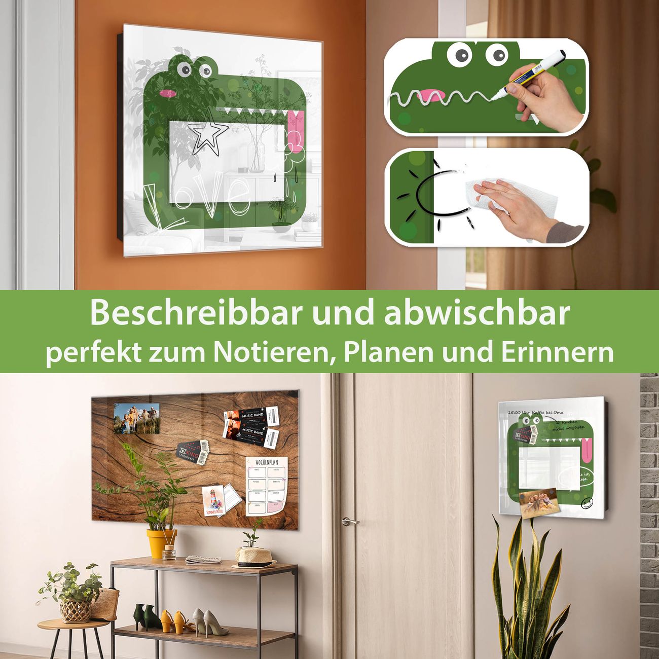Bringe Ordnung und Eleganz in deinen Eingangsbereich mit dem banjado Schlüsselkasten Motiv Motiv Krokodil-Bilderrahmen. Die moderne Schlüsselbox kombiniert funktionales Design mit hochwertiger Verarbeitung und wird so zu einem echten Hingucker in Flur, Büro oder Ferienwohnung. ✅ Stilvolle Schlüsselaufbewahrung mit Glasfront im Motiv Motiv Krokodil-Bilderrahmen Der Design-Schlüsselkasten Motiv Motiv Krokodil-Bilderrahmen bietet Platz für bis zu 50 Schlüssel, die auf 5 stabilen Reihen mit je 10 Haken übersichtlich verstaut werden. Mit seinen kompakten Maßen von 30 x 30 x 5 cm passt die Schlüsselbox perfekt auch in kleinere Räume. Der schwarz lackierte Stahlkorpus mit rechts angeschlagenem Türscharnier harmoniert mit der Glasfront und fügt sich nahtlos in jedes Wohnambiente ein. Ob als Schlüsselorganizer für Zuhause oder als praktische Lösung für Büros, Praxen und Gewerbe, der banjado Schlüsselkasten sorgt für Ordnung und Übersicht. Dank der magnetischen, mit Kreidestiften beschreibbaren Glasfront kannst du Notizen anheften oder Termine direkt auf der Oberfläche festhalten. Die Schlüsselbox Motiv Motiv Krokodil-Bilderrahmen zur Wandmontage wird inklusive Befestigungsmaterial geliefert und ist schnell angebracht. So hast du deine Schlüssel jederzeit griffbereit und zugleich stilvoll verstaut. Mit diesem banjado Schlüsselkasten Motiv Motiv Krokodil-Bilderrahmen kombinierst du praktische Aufbewahrung mit stilvollem Wohndesign. Ob privat oder geschäftlich, die Schlüsselbox sorgt für mehr Ordnung, Übersicht und ein wohnliches Ambiente.Vorteile im Überblick