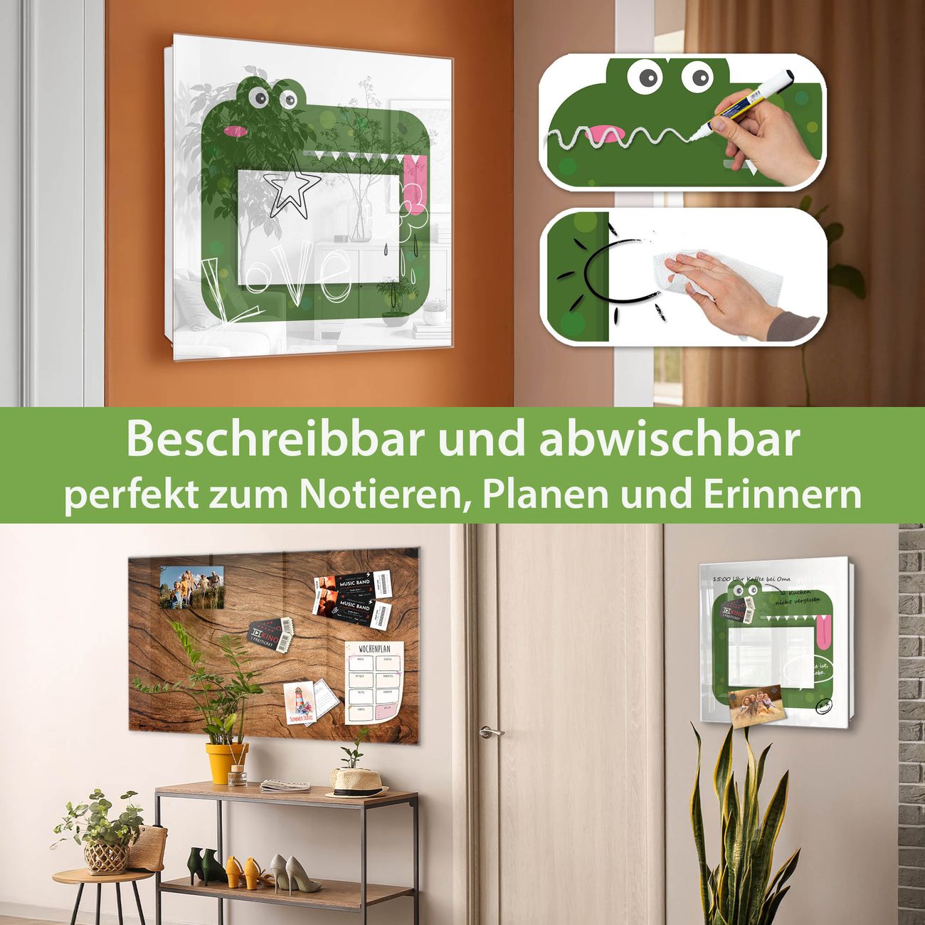 Bringe Ordnung und Eleganz in deinen Eingangsbereich mit dem banjado Schlüsselkasten Motiv Motiv Krokodil-Bilderrahmen. Die moderne Schlüsselbox kombiniert funktionales Design mit hochwertiger Verarbeitung und wird so zu einem echten Hingucker in Flur, Büro oder Ferienwohnung. ✅ Stilvolle Schlüsselaufbewahrung mit Glasfront im Motiv Motiv Krokodil-Bilderrahmen Der Design-Schlüsselkasten Motiv Motiv Krokodil-Bilderrahmen bietet Platz für bis zu 50 Schlüssel, die auf 5 stabilen Reihen mit je 10 Haken übersichtlich verstaut werden. Mit seinen kompakten Maßen von 30 x 30 x 5 cm passt die Schlüsselbox perfekt auch in kleinere Räume. Der weiß lackierte Stahlkorpus mit rechts angeschlagenem Türscharnier harmoniert mit der Glasfront und fügt sich nahtlos in jedes Wohnambiente ein. Ob als Schlüsselorganizer für Zuhause oder als praktische Lösung für Büros, Praxen und Gewerbe, der banjado Schlüsselkasten sorgt für Ordnung und Übersicht. Dank der magnetischen, mit Kreidestiften beschreibbaren Glasfront kannst du Notizen anheften oder Termine direkt auf der Oberfläche festhalten. Die Schlüsselbox Motiv Motiv Krokodil-Bilderrahmen zur Wandmontage wird inklusive Befestigungsmaterial geliefert und ist schnell angebracht. So hast du deine Schlüssel jederzeit griffbereit und zugleich stilvoll verstaut. Mit diesem banjado Schlüsselkasten Motiv Motiv Krokodil-Bilderrahmen kombinierst du praktische Aufbewahrung mit stilvollem Wohndesign. Ob privat oder geschäftlich, die Schlüsselbox sorgt für mehr Ordnung, Übersicht und ein wohnliches Ambiente.Vorteile im Überblick