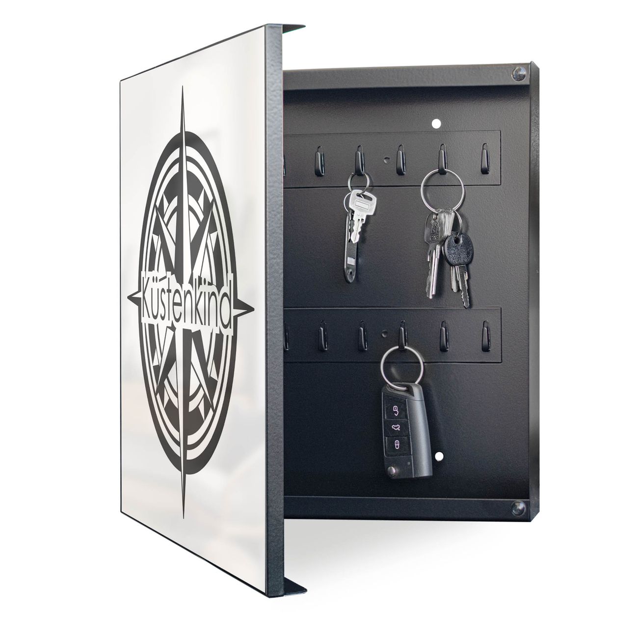 Bringe Ordnung und Eleganz in deinen Eingangsbereich mit dem banjado Schlüsselkasten Motiv Motiv Küstenkind Kompass 2. Die moderne Schlüsselbox kombiniert funktionales Design mit hochwertiger Verarbeitung und wird so zu einem echten Hingucker in Flur, Büro oder Ferienwohnung. ✅ Stilvolle Schlüsselaufbewahrung mit Motiv Motiv Küstenkind Kompass 2 Der Design-Schlüsselkasten Motiv Motiv Küstenkind Kompass 2 bietet Platz für bis zu 32 Schlüssel, die auf 4 stabilen Reihen mit je 8 Haken übersichtlich verstaut werden. Mit seinen kompakten Maßen von 30 x 30 x 5 cm passt die Schlüsselbox perfekt auch in kleinere Räume. Der schwarz lackierte Stahlkorpus mit links angeschlagenem Türscharnier harmoniert mit gedruckten Folie auf der Front und fügt sich nahtlos in jedes Wohnambiente ein. Ob als Schlüsselorganizer für Zuhause oder als praktische Lösung für Büros, Praxen und Gewerbe, der banjado Schlüsselkasten sorgt für Ordnung und Übersicht. Dank der magnetischen, mit Kreidestiften beschreibbaren Folie auf der Front kannst du Notizen anheften oder Termine direkt auf der Oberfläche festhalten. Die Schlüsselbox Motiv Motiv Küstenkind Kompass 2 zur Wandmontage wird inklusive Befestigungsmaterial geliefert und ist schnell angebracht. So hast du deine Schlüssel jederzeit griffbereit und zugleich stilvoll verstaut. Mit diesem banjado Schlüsselkasten Motiv Motiv Küstenkind Kompass 2 kombinierst du praktische Aufbewahrung mit stilvollem Wohndesign. Ob privat oder geschäftlich, die Schlüsselbox sorgt für mehr Ordnung, Übersicht und ein wohnliches Ambiente.Vorteile im Überblick