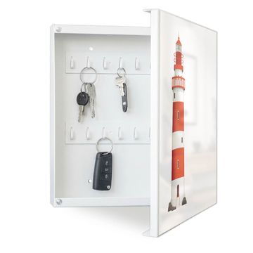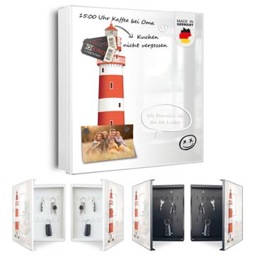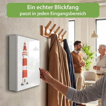 Bringe Ordnung und Eleganz in deinen Eingangsbereich mit dem banjado Schlüsselkasten Motiv Motiv Küstenwächter. Die moderne Schlüsselbox kombiniert funktionales Design mit hochwertiger Verarbeitung und wird so zu einem echten Hingucker in Flur, Büro oder Ferienwohnung. ✅ Stilvolle Schlüsselaufbewahrung mit Motiv Motiv Küstenwächter Der Design-Schlüsselkasten Motiv Motiv Küstenwächter bietet Platz für bis zu 32 Schlüssel, die auf 4 stabilen Reihen mit je 8 Haken übersichtlich verstaut werden. Mit seinen kompakten Maßen von 30 x 30 x 5 cm passt die Schlüsselbox perfekt auch in kleinere Räume. Der weiß lackierte Stahlkorpus mit rechts angeschlagenem Türscharnier harmoniert mit gedruckten Folie auf der Front und fügt sich nahtlos in jedes Wohnambiente ein. Ob als Schlüsselorganizer für Zuhause oder als praktische Lösung für Büros, Praxen und Gewerbe, der banjado Schlüsselkasten sorgt für Ordnung und Übersicht. Dank der magnetischen, mit Kreidestiften beschreibbaren Folie auf der Front kannst du Notizen anheften oder Termine direkt auf der Oberfläche festhalten. Die Schlüsselbox Motiv Motiv Küstenwächter zur Wandmontage wird inklusive Befestigungsmaterial geliefert und ist schnell angebracht. So hast du deine Schlüssel jederzeit griffbereit und zugleich stilvoll verstaut. Mit diesem banjado Schlüsselkasten Motiv Motiv Küstenwächter kombinierst du praktische Aufbewahrung mit stilvollem Wohndesign. Ob privat oder geschäftlich, die Schlüsselbox sorgt für mehr Ordnung, Übersicht und ein wohnliches Ambiente.Vorteile im Überblick