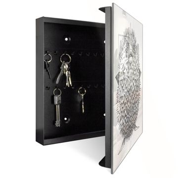 Bringe Ordnung und Eleganz in deinen Eingangsbereich mit dem banjado Schlüsselkasten Motiv Motiv Kugelfisch 2. Die moderne Schlüsselbox kombiniert funktionales Design mit hochwertiger Verarbeitung und wird so zu einem echten Hingucker in Flur, Büro oder Ferienwohnung. ✅ Stilvolle Schlüsselaufbewahrung mit Glasfront im Motiv Motiv Kugelfisch 2 Der Design-Schlüsselkasten Motiv Motiv Kugelfisch 2 bietet Platz für bis zu 50 Schlüssel, die auf 5 stabilen Reihen mit je 10 Haken übersichtlich verstaut werden. Mit seinen kompakten Maßen von 30 x 30 x 5 cm passt die Schlüsselbox perfekt auch in kleinere Räume. Der schwarz lackierte Stahlkorpus mit rechts angeschlagenem Türscharnier harmoniert mit der Glasfront und fügt sich nahtlos in jedes Wohnambiente ein. Ob als Schlüsselorganizer für Zuhause oder als praktische Lösung für Büros, Praxen und Gewerbe, der banjado Schlüsselkasten sorgt für Ordnung und Übersicht. Dank der magnetischen, mit Kreidestiften beschreibbaren Glasfront kannst du Notizen anheften oder Termine direkt auf der Oberfläche festhalten. Die Schlüsselbox Motiv Motiv Kugelfisch 2 zur Wandmontage wird inklusive Befestigungsmaterial geliefert und ist schnell angebracht. So hast du deine Schlüssel jederzeit griffbereit und zugleich stilvoll verstaut. Mit diesem banjado Schlüsselkasten Motiv Motiv Kugelfisch 2 kombinierst du praktische Aufbewahrung mit stilvollem Wohndesign. Ob privat oder geschäftlich, die Schlüsselbox sorgt für mehr Ordnung, Übersicht und ein wohnliches Ambiente.Vorteile im Überblick