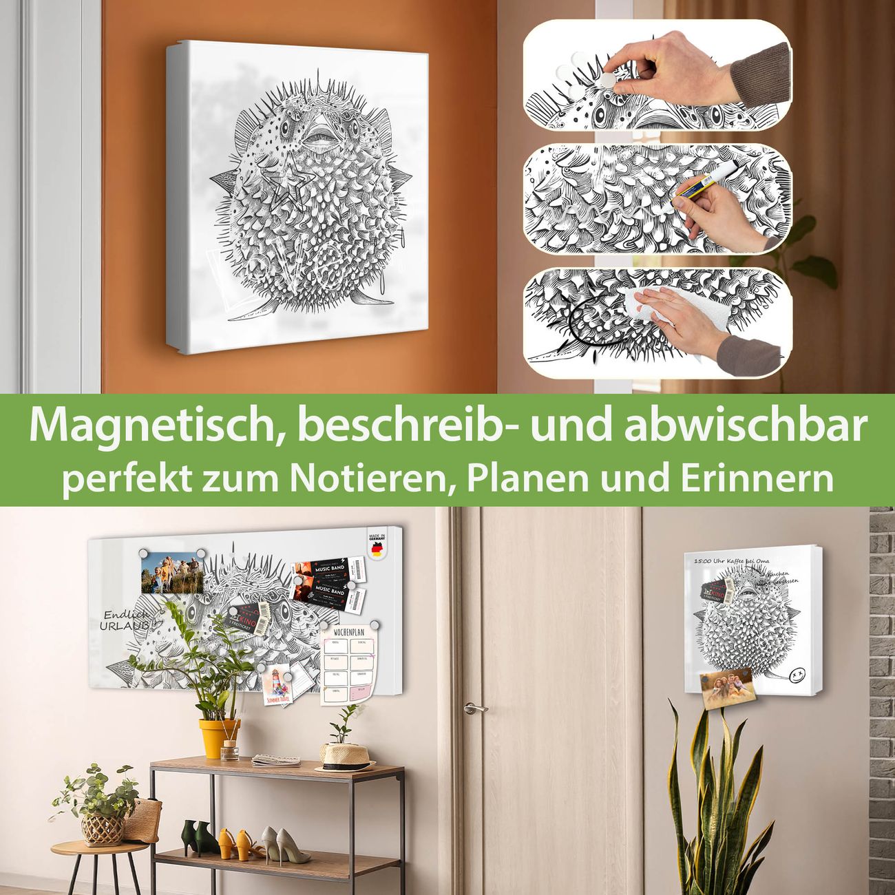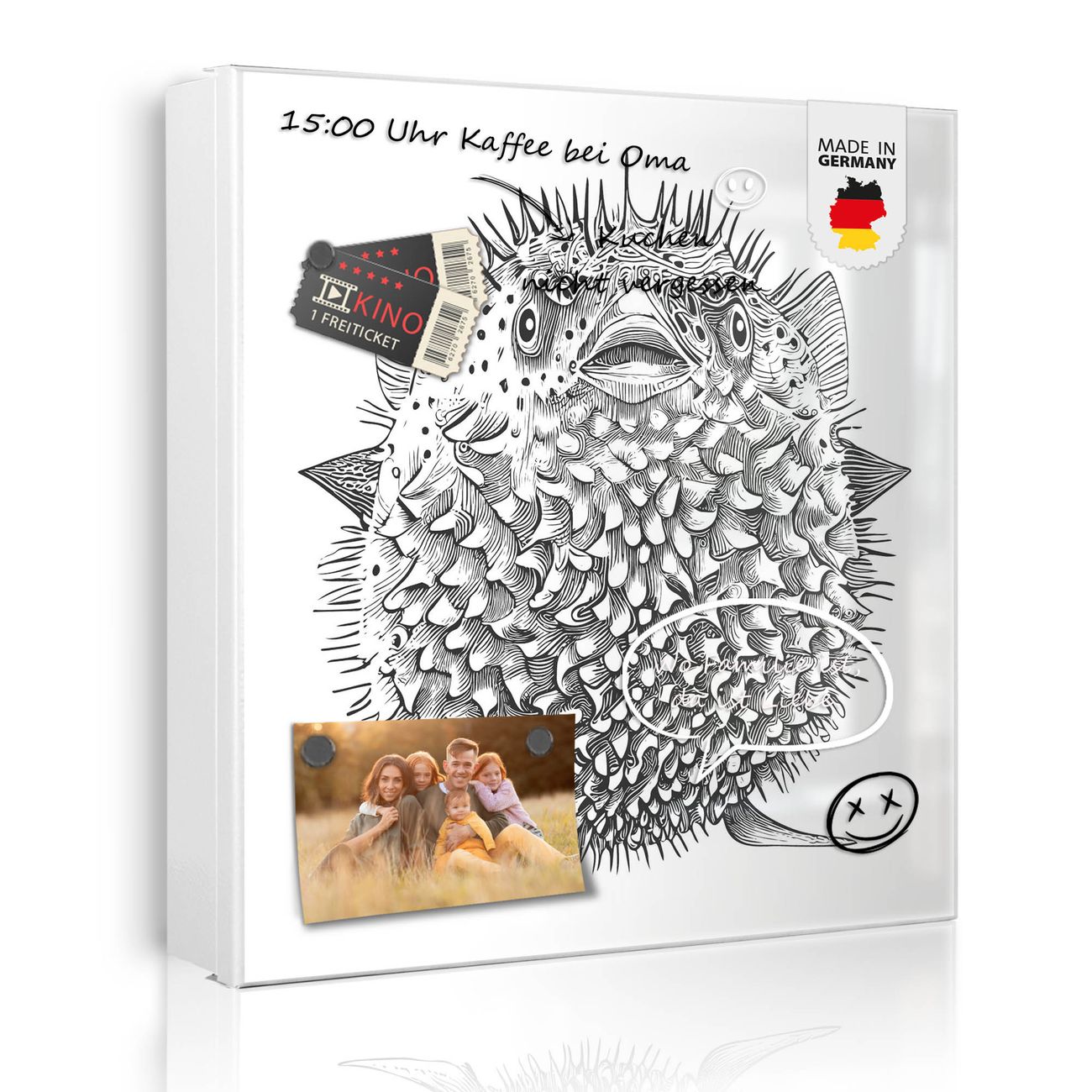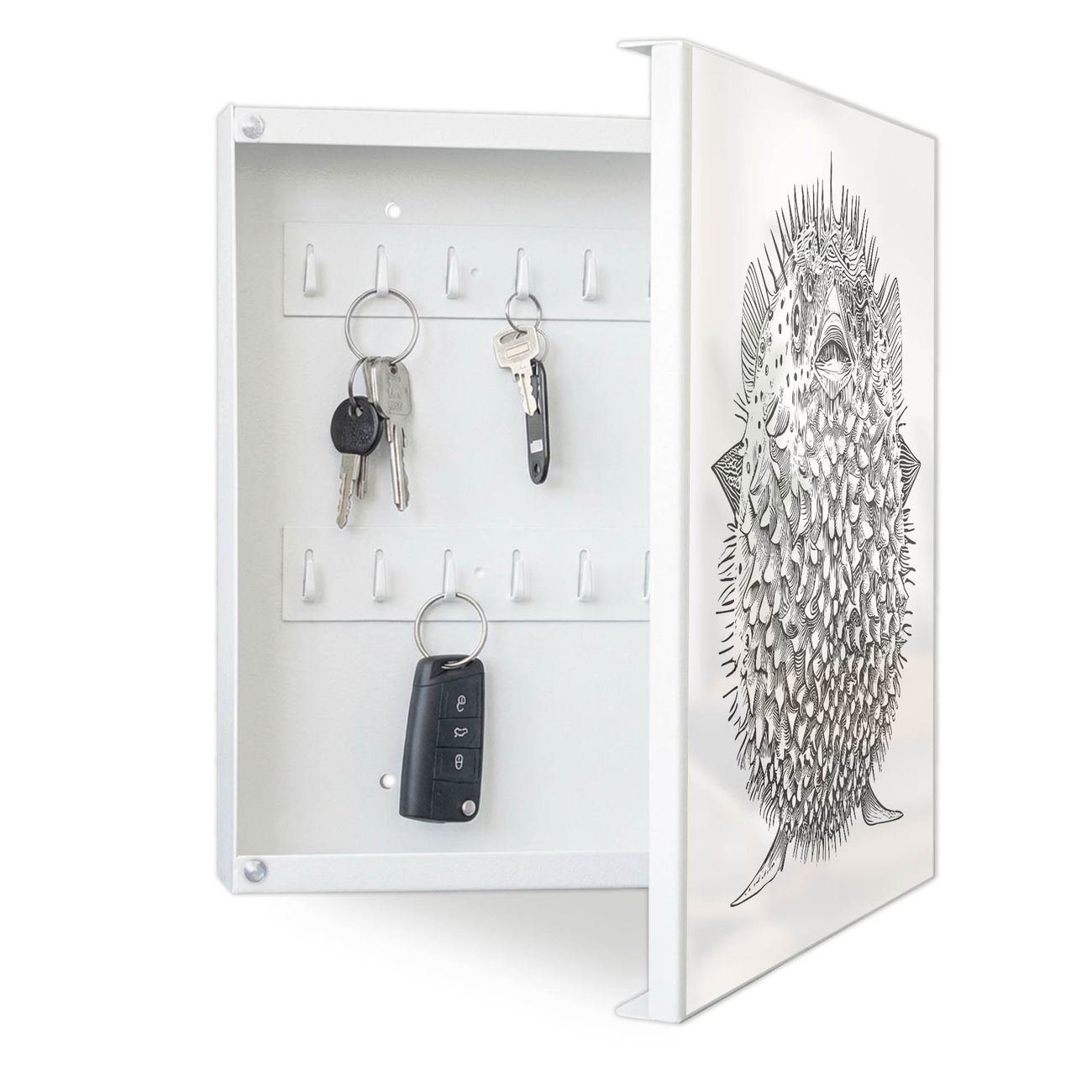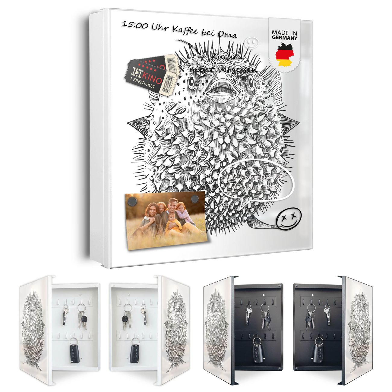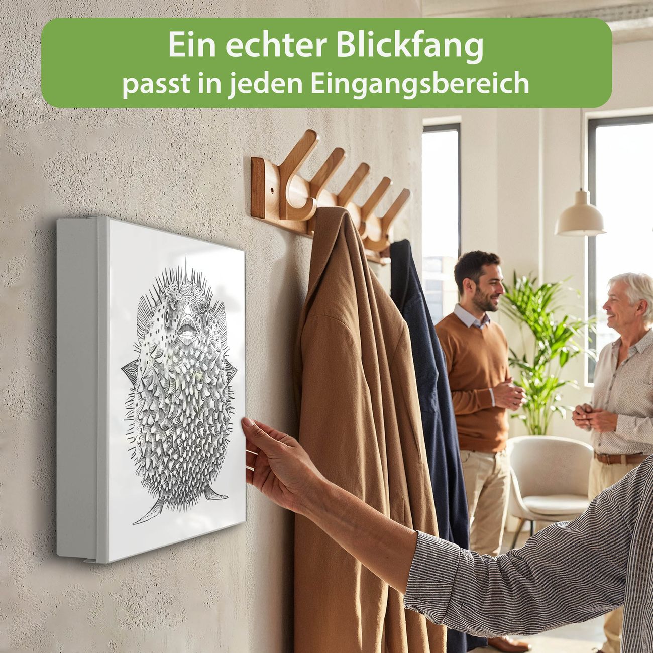 Bringe Ordnung und Eleganz in deinen Eingangsbereich mit dem banjado Schlüsselkasten Motiv Motiv Kugelfisch 2. Die moderne Schlüsselbox kombiniert funktionales Design mit hochwertiger Verarbeitung und wird so zu einem echten Hingucker in Flur, Büro oder Ferienwohnung. ✅ Stilvolle Schlüsselaufbewahrung mit Motiv Motiv Kugelfisch 2 Der Design-Schlüsselkasten Motiv Motiv Kugelfisch 2 bietet Platz für bis zu 32 Schlüssel, die auf 4 stabilen Reihen mit je 8 Haken übersichtlich verstaut werden. Mit seinen kompakten Maßen von 30 x 30 x 5 cm passt die Schlüsselbox perfekt auch in kleinere Räume. Der weiß lackierte Stahlkorpus mit rechts angeschlagenem Türscharnier harmoniert mit gedruckten Folie auf der Front und fügt sich nahtlos in jedes Wohnambiente ein. Ob als Schlüsselorganizer für Zuhause oder als praktische Lösung für Büros, Praxen und Gewerbe, der banjado Schlüsselkasten sorgt für Ordnung und Übersicht. Dank der magnetischen, mit Kreidestiften beschreibbaren Folie auf der Front kannst du Notizen anheften oder Termine direkt auf der Oberfläche festhalten. Die Schlüsselbox Motiv Motiv Kugelfisch 2 zur Wandmontage wird inklusive Befestigungsmaterial geliefert und ist schnell angebracht. So hast du deine Schlüssel jederzeit griffbereit und zugleich stilvoll verstaut. Mit diesem banjado Schlüsselkasten Motiv Motiv Kugelfisch 2 kombinierst du praktische Aufbewahrung mit stilvollem Wohndesign. Ob privat oder geschäftlich, die Schlüsselbox sorgt für mehr Ordnung, Übersicht und ein wohnliches Ambiente.Vorteile im Überblick