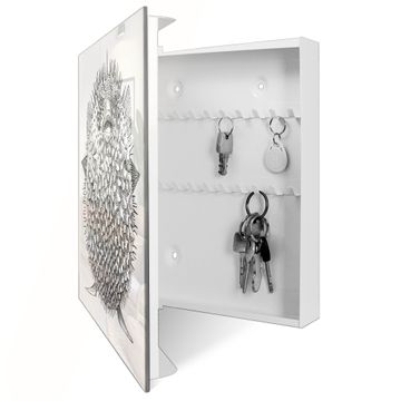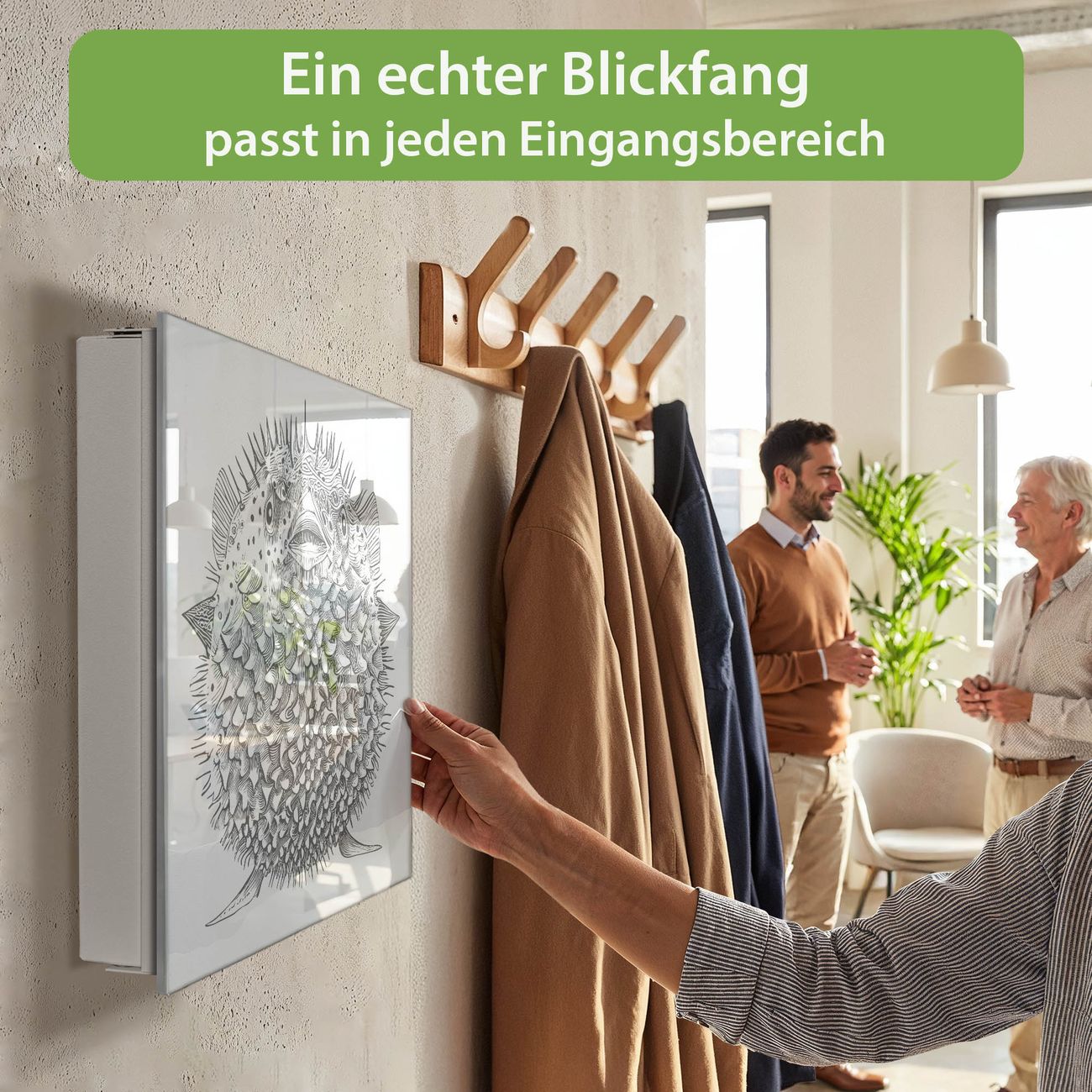 Bringe Ordnung und Eleganz in deinen Eingangsbereich mit dem banjado Schlüsselkasten Motiv Motiv Kugelfisch 2. Die moderne Schlüsselbox kombiniert funktionales Design mit hochwertiger Verarbeitung und wird so zu einem echten Hingucker in Flur, Büro oder Ferienwohnung. ✅ Stilvolle Schlüsselaufbewahrung mit Glasfront im Motiv Motiv Kugelfisch 2 Der Design-Schlüsselkasten Motiv Motiv Kugelfisch 2 bietet Platz für bis zu 50 Schlüssel, die auf 5 stabilen Reihen mit je 10 Haken übersichtlich verstaut werden. Mit seinen kompakten Maßen von 30 x 30 x 5 cm passt die Schlüsselbox perfekt auch in kleinere Räume. Der weiß lackierte Stahlkorpus mit rechts angeschlagenem Türscharnier harmoniert mit der Glasfront und fügt sich nahtlos in jedes Wohnambiente ein. Ob als Schlüsselorganizer für Zuhause oder als praktische Lösung für Büros, Praxen und Gewerbe, der banjado Schlüsselkasten sorgt für Ordnung und Übersicht. Dank der magnetischen, mit Kreidestiften beschreibbaren Glasfront kannst du Notizen anheften oder Termine direkt auf der Oberfläche festhalten. Die Schlüsselbox Motiv Motiv Kugelfisch 2 zur Wandmontage wird inklusive Befestigungsmaterial geliefert und ist schnell angebracht. So hast du deine Schlüssel jederzeit griffbereit und zugleich stilvoll verstaut. Mit diesem banjado Schlüsselkasten Motiv Motiv Kugelfisch 2 kombinierst du praktische Aufbewahrung mit stilvollem Wohndesign. Ob privat oder geschäftlich, die Schlüsselbox sorgt für mehr Ordnung, Übersicht und ein wohnliches Ambiente.Vorteile im Überblick