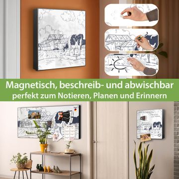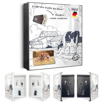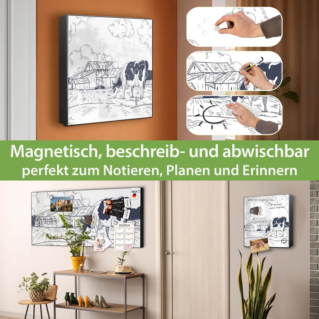 Bringe Ordnung und Eleganz in deinen Eingangsbereich mit dem banjado Schlüsselkasten Motiv Motiv Ländliche Idylle mit Kuh. Die moderne Schlüsselbox kombiniert funktionales Design mit hochwertiger Verarbeitung und wird so zu einem echten Hingucker in Flur, Büro oder Ferienwohnung. ✅ Stilvolle Schlüsselaufbewahrung mit Motiv Motiv Ländliche Idylle mit Kuh Der Design-Schlüsselkasten Motiv Motiv Ländliche Idylle mit Kuh bietet Platz für bis zu 32 Schlüssel, die auf 4 stabilen Reihen mit je 8 Haken übersichtlich verstaut werden. Mit seinen kompakten Maßen von 30 x 30 x 5 cm passt die Schlüsselbox perfekt auch in kleinere Räume. Der schwarz lackierte Stahlkorpus mit rechts angeschlagenem Türscharnier harmoniert mit gedruckten Folie auf der Front und fügt sich nahtlos in jedes Wohnambiente ein. Ob als Schlüsselorganizer für Zuhause oder als praktische Lösung für Büros, Praxen und Gewerbe, der banjado Schlüsselkasten sorgt für Ordnung und Übersicht. Dank der magnetischen, mit Kreidestiften beschreibbaren Folie auf der Front kannst du Notizen anheften oder Termine direkt auf der Oberfläche festhalten. Die Schlüsselbox Motiv Motiv Ländliche Idylle mit Kuh zur Wandmontage wird inklusive Befestigungsmaterial geliefert und ist schnell angebracht. So hast du deine Schlüssel jederzeit griffbereit und zugleich stilvoll verstaut. Mit diesem banjado Schlüsselkasten Motiv Motiv Ländliche Idylle mit Kuh kombinierst du praktische Aufbewahrung mit stilvollem Wohndesign. Ob privat oder geschäftlich, die Schlüsselbox sorgt für mehr Ordnung, Übersicht und ein wohnliches Ambiente.Vorteile im Überblick