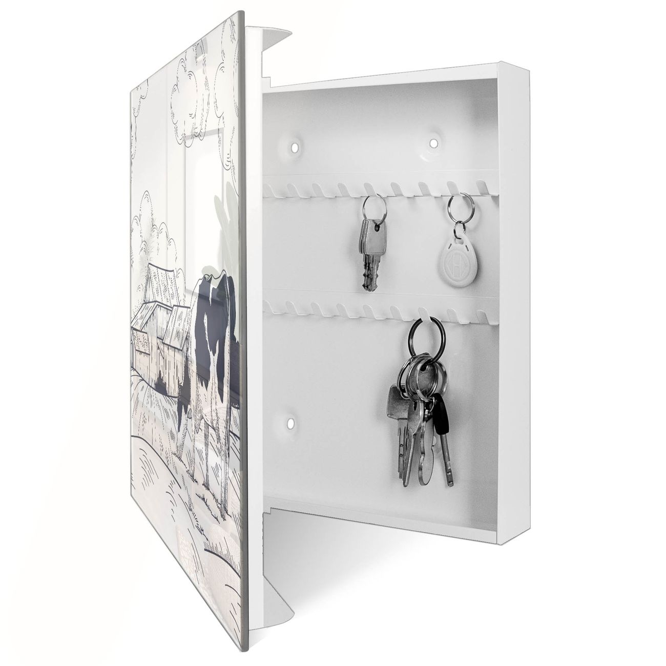 Bringe Ordnung und Eleganz in deinen Eingangsbereich mit dem banjado Schlüsselkasten Motiv Motiv Ländliche Idylle mit Kuh. Die moderne Schlüsselbox kombiniert funktionales Design mit hochwertiger Verarbeitung und wird so zu einem echten Hingucker in Flur, Büro oder Ferienwohnung. ✅ Stilvolle Schlüsselaufbewahrung mit Glasfront im Motiv Motiv Ländliche Idylle mit Kuh Der Design-Schlüsselkasten Motiv Motiv Ländliche Idylle mit Kuh bietet Platz für bis zu 50 Schlüssel, die auf 5 stabilen Reihen mit je 10 Haken übersichtlich verstaut werden. Mit seinen kompakten Maßen von 30 x 30 x 5 cm passt die Schlüsselbox perfekt auch in kleinere Räume. Der weiß lackierte Stahlkorpus mit rechts angeschlagenem Türscharnier harmoniert mit der Glasfront und fügt sich nahtlos in jedes Wohnambiente ein. Ob als Schlüsselorganizer für Zuhause oder als praktische Lösung für Büros, Praxen und Gewerbe, der banjado Schlüsselkasten sorgt für Ordnung und Übersicht. Dank der magnetischen, mit Kreidestiften beschreibbaren Glasfront kannst du Notizen anheften oder Termine direkt auf der Oberfläche festhalten. Die Schlüsselbox Motiv Motiv Ländliche Idylle mit Kuh zur Wandmontage wird inklusive Befestigungsmaterial geliefert und ist schnell angebracht. So hast du deine Schlüssel jederzeit griffbereit und zugleich stilvoll verstaut. Mit diesem banjado Schlüsselkasten Motiv Motiv Ländliche Idylle mit Kuh kombinierst du praktische Aufbewahrung mit stilvollem Wohndesign. Ob privat oder geschäftlich, die Schlüsselbox sorgt für mehr Ordnung, Übersicht und ein wohnliches Ambiente.Vorteile im Überblick