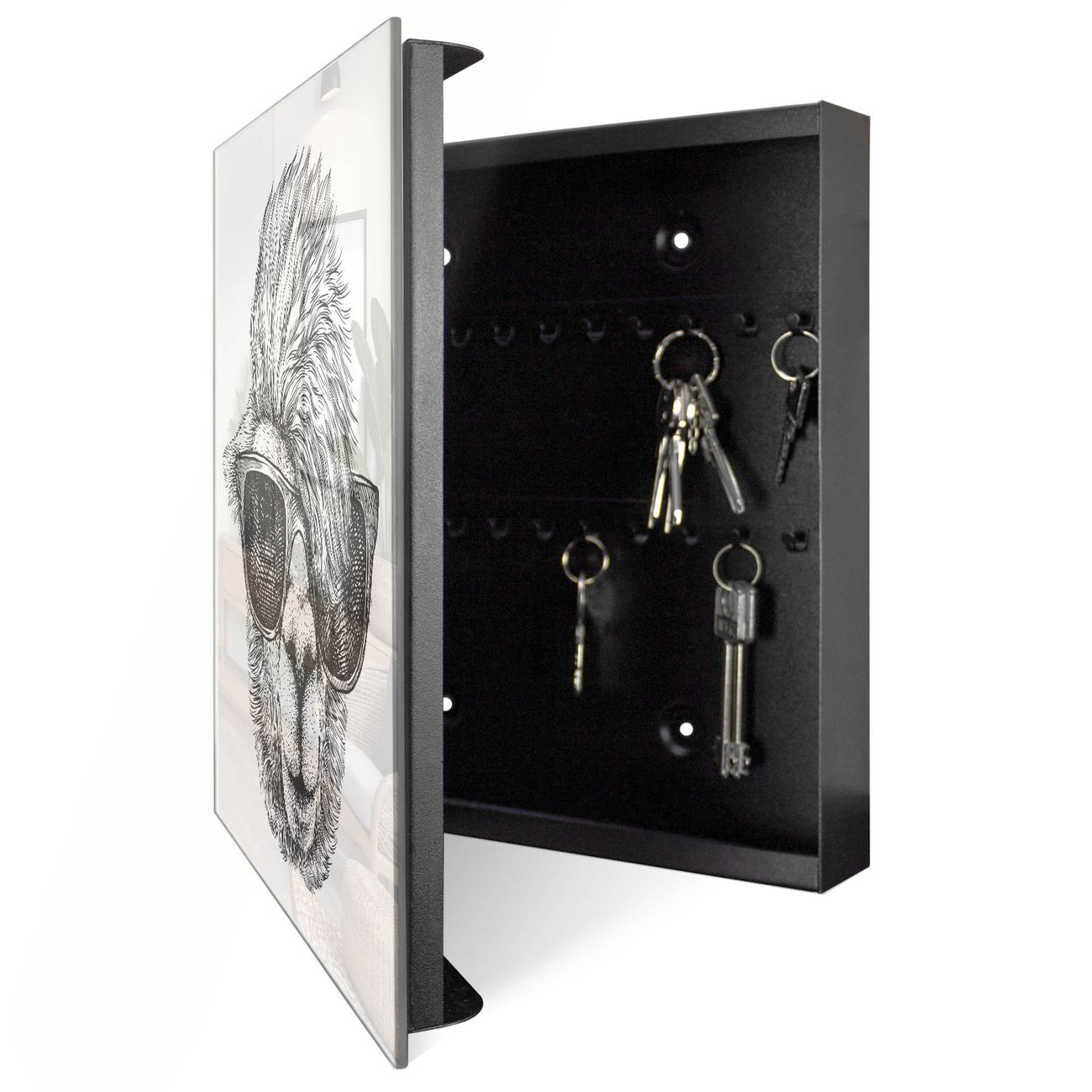 Bringe Ordnung und Eleganz in deinen Eingangsbereich mit dem banjado Schlüsselkasten Motiv Motiv Lama 2. Die moderne Schlüsselbox kombiniert funktionales Design mit hochwertiger Verarbeitung und wird so zu einem echten Hingucker in Flur, Büro oder Ferienwohnung. ✅ Stilvolle Schlüsselaufbewahrung mit Glasfront im Motiv Motiv Lama 2 Der Design-Schlüsselkasten Motiv Motiv Lama 2 bietet Platz für bis zu 50 Schlüssel, die auf 5 stabilen Reihen mit je 10 Haken übersichtlich verstaut werden. Mit seinen kompakten Maßen von 30 x 30 x 5 cm passt die Schlüsselbox perfekt auch in kleinere Räume. Der schwarz lackierte Stahlkorpus mit rechts angeschlagenem Türscharnier harmoniert mit der Glasfront und fügt sich nahtlos in jedes Wohnambiente ein. Ob als Schlüsselorganizer für Zuhause oder als praktische Lösung für Büros, Praxen und Gewerbe, der banjado Schlüsselkasten sorgt für Ordnung und Übersicht. Dank der magnetischen, mit Kreidestiften beschreibbaren Glasfront kannst du Notizen anheften oder Termine direkt auf der Oberfläche festhalten. Die Schlüsselbox Motiv Motiv Lama 2 zur Wandmontage wird inklusive Befestigungsmaterial geliefert und ist schnell angebracht. So hast du deine Schlüssel jederzeit griffbereit und zugleich stilvoll verstaut. Mit diesem banjado Schlüsselkasten Motiv Motiv Lama 2 kombinierst du praktische Aufbewahrung mit stilvollem Wohndesign. Ob privat oder geschäftlich, die Schlüsselbox sorgt für mehr Ordnung, Übersicht und ein wohnliches Ambiente.Vorteile im Überblick