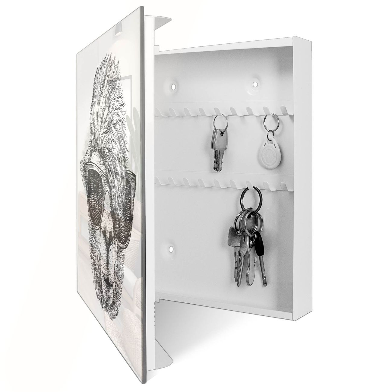 Bringe Ordnung und Eleganz in deinen Eingangsbereich mit dem banjado Schlüsselkasten Motiv Motiv Lama 2. Die moderne Schlüsselbox kombiniert funktionales Design mit hochwertiger Verarbeitung und wird so zu einem echten Hingucker in Flur, Büro oder Ferienwohnung. ✅ Stilvolle Schlüsselaufbewahrung mit Glasfront im Motiv Motiv Lama 2 Der Design-Schlüsselkasten Motiv Motiv Lama 2 bietet Platz für bis zu 50 Schlüssel, die auf 5 stabilen Reihen mit je 10 Haken übersichtlich verstaut werden. Mit seinen kompakten Maßen von 30 x 30 x 5 cm passt die Schlüsselbox perfekt auch in kleinere Räume. Der weiß lackierte Stahlkorpus mit rechts angeschlagenem Türscharnier harmoniert mit der Glasfront und fügt sich nahtlos in jedes Wohnambiente ein. Ob als Schlüsselorganizer für Zuhause oder als praktische Lösung für Büros, Praxen und Gewerbe, der banjado Schlüsselkasten sorgt für Ordnung und Übersicht. Dank der magnetischen, mit Kreidestiften beschreibbaren Glasfront kannst du Notizen anheften oder Termine direkt auf der Oberfläche festhalten. Die Schlüsselbox Motiv Motiv Lama 2 zur Wandmontage wird inklusive Befestigungsmaterial geliefert und ist schnell angebracht. So hast du deine Schlüssel jederzeit griffbereit und zugleich stilvoll verstaut. Mit diesem banjado Schlüsselkasten Motiv Motiv Lama 2 kombinierst du praktische Aufbewahrung mit stilvollem Wohndesign. Ob privat oder geschäftlich, die Schlüsselbox sorgt für mehr Ordnung, Übersicht und ein wohnliches Ambiente.Vorteile im Überblick