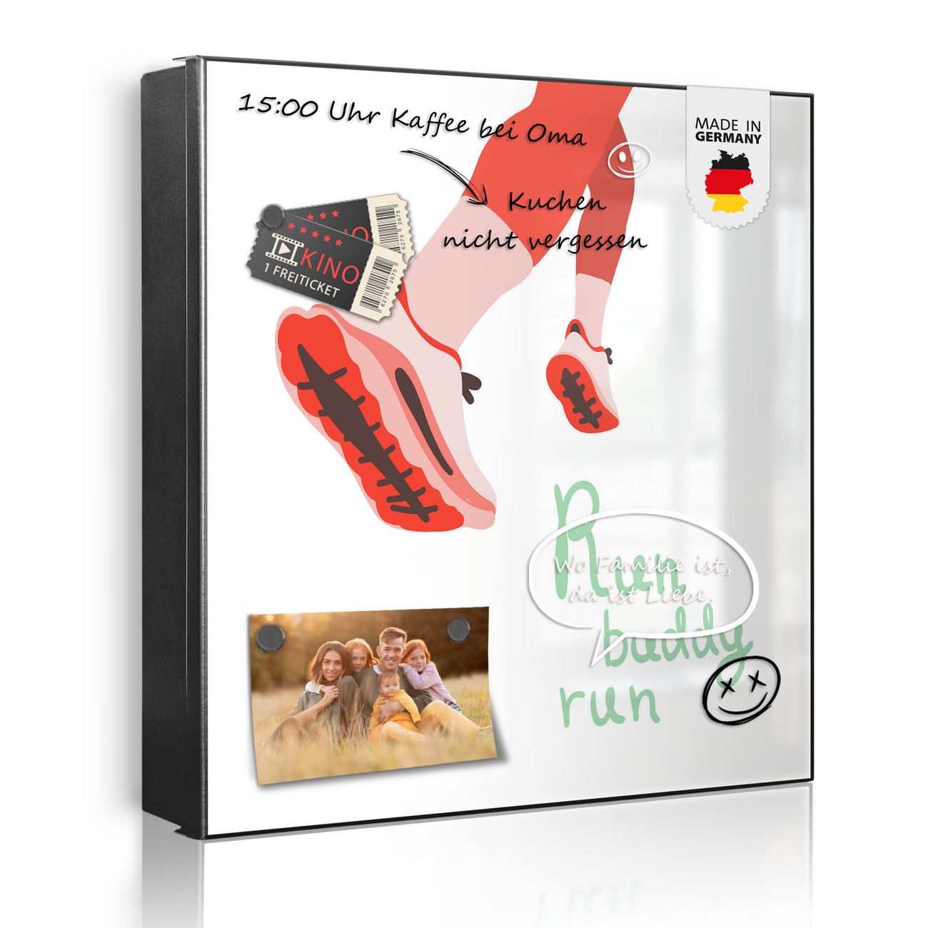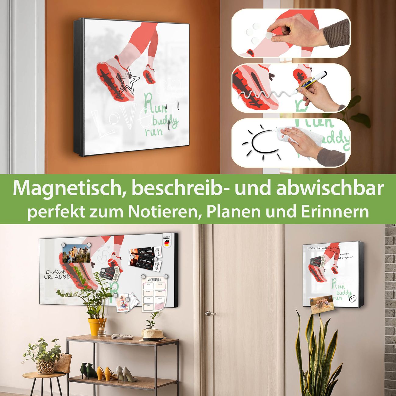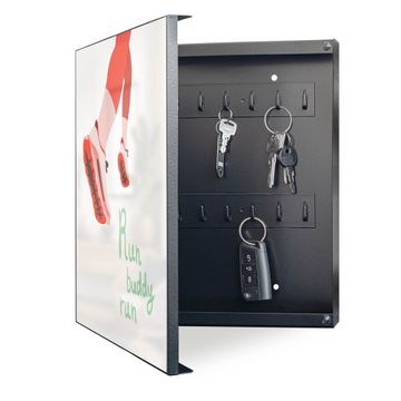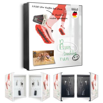 Bringe Ordnung und Eleganz in deinen Eingangsbereich mit dem banjado Schlüsselkasten Motiv Motiv Laufschuh Bewegung. Die moderne Schlüsselbox kombiniert funktionales Design mit hochwertiger Verarbeitung und wird so zu einem echten Hingucker in Flur, Büro oder Ferienwohnung. ✅ Stilvolle Schlüsselaufbewahrung mit Motiv Motiv Laufschuh Bewegung Der Design-Schlüsselkasten Motiv Motiv Laufschuh Bewegung bietet Platz für bis zu 32 Schlüssel, die auf 4 stabilen Reihen mit je 8 Haken übersichtlich verstaut werden. Mit seinen kompakten Maßen von 30 x 30 x 5 cm passt die Schlüsselbox perfekt auch in kleinere Räume. Der schwarz lackierte Stahlkorpus mit links angeschlagenem Türscharnier harmoniert mit gedruckten Folie auf der Front und fügt sich nahtlos in jedes Wohnambiente ein. Ob als Schlüsselorganizer für Zuhause oder als praktische Lösung für Büros, Praxen und Gewerbe, der banjado Schlüsselkasten sorgt für Ordnung und Übersicht. Dank der magnetischen, mit Kreidestiften beschreibbaren Folie auf der Front kannst du Notizen anheften oder Termine direkt auf der Oberfläche festhalten. Die Schlüsselbox Motiv Motiv Laufschuh Bewegung zur Wandmontage wird inklusive Befestigungsmaterial geliefert und ist schnell angebracht. So hast du deine Schlüssel jederzeit griffbereit und zugleich stilvoll verstaut. Mit diesem banjado Schlüsselkasten Motiv Motiv Laufschuh Bewegung kombinierst du praktische Aufbewahrung mit stilvollem Wohndesign. Ob privat oder geschäftlich, die Schlüsselbox sorgt für mehr Ordnung, Übersicht und ein wohnliches Ambiente.Vorteile im Überblick
