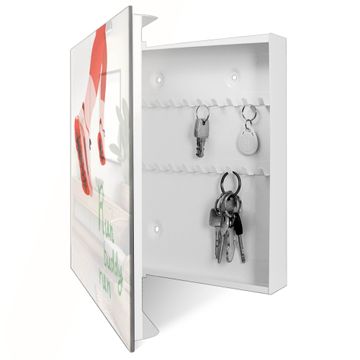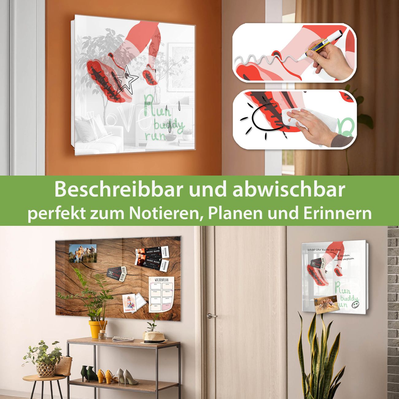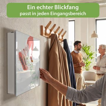 Bringe Ordnung und Eleganz in deinen Eingangsbereich mit dem banjado Schlüsselkasten Motiv Motiv Laufschuh Bewegung. Die moderne Schlüsselbox kombiniert funktionales Design mit hochwertiger Verarbeitung und wird so zu einem echten Hingucker in Flur, Büro oder Ferienwohnung. ✅ Stilvolle Schlüsselaufbewahrung mit Glasfront im Motiv Motiv Laufschuh Bewegung Der Design-Schlüsselkasten Motiv Motiv Laufschuh Bewegung bietet Platz für bis zu 50 Schlüssel, die auf 5 stabilen Reihen mit je 10 Haken übersichtlich verstaut werden. Mit seinen kompakten Maßen von 30 x 30 x 5 cm passt die Schlüsselbox perfekt auch in kleinere Räume. Der weiß lackierte Stahlkorpus mit rechts angeschlagenem Türscharnier harmoniert mit der Glasfront und fügt sich nahtlos in jedes Wohnambiente ein. Ob als Schlüsselorganizer für Zuhause oder als praktische Lösung für Büros, Praxen und Gewerbe, der banjado Schlüsselkasten sorgt für Ordnung und Übersicht. Dank der magnetischen, mit Kreidestiften beschreibbaren Glasfront kannst du Notizen anheften oder Termine direkt auf der Oberfläche festhalten. Die Schlüsselbox Motiv Motiv Laufschuh Bewegung zur Wandmontage wird inklusive Befestigungsmaterial geliefert und ist schnell angebracht. So hast du deine Schlüssel jederzeit griffbereit und zugleich stilvoll verstaut. Mit diesem banjado Schlüsselkasten Motiv Motiv Laufschuh Bewegung kombinierst du praktische Aufbewahrung mit stilvollem Wohndesign. Ob privat oder geschäftlich, die Schlüsselbox sorgt für mehr Ordnung, Übersicht und ein wohnliches Ambiente.Vorteile im Überblick