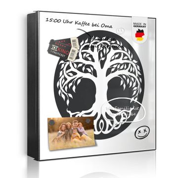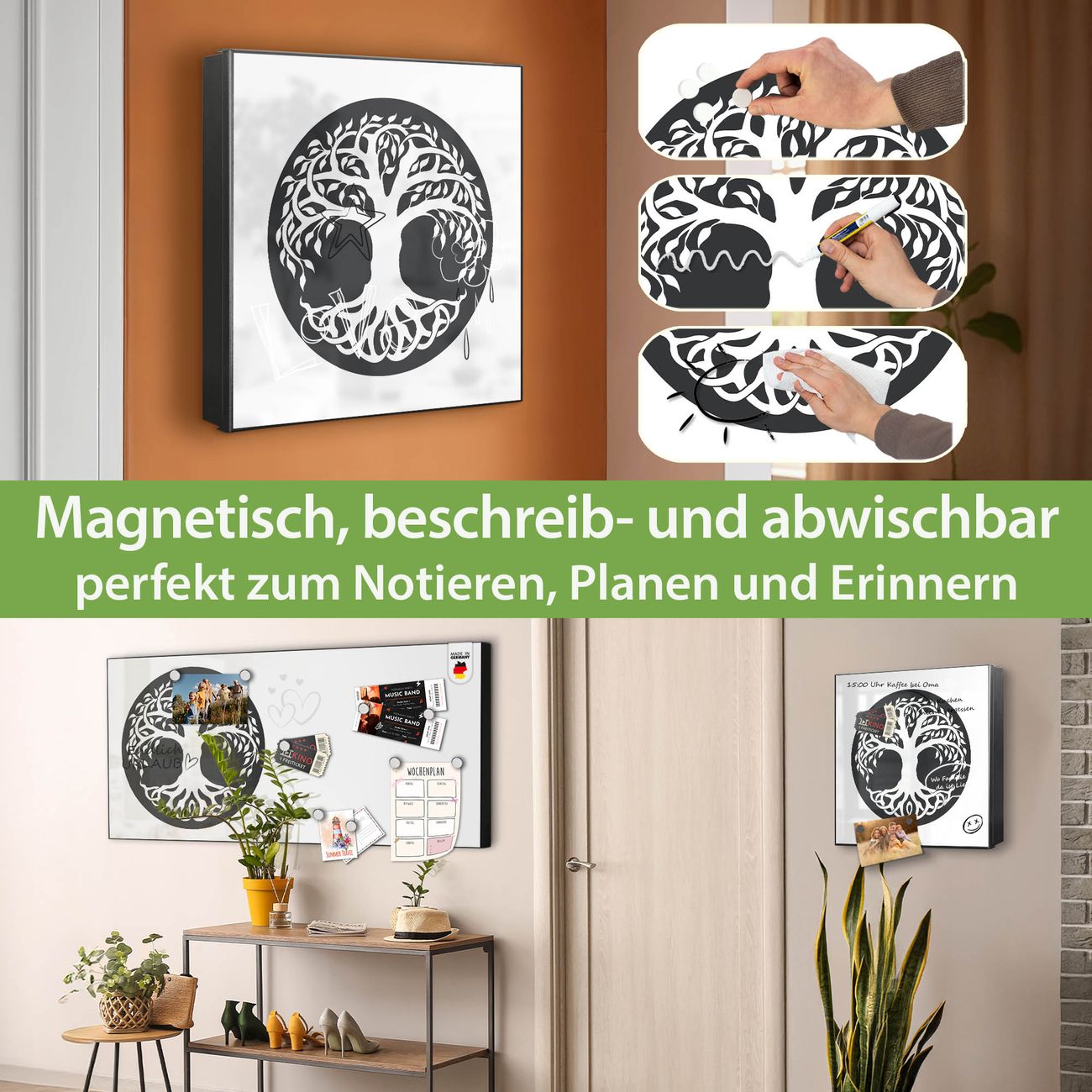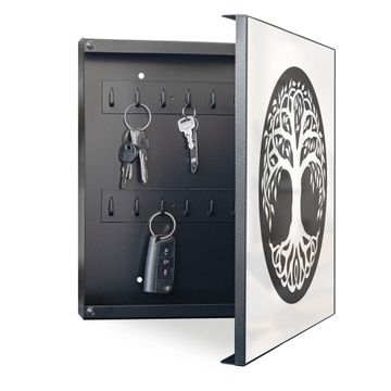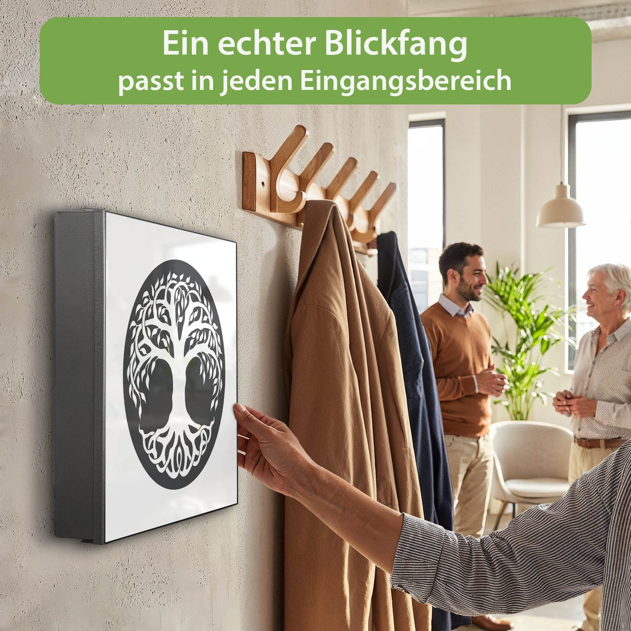 Bringe Ordnung und Eleganz in deinen Eingangsbereich mit dem banjado Schlüsselkasten Motiv Motiv Lebensbaum Silhouette. Die moderne Schlüsselbox kombiniert funktionales Design mit hochwertiger Verarbeitung und wird so zu einem echten Hingucker in Flur, Büro oder Ferienwohnung. ✅ Stilvolle Schlüsselaufbewahrung mit Motiv Motiv Lebensbaum Silhouette Der Design-Schlüsselkasten Motiv Motiv Lebensbaum Silhouette bietet Platz für bis zu 32 Schlüssel, die auf 4 stabilen Reihen mit je 8 Haken übersichtlich verstaut werden. Mit seinen kompakten Maßen von 30 x 30 x 5 cm passt die Schlüsselbox perfekt auch in kleinere Räume. Der schwarz lackierte Stahlkorpus mit rechts angeschlagenem Türscharnier harmoniert mit gedruckten Folie auf der Front und fügt sich nahtlos in jedes Wohnambiente ein. Ob als Schlüsselorganizer für Zuhause oder als praktische Lösung für Büros, Praxen und Gewerbe, der banjado Schlüsselkasten sorgt für Ordnung und Übersicht. Dank der magnetischen, mit Kreidestiften beschreibbaren Folie auf der Front kannst du Notizen anheften oder Termine direkt auf der Oberfläche festhalten. Die Schlüsselbox Motiv Motiv Lebensbaum Silhouette zur Wandmontage wird inklusive Befestigungsmaterial geliefert und ist schnell angebracht. So hast du deine Schlüssel jederzeit griffbereit und zugleich stilvoll verstaut. Mit diesem banjado Schlüsselkasten Motiv Motiv Lebensbaum Silhouette kombinierst du praktische Aufbewahrung mit stilvollem Wohndesign. Ob privat oder geschäftlich, die Schlüsselbox sorgt für mehr Ordnung, Übersicht und ein wohnliches Ambiente.Vorteile im Überblick