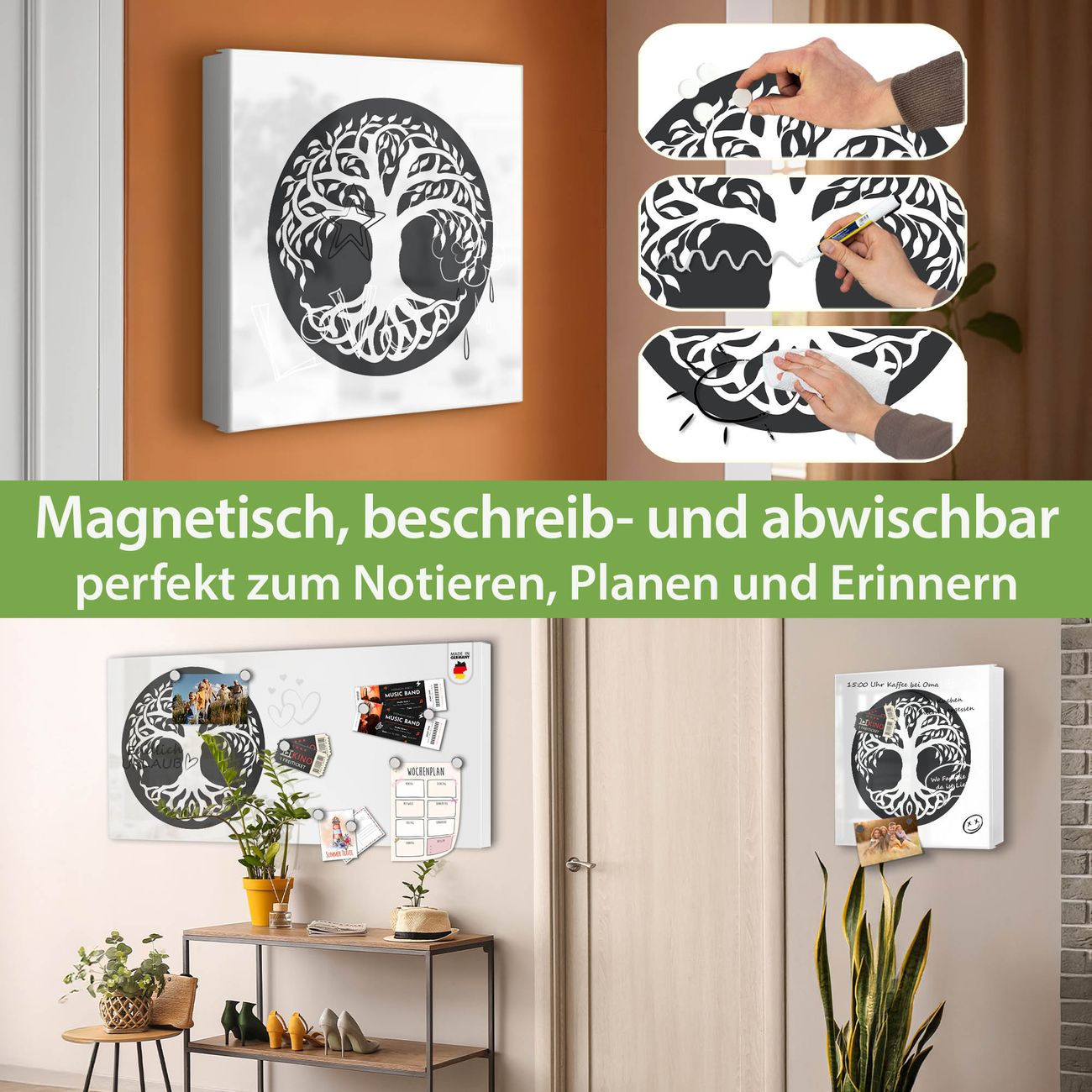Bringe Ordnung und Eleganz in deinen Eingangsbereich mit dem banjado Schlüsselkasten Motiv Motiv Lebensbaum Silhouette. Die moderne Schlüsselbox kombiniert funktionales Design mit hochwertiger Verarbeitung und wird so zu einem echten Hingucker in Flur, Büro oder Ferienwohnung. ✅ Stilvolle Schlüsselaufbewahrung mit Motiv Motiv Lebensbaum Silhouette Der Design-Schlüsselkasten Motiv Motiv Lebensbaum Silhouette bietet Platz für bis zu 32 Schlüssel, die auf 4 stabilen Reihen mit je 8 Haken übersichtlich verstaut werden. Mit seinen kompakten Maßen von 30 x 30 x 5 cm passt die Schlüsselbox perfekt auch in kleinere Räume. Der weiß lackierte Stahlkorpus mit rechts angeschlagenem Türscharnier harmoniert mit gedruckten Folie auf der Front und fügt sich nahtlos in jedes Wohnambiente ein. Ob als Schlüsselorganizer für Zuhause oder als praktische Lösung für Büros, Praxen und Gewerbe, der banjado Schlüsselkasten sorgt für Ordnung und Übersicht. Dank der magnetischen, mit Kreidestiften beschreibbaren Folie auf der Front kannst du Notizen anheften oder Termine direkt auf der Oberfläche festhalten. Die Schlüsselbox Motiv Motiv Lebensbaum Silhouette zur Wandmontage wird inklusive Befestigungsmaterial geliefert und ist schnell angebracht. So hast du deine Schlüssel jederzeit griffbereit und zugleich stilvoll verstaut. Mit diesem banjado Schlüsselkasten Motiv Motiv Lebensbaum Silhouette kombinierst du praktische Aufbewahrung mit stilvollem Wohndesign. Ob privat oder geschäftlich, die Schlüsselbox sorgt für mehr Ordnung, Übersicht und ein wohnliches Ambiente.Vorteile im Überblick