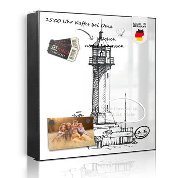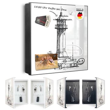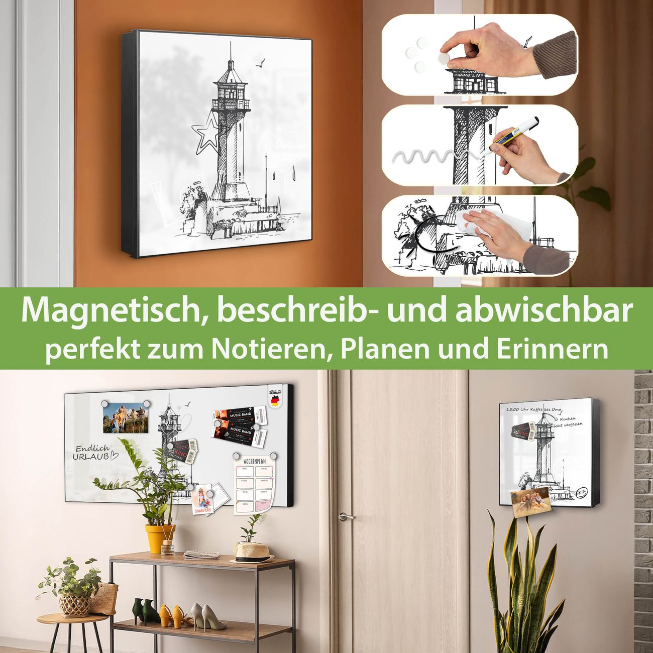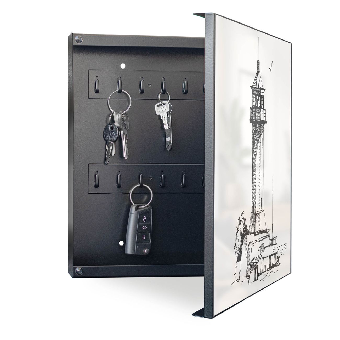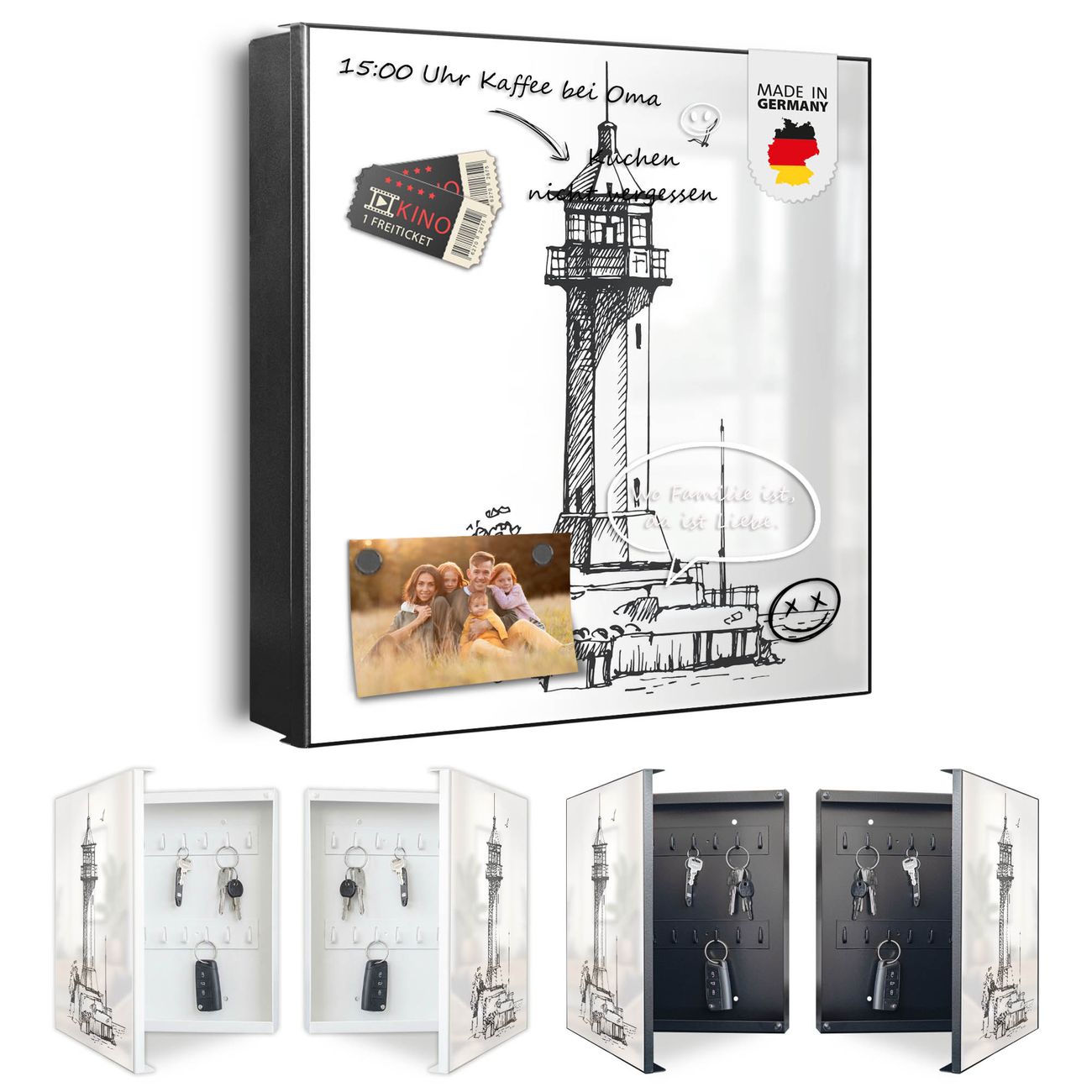 Bringe Ordnung und Eleganz in deinen Eingangsbereich mit dem banjado Schlüsselkasten Motiv Motiv Leuchtturm 10. Die moderne Schlüsselbox kombiniert funktionales Design mit hochwertiger Verarbeitung und wird so zu einem echten Hingucker in Flur, Büro oder Ferienwohnung. ✅ Stilvolle Schlüsselaufbewahrung mit Motiv Motiv Leuchtturm 10 Der Design-Schlüsselkasten Motiv Motiv Leuchtturm 10 bietet Platz für bis zu 32 Schlüssel, die auf 4 stabilen Reihen mit je 8 Haken übersichtlich verstaut werden. Mit seinen kompakten Maßen von 30 x 30 x 5 cm passt die Schlüsselbox perfekt auch in kleinere Räume. Der schwarz lackierte Stahlkorpus mit rechts angeschlagenem Türscharnier harmoniert mit gedruckten Folie auf der Front und fügt sich nahtlos in jedes Wohnambiente ein. Ob als Schlüsselorganizer für Zuhause oder als praktische Lösung für Büros, Praxen und Gewerbe, der banjado Schlüsselkasten sorgt für Ordnung und Übersicht. Dank der magnetischen, mit Kreidestiften beschreibbaren Folie auf der Front kannst du Notizen anheften oder Termine direkt auf der Oberfläche festhalten. Die Schlüsselbox Motiv Motiv Leuchtturm 10 zur Wandmontage wird inklusive Befestigungsmaterial geliefert und ist schnell angebracht. So hast du deine Schlüssel jederzeit griffbereit und zugleich stilvoll verstaut. Mit diesem banjado Schlüsselkasten Motiv Motiv Leuchtturm 10 kombinierst du praktische Aufbewahrung mit stilvollem Wohndesign. Ob privat oder geschäftlich, die Schlüsselbox sorgt für mehr Ordnung, Übersicht und ein wohnliches Ambiente.Vorteile im Überblick