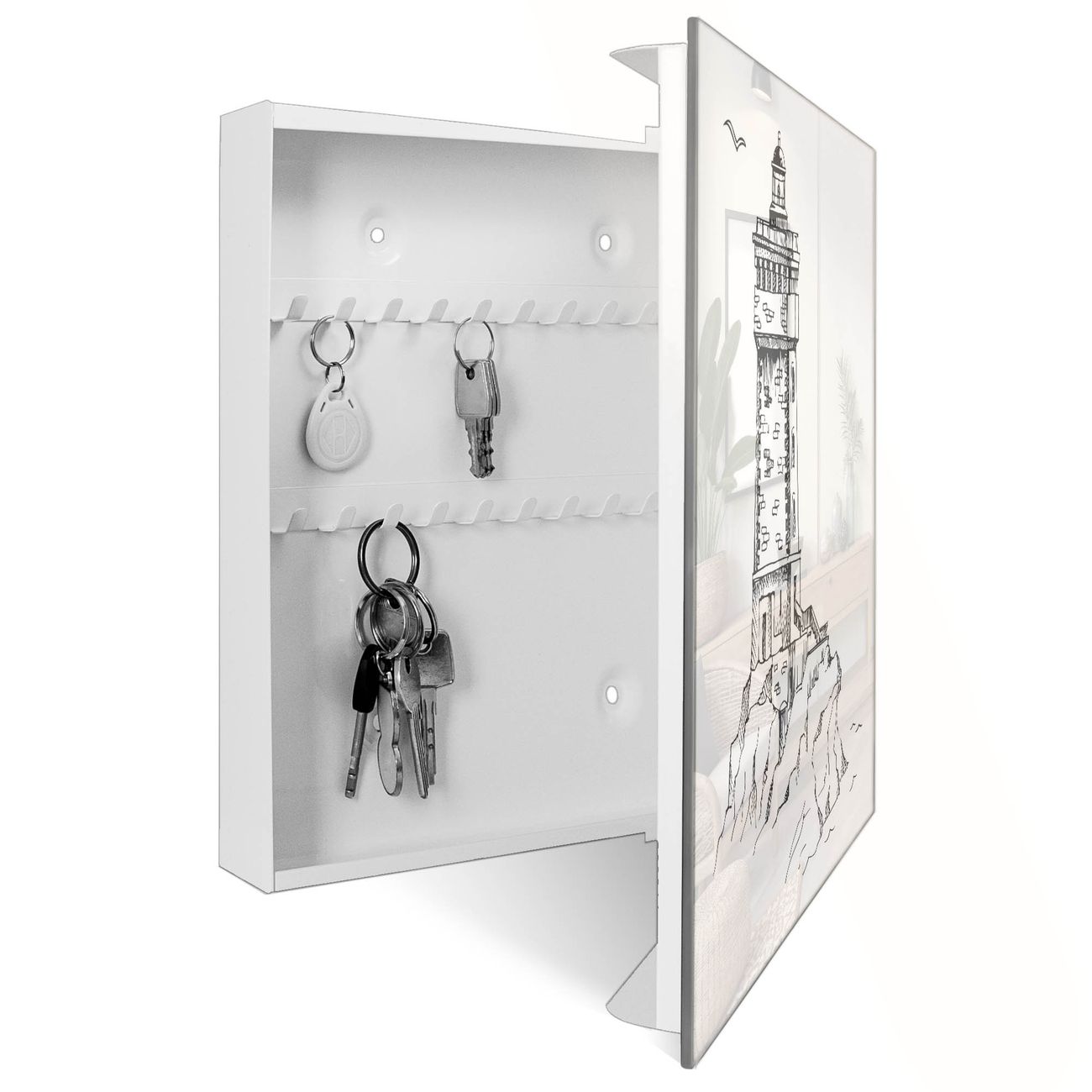 Bringe Ordnung und Eleganz in deinen Eingangsbereich mit dem banjado Schlüsselkasten Motiv Motiv Leuchtturm 8. Die moderne Schlüsselbox kombiniert funktionales Design mit hochwertiger Verarbeitung und wird so zu einem echten Hingucker in Flur, Büro oder Ferienwohnung. ✅ Stilvolle Schlüsselaufbewahrung mit Glasfront im Motiv Motiv Leuchtturm 8 Der Design-Schlüsselkasten Motiv Motiv Leuchtturm 8 bietet Platz für bis zu 50 Schlüssel, die auf 5 stabilen Reihen mit je 10 Haken übersichtlich verstaut werden. Mit seinen kompakten Maßen von 30 x 30 x 5 cm passt die Schlüsselbox perfekt auch in kleinere Räume. Der weiß lackierte Stahlkorpus mit rechts angeschlagenem Türscharnier harmoniert mit der Glasfront und fügt sich nahtlos in jedes Wohnambiente ein. Ob als Schlüsselorganizer für Zuhause oder als praktische Lösung für Büros, Praxen und Gewerbe, der banjado Schlüsselkasten sorgt für Ordnung und Übersicht. Dank der magnetischen, mit Kreidestiften beschreibbaren Glasfront kannst du Notizen anheften oder Termine direkt auf der Oberfläche festhalten. Die Schlüsselbox Motiv Motiv Leuchtturm 8 zur Wandmontage wird inklusive Befestigungsmaterial geliefert und ist schnell angebracht. So hast du deine Schlüssel jederzeit griffbereit und zugleich stilvoll verstaut. Mit diesem banjado Schlüsselkasten Motiv Motiv Leuchtturm 8 kombinierst du praktische Aufbewahrung mit stilvollem Wohndesign. Ob privat oder geschäftlich, die Schlüsselbox sorgt für mehr Ordnung, Übersicht und ein wohnliches Ambiente.Vorteile im Überblick