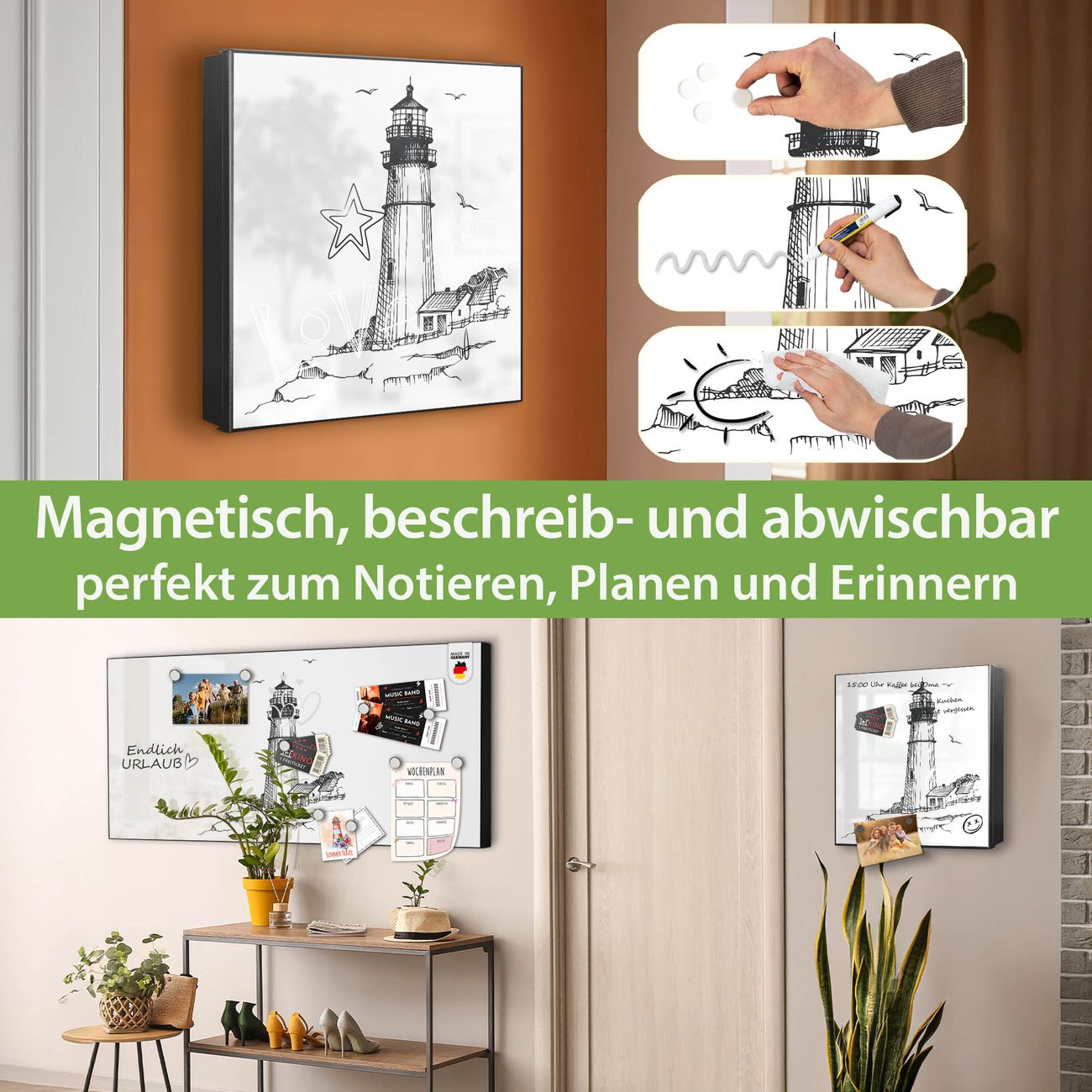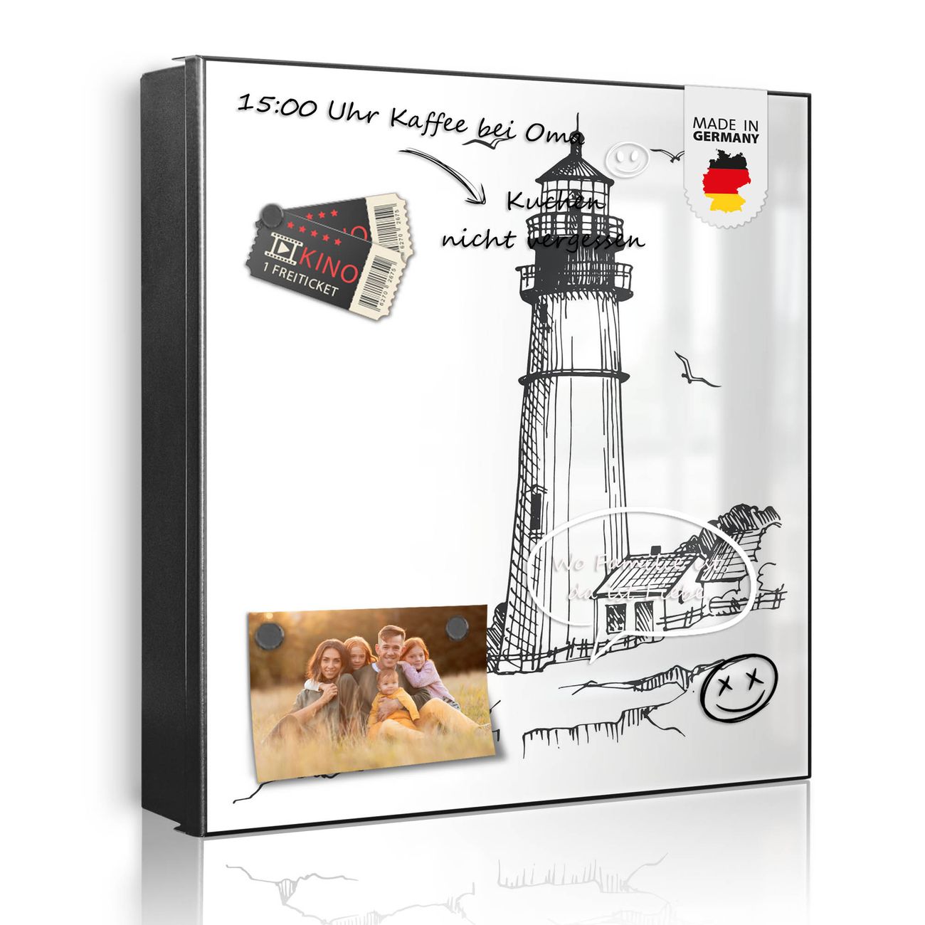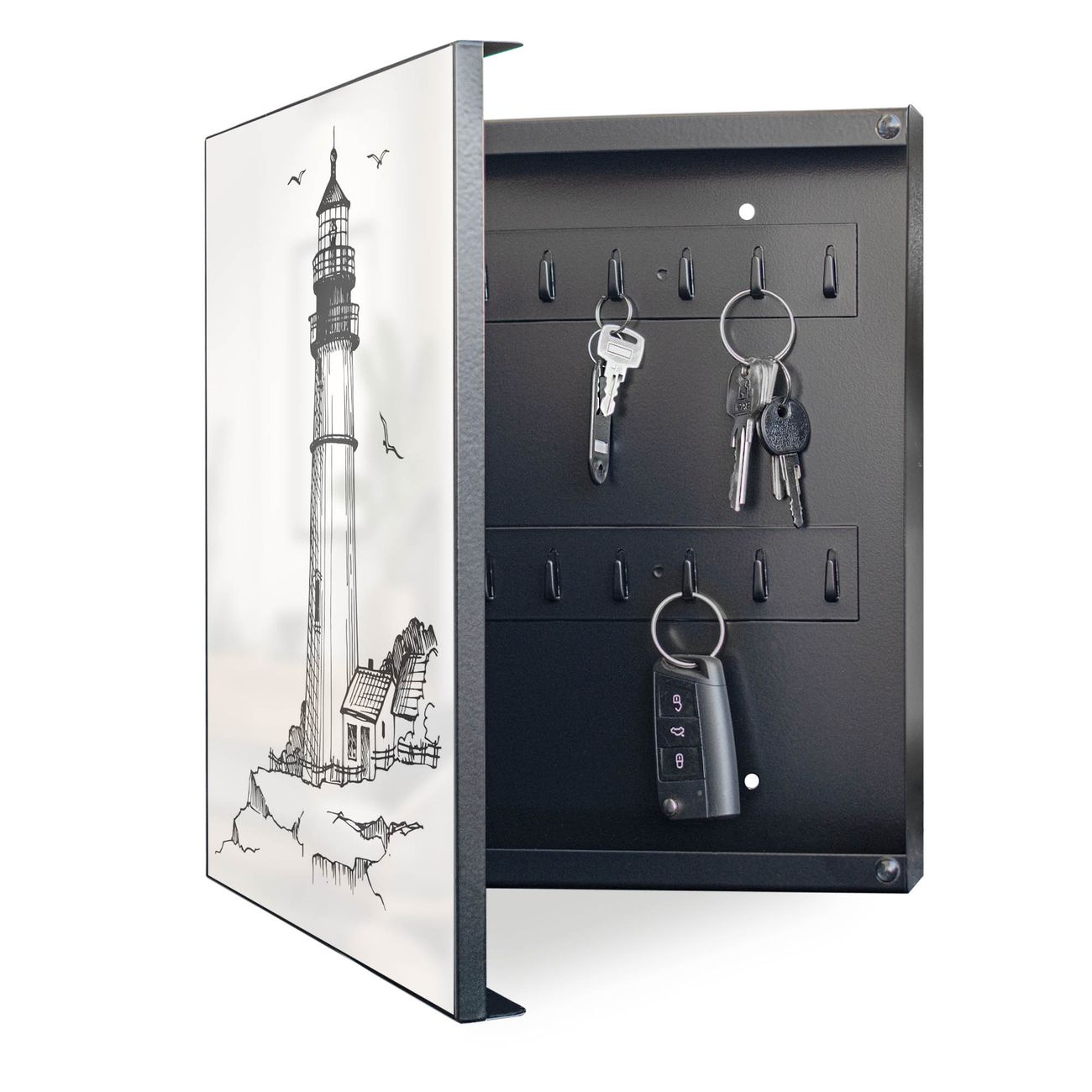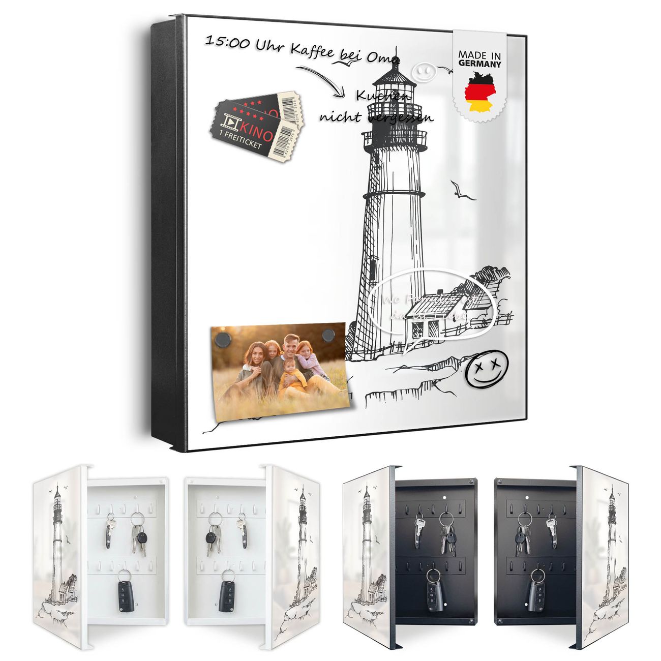 Bringe Ordnung und Eleganz in deinen Eingangsbereich mit dem banjado Schlüsselkasten Motiv Motiv Leuchtturm 9. Die moderne Schlüsselbox kombiniert funktionales Design mit hochwertiger Verarbeitung und wird so zu einem echten Hingucker in Flur, Büro oder Ferienwohnung. ✅ Stilvolle Schlüsselaufbewahrung mit Motiv Motiv Leuchtturm 9 Der Design-Schlüsselkasten Motiv Motiv Leuchtturm 9 bietet Platz für bis zu 32 Schlüssel, die auf 4 stabilen Reihen mit je 8 Haken übersichtlich verstaut werden. Mit seinen kompakten Maßen von 30 x 30 x 5 cm passt die Schlüsselbox perfekt auch in kleinere Räume. Der schwarz lackierte Stahlkorpus mit links angeschlagenem Türscharnier harmoniert mit gedruckten Folie auf der Front und fügt sich nahtlos in jedes Wohnambiente ein. Ob als Schlüsselorganizer für Zuhause oder als praktische Lösung für Büros, Praxen und Gewerbe, der banjado Schlüsselkasten sorgt für Ordnung und Übersicht. Dank der magnetischen, mit Kreidestiften beschreibbaren Folie auf der Front kannst du Notizen anheften oder Termine direkt auf der Oberfläche festhalten. Die Schlüsselbox Motiv Motiv Leuchtturm 9 zur Wandmontage wird inklusive Befestigungsmaterial geliefert und ist schnell angebracht. So hast du deine Schlüssel jederzeit griffbereit und zugleich stilvoll verstaut. Mit diesem banjado Schlüsselkasten Motiv Motiv Leuchtturm 9 kombinierst du praktische Aufbewahrung mit stilvollem Wohndesign. Ob privat oder geschäftlich, die Schlüsselbox sorgt für mehr Ordnung, Übersicht und ein wohnliches Ambiente.Vorteile im Überblick