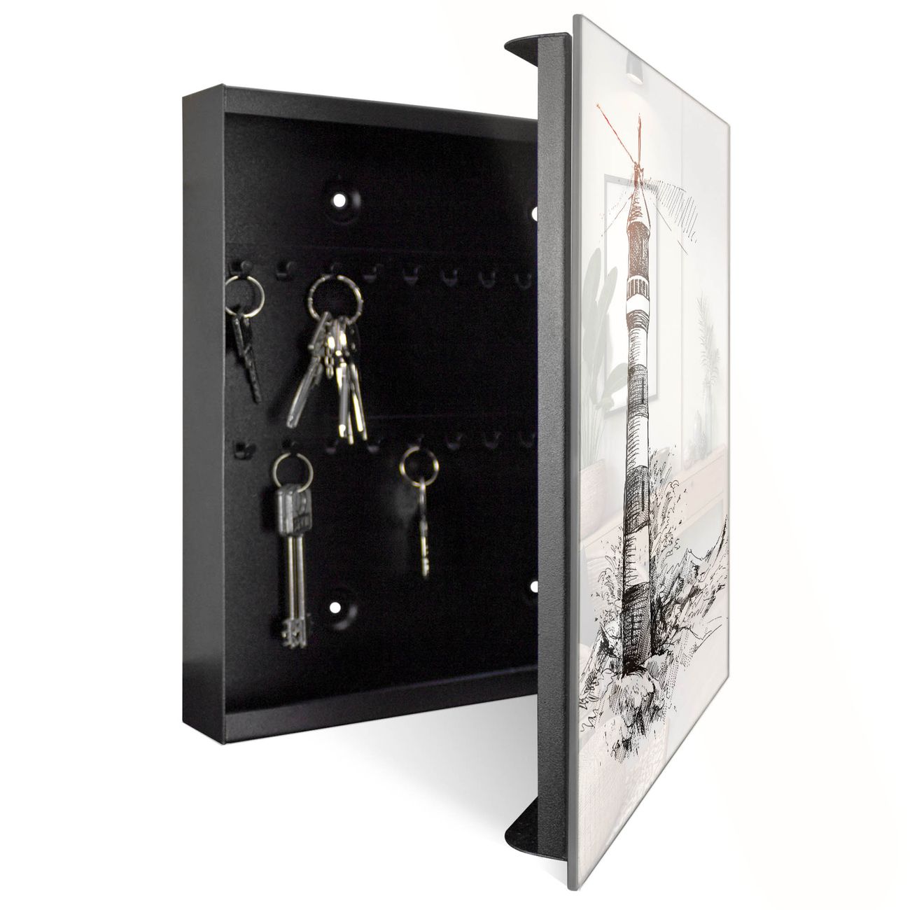 Bringe Ordnung und Eleganz in deinen Eingangsbereich mit dem banjado Schlüsselkasten Motiv Motiv Leuchtturm in der Brandung. Die moderne Schlüsselbox kombiniert funktionales Design mit hochwertiger Verarbeitung und wird so zu einem echten Hingucker in Flur, Büro oder Ferienwohnung. ✅ Stilvolle Schlüsselaufbewahrung mit Glasfront im Motiv Motiv Leuchtturm in der Brandung Der Design-Schlüsselkasten Motiv Motiv Leuchtturm in der Brandung bietet Platz für bis zu 50 Schlüssel, die auf 5 stabilen Reihen mit je 10 Haken übersichtlich verstaut werden. Mit seinen kompakten Maßen von 30 x 30 x 5 cm passt die Schlüsselbox perfekt auch in kleinere Räume. Der schwarz lackierte Stahlkorpus mit rechts angeschlagenem Türscharnier harmoniert mit der Glasfront und fügt sich nahtlos in jedes Wohnambiente ein. Ob als Schlüsselorganizer für Zuhause oder als praktische Lösung für Büros, Praxen und Gewerbe, der banjado Schlüsselkasten sorgt für Ordnung und Übersicht. Dank der magnetischen, mit Kreidestiften beschreibbaren Glasfront kannst du Notizen anheften oder Termine direkt auf der Oberfläche festhalten. Die Schlüsselbox Motiv Motiv Leuchtturm in der Brandung zur Wandmontage wird inklusive Befestigungsmaterial geliefert und ist schnell angebracht. So hast du deine Schlüssel jederzeit griffbereit und zugleich stilvoll verstaut. Mit diesem banjado Schlüsselkasten Motiv Motiv Leuchtturm in der Brandung kombinierst du praktische Aufbewahrung mit stilvollem Wohndesign. Ob privat oder geschäftlich, die Schlüsselbox sorgt für mehr Ordnung, Übersicht und ein wohnliches Ambiente.Vorteile im Überblick