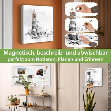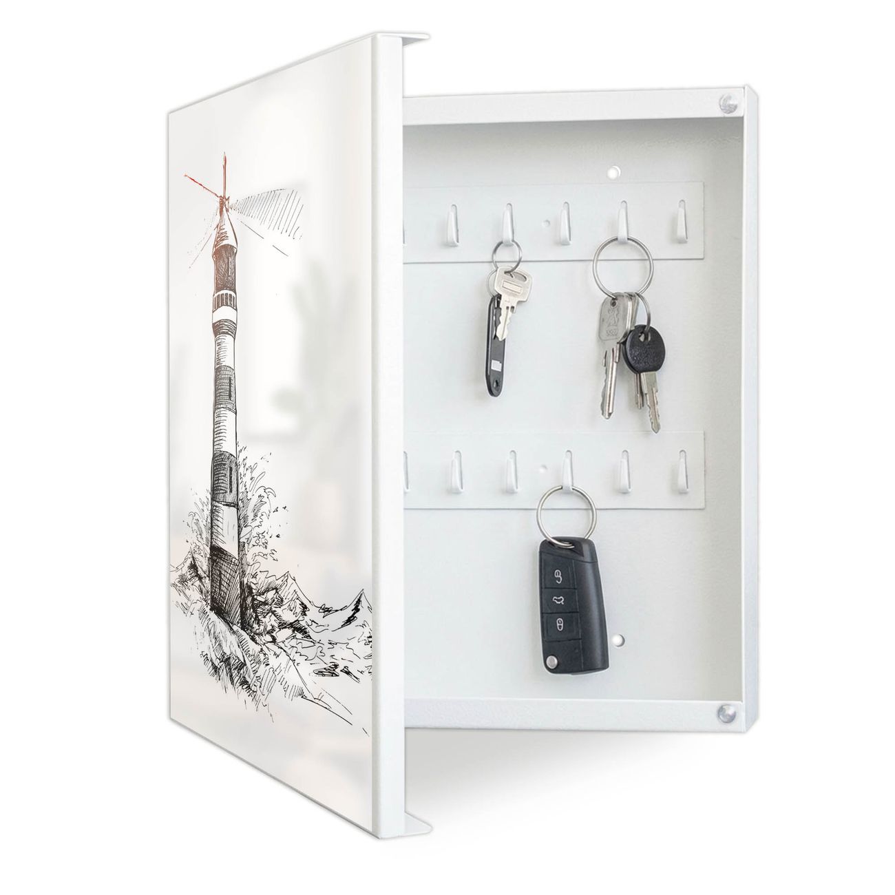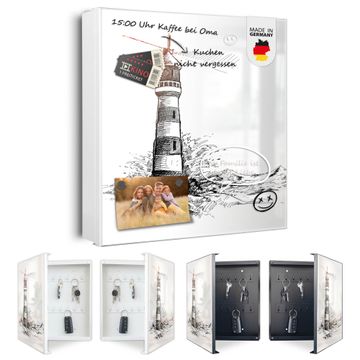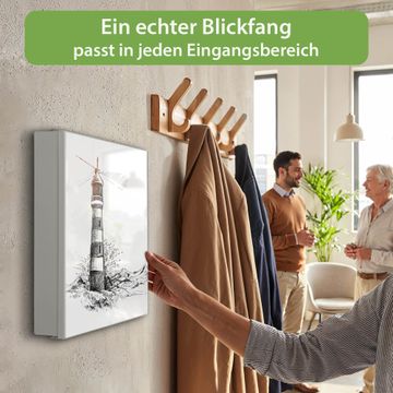 Bringe Ordnung und Eleganz in deinen Eingangsbereich mit dem banjado Schlüsselkasten Motiv Motiv Leuchtturm in der Brandung. Die moderne Schlüsselbox kombiniert funktionales Design mit hochwertiger Verarbeitung und wird so zu einem echten Hingucker in Flur, Büro oder Ferienwohnung. ✅ Stilvolle Schlüsselaufbewahrung mit Motiv Motiv Leuchtturm in der Brandung Der Design-Schlüsselkasten Motiv Motiv Leuchtturm in der Brandung bietet Platz für bis zu 32 Schlüssel, die auf 4 stabilen Reihen mit je 8 Haken übersichtlich verstaut werden. Mit seinen kompakten Maßen von 30 x 30 x 5 cm passt die Schlüsselbox perfekt auch in kleinere Räume. Der weiß lackierte Stahlkorpus mit links angeschlagenem Türscharnier harmoniert mit gedruckten Folie auf der Front und fügt sich nahtlos in jedes Wohnambiente ein. Ob als Schlüsselorganizer für Zuhause oder als praktische Lösung für Büros, Praxen und Gewerbe, der banjado Schlüsselkasten sorgt für Ordnung und Übersicht. Dank der magnetischen, mit Kreidestiften beschreibbaren Folie auf der Front kannst du Notizen anheften oder Termine direkt auf der Oberfläche festhalten. Die Schlüsselbox Motiv Motiv Leuchtturm in der Brandung zur Wandmontage wird inklusive Befestigungsmaterial geliefert und ist schnell angebracht. So hast du deine Schlüssel jederzeit griffbereit und zugleich stilvoll verstaut. Mit diesem banjado Schlüsselkasten Motiv Motiv Leuchtturm in der Brandung kombinierst du praktische Aufbewahrung mit stilvollem Wohndesign. Ob privat oder geschäftlich, die Schlüsselbox sorgt für mehr Ordnung, Übersicht und ein wohnliches Ambiente.Vorteile im Überblick