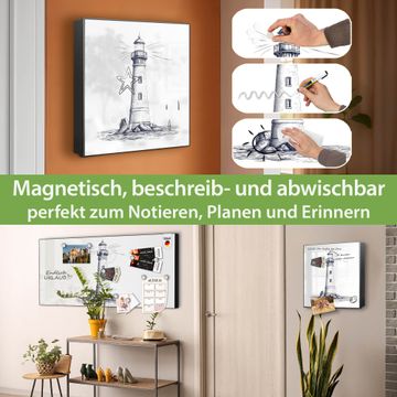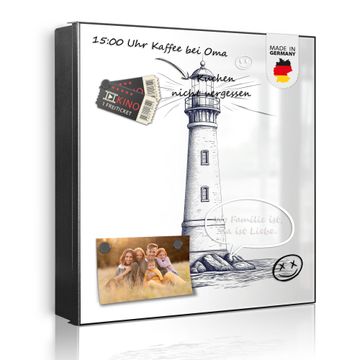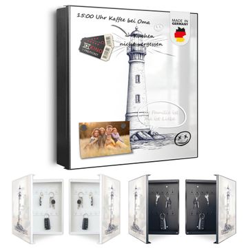 Bringe Ordnung und Eleganz in deinen Eingangsbereich mit dem banjado Schlüsselkasten Motiv Motiv Leuchtturm-Skizze. Die moderne Schlüsselbox kombiniert funktionales Design mit hochwertiger Verarbeitung und wird so zu einem echten Hingucker in Flur, Büro oder Ferienwohnung. ✅ Stilvolle Schlüsselaufbewahrung mit Motiv Motiv Leuchtturm-Skizze Der Design-Schlüsselkasten Motiv Motiv Leuchtturm-Skizze bietet Platz für bis zu 32 Schlüssel, die auf 4 stabilen Reihen mit je 8 Haken übersichtlich verstaut werden. Mit seinen kompakten Maßen von 30 x 30 x 5 cm passt die Schlüsselbox perfekt auch in kleinere Räume. Der schwarz lackierte Stahlkorpus mit links angeschlagenem Türscharnier harmoniert mit gedruckten Folie auf der Front und fügt sich nahtlos in jedes Wohnambiente ein. Ob als Schlüsselorganizer für Zuhause oder als praktische Lösung für Büros, Praxen und Gewerbe, der banjado Schlüsselkasten sorgt für Ordnung und Übersicht. Dank der magnetischen, mit Kreidestiften beschreibbaren Folie auf der Front kannst du Notizen anheften oder Termine direkt auf der Oberfläche festhalten. Die Schlüsselbox Motiv Motiv Leuchtturm-Skizze zur Wandmontage wird inklusive Befestigungsmaterial geliefert und ist schnell angebracht. So hast du deine Schlüssel jederzeit griffbereit und zugleich stilvoll verstaut. Mit diesem banjado Schlüsselkasten Motiv Motiv Leuchtturm-Skizze kombinierst du praktische Aufbewahrung mit stilvollem Wohndesign. Ob privat oder geschäftlich, die Schlüsselbox sorgt für mehr Ordnung, Übersicht und ein wohnliches Ambiente.Vorteile im Überblick