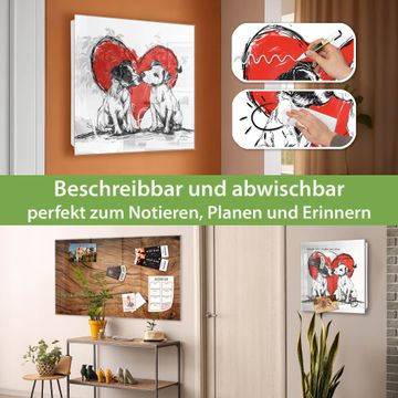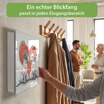 Bringe Ordnung und Eleganz in deinen Eingangsbereich mit dem banjado Schlüsselkasten Motiv Motiv Liebende Hunde. Die moderne Schlüsselbox kombiniert funktionales Design mit hochwertiger Verarbeitung und wird so zu einem echten Hingucker in Flur, Büro oder Ferienwohnung. ✅ Stilvolle Schlüsselaufbewahrung mit Glasfront im Motiv Motiv Liebende Hunde Der Design-Schlüsselkasten Motiv Motiv Liebende Hunde bietet Platz für bis zu 50 Schlüssel, die auf 5 stabilen Reihen mit je 10 Haken übersichtlich verstaut werden. Mit seinen kompakten Maßen von 30 x 30 x 5 cm passt die Schlüsselbox perfekt auch in kleinere Räume. Der weiß lackierte Stahlkorpus mit rechts angeschlagenem Türscharnier harmoniert mit der Glasfront und fügt sich nahtlos in jedes Wohnambiente ein. Ob als Schlüsselorganizer für Zuhause oder als praktische Lösung für Büros, Praxen und Gewerbe, der banjado Schlüsselkasten sorgt für Ordnung und Übersicht. Dank der magnetischen, mit Kreidestiften beschreibbaren Glasfront kannst du Notizen anheften oder Termine direkt auf der Oberfläche festhalten. Die Schlüsselbox Motiv Motiv Liebende Hunde zur Wandmontage wird inklusive Befestigungsmaterial geliefert und ist schnell angebracht. So hast du deine Schlüssel jederzeit griffbereit und zugleich stilvoll verstaut. Mit diesem banjado Schlüsselkasten Motiv Motiv Liebende Hunde kombinierst du praktische Aufbewahrung mit stilvollem Wohndesign. Ob privat oder geschäftlich, die Schlüsselbox sorgt für mehr Ordnung, Übersicht und ein wohnliches Ambiente.Vorteile im Überblick