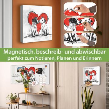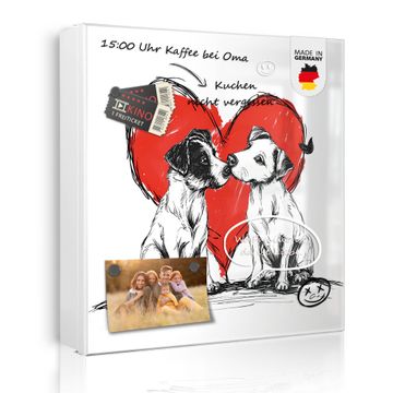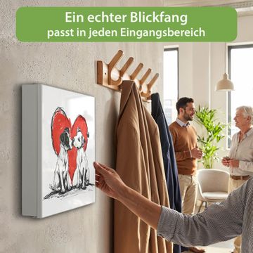 Bringe Ordnung und Eleganz in deinen Eingangsbereich mit dem banjado Schlüsselkasten Motiv Motiv Liebende Hunde. Die moderne Schlüsselbox kombiniert funktionales Design mit hochwertiger Verarbeitung und wird so zu einem echten Hingucker in Flur, Büro oder Ferienwohnung. ✅ Stilvolle Schlüsselaufbewahrung mit Motiv Motiv Liebende Hunde Der Design-Schlüsselkasten Motiv Motiv Liebende Hunde bietet Platz für bis zu 32 Schlüssel, die auf 4 stabilen Reihen mit je 8 Haken übersichtlich verstaut werden. Mit seinen kompakten Maßen von 30 x 30 x 5 cm passt die Schlüsselbox perfekt auch in kleinere Räume. Der weiß lackierte Stahlkorpus mit links angeschlagenem Türscharnier harmoniert mit gedruckten Folie auf der Front und fügt sich nahtlos in jedes Wohnambiente ein. Ob als Schlüsselorganizer für Zuhause oder als praktische Lösung für Büros, Praxen und Gewerbe, der banjado Schlüsselkasten sorgt für Ordnung und Übersicht. Dank der magnetischen, mit Kreidestiften beschreibbaren Folie auf der Front kannst du Notizen anheften oder Termine direkt auf der Oberfläche festhalten. Die Schlüsselbox Motiv Motiv Liebende Hunde zur Wandmontage wird inklusive Befestigungsmaterial geliefert und ist schnell angebracht. So hast du deine Schlüssel jederzeit griffbereit und zugleich stilvoll verstaut. Mit diesem banjado Schlüsselkasten Motiv Motiv Liebende Hunde kombinierst du praktische Aufbewahrung mit stilvollem Wohndesign. Ob privat oder geschäftlich, die Schlüsselbox sorgt für mehr Ordnung, Übersicht und ein wohnliches Ambiente.Vorteile im Überblick